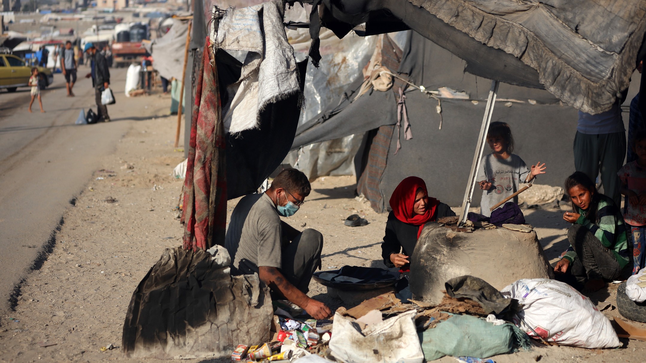 A displaced Palestinian man sleeps with his son outside his tent on the beach in Deir al-Balah, central Gaza Strip, on June 24, 2024, photo by majdi fathi .....Displaced Palestinians bake bread in Deir el-Balah, in the central Gaza Strip photo by majdi fathi .... Displaced Palestinians are seen on the beach