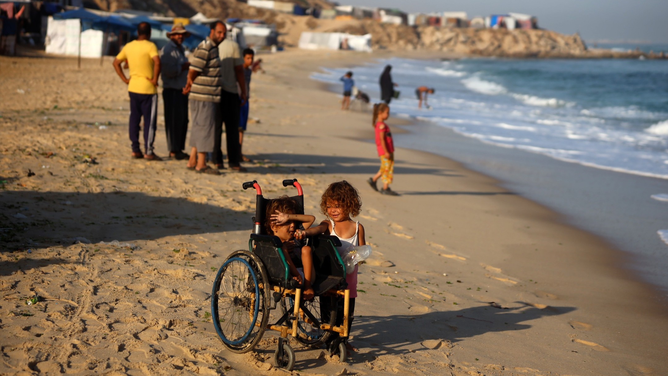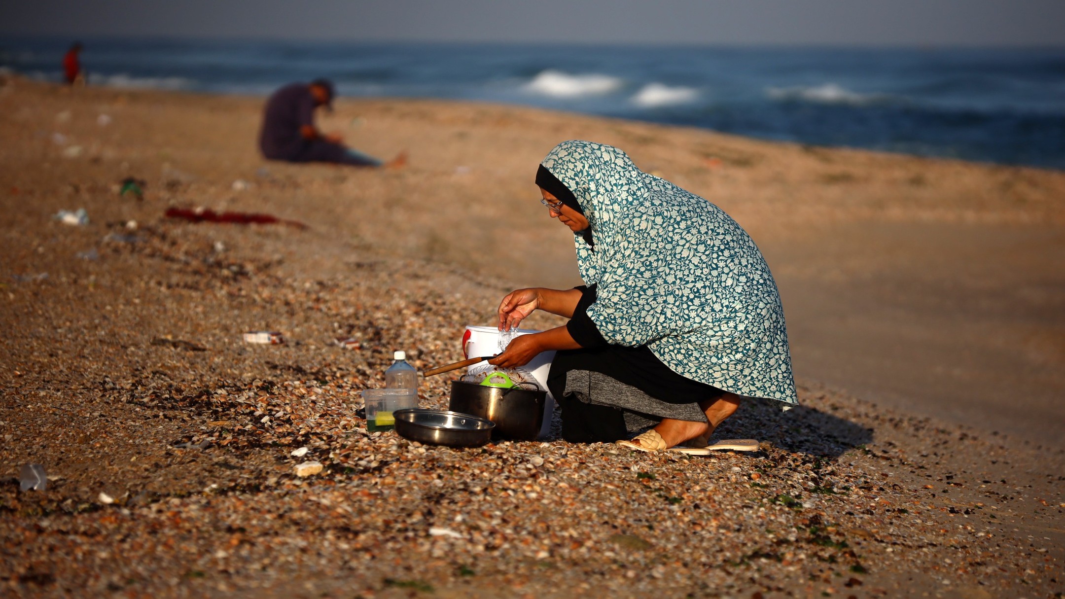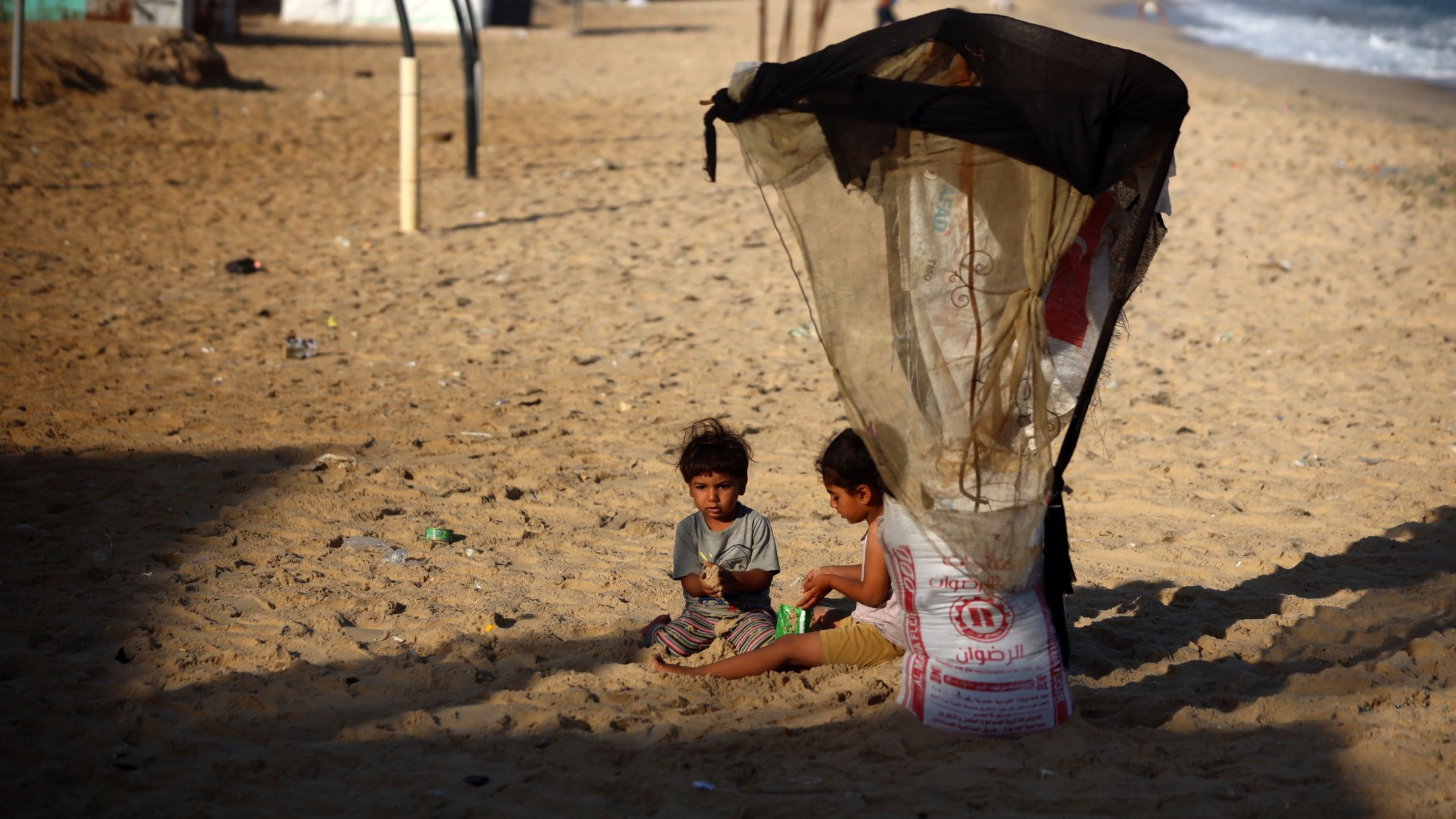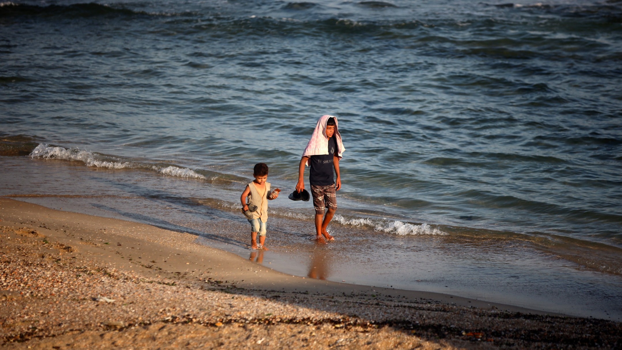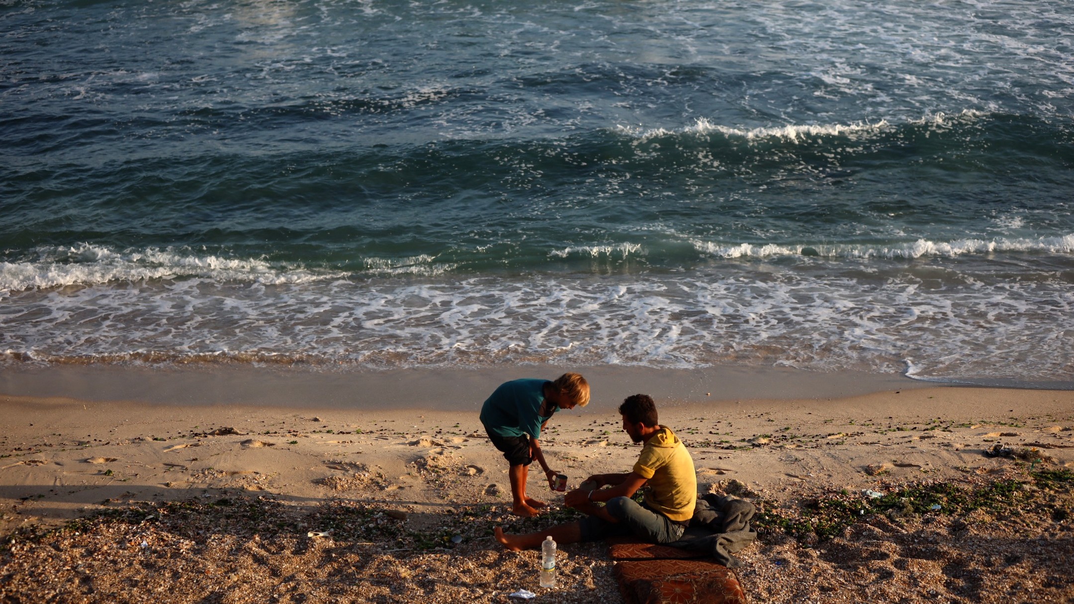 Displaced Palestinians are seen on the beach photo by majdi fathi