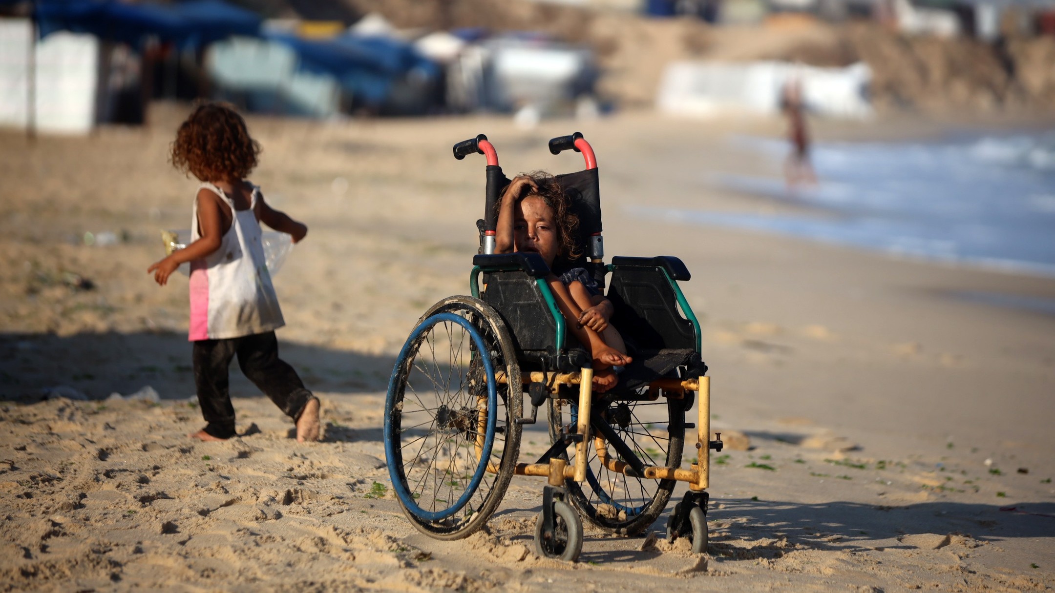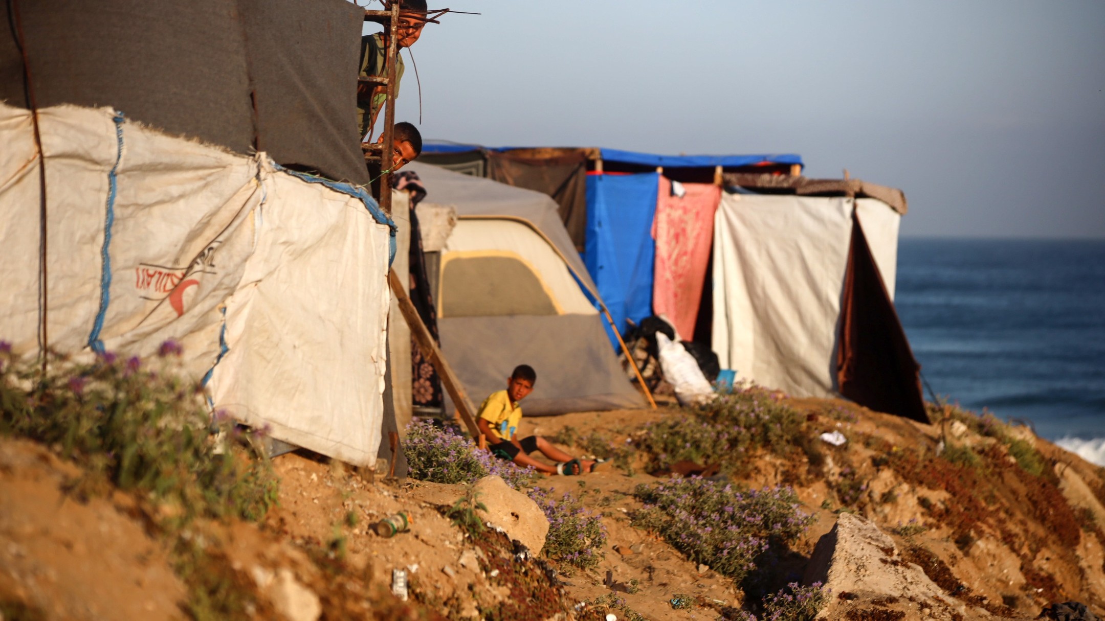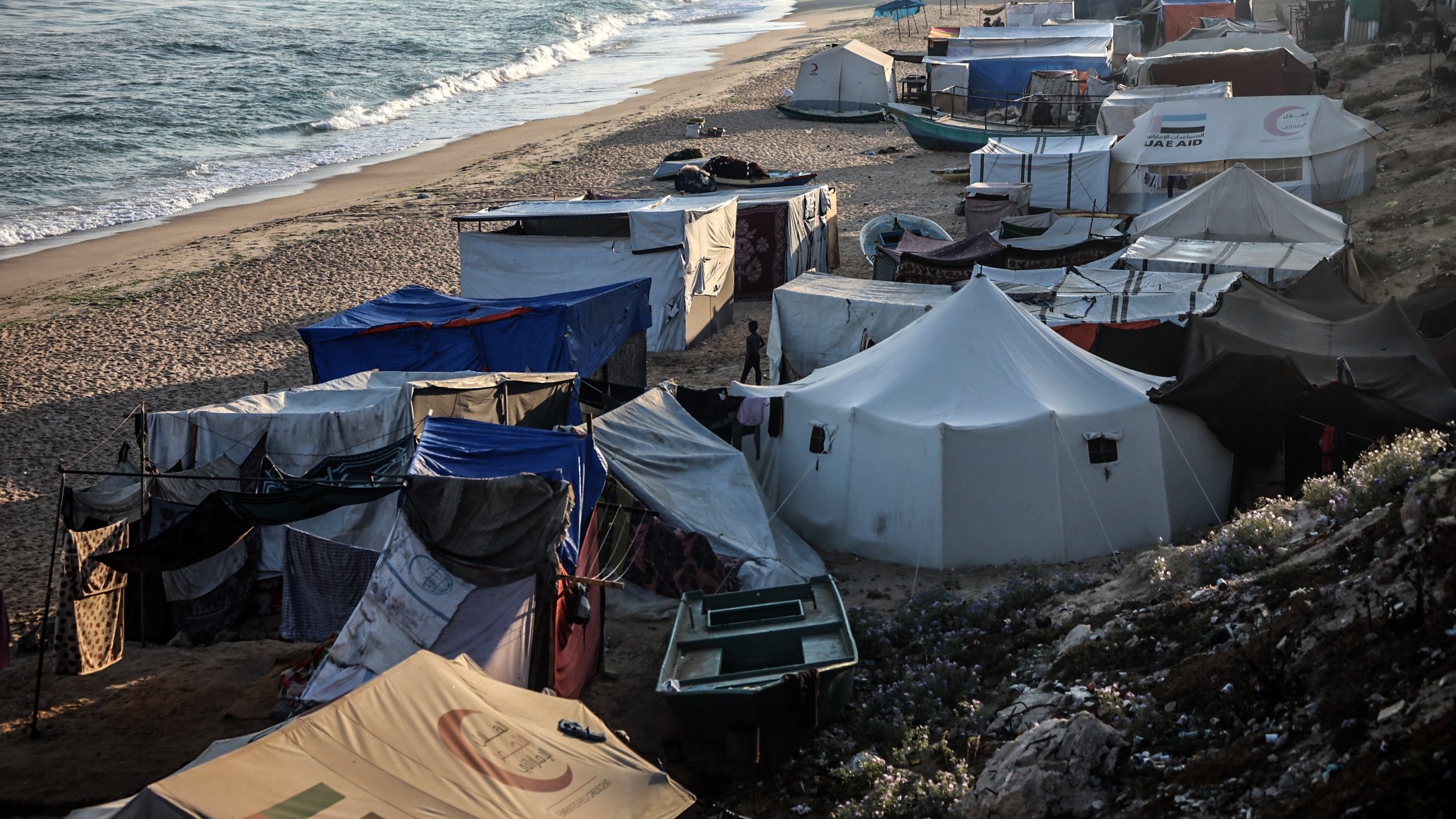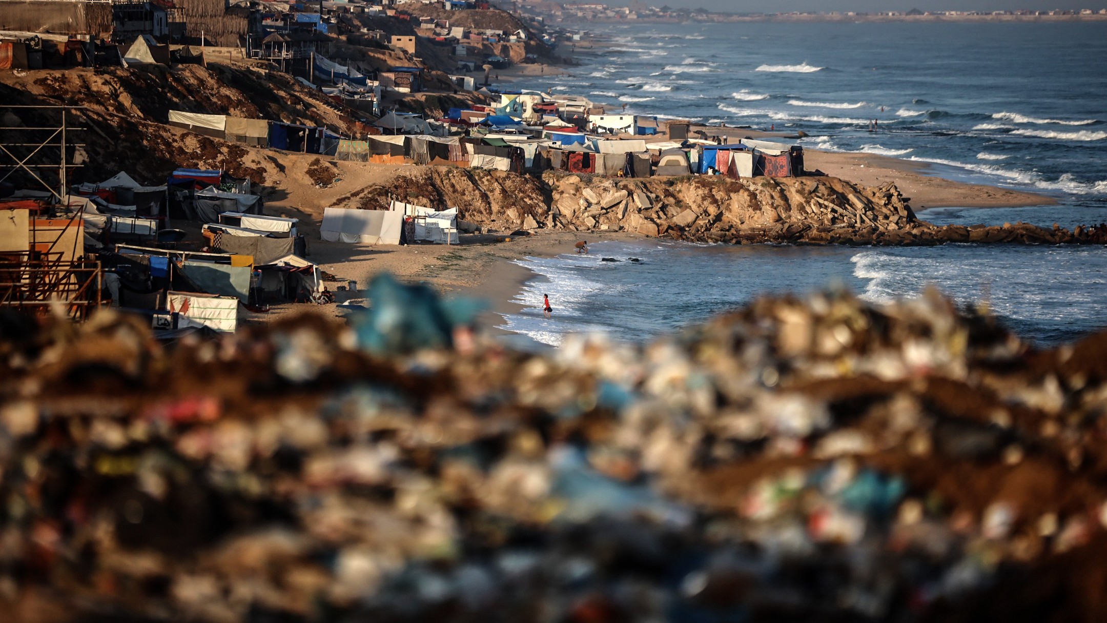 Displaced Palestinians are seen on the beach photo by majdi fathi