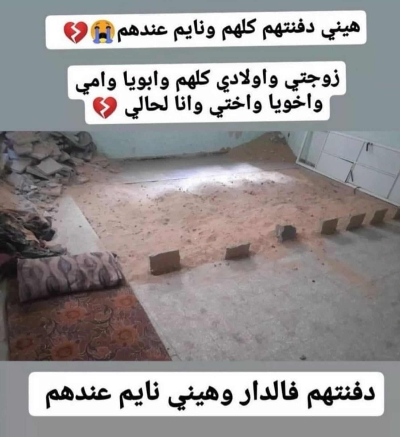 Mohammed buried his family—his siblings, mother, father, wife, and children—inside the house because there is no safe place, and he cannot go outside due to the shelling and destruction. He buried all his family members in one room and sleeps beside them. This is happening in Gaza; it is a genocide that Israel is using against the defenseless people in Gaza. محمد دفن أهله، أخواته، أمه، والده، زوجته، وأطفاله في البيت لأنه ليس هناك مكان آمن ولا يستطيع الخروج بسبب القصف والدمار. فدفن جميع أفراد عائلته في غرفة وينام بجانبهم. هذا كله يحصل في غزة، هذه حرب الإبادة الجماعية التي تستخدمها إسرائيل ضد الناس العزل في غزة. #gazagenocide #gazaunderattack