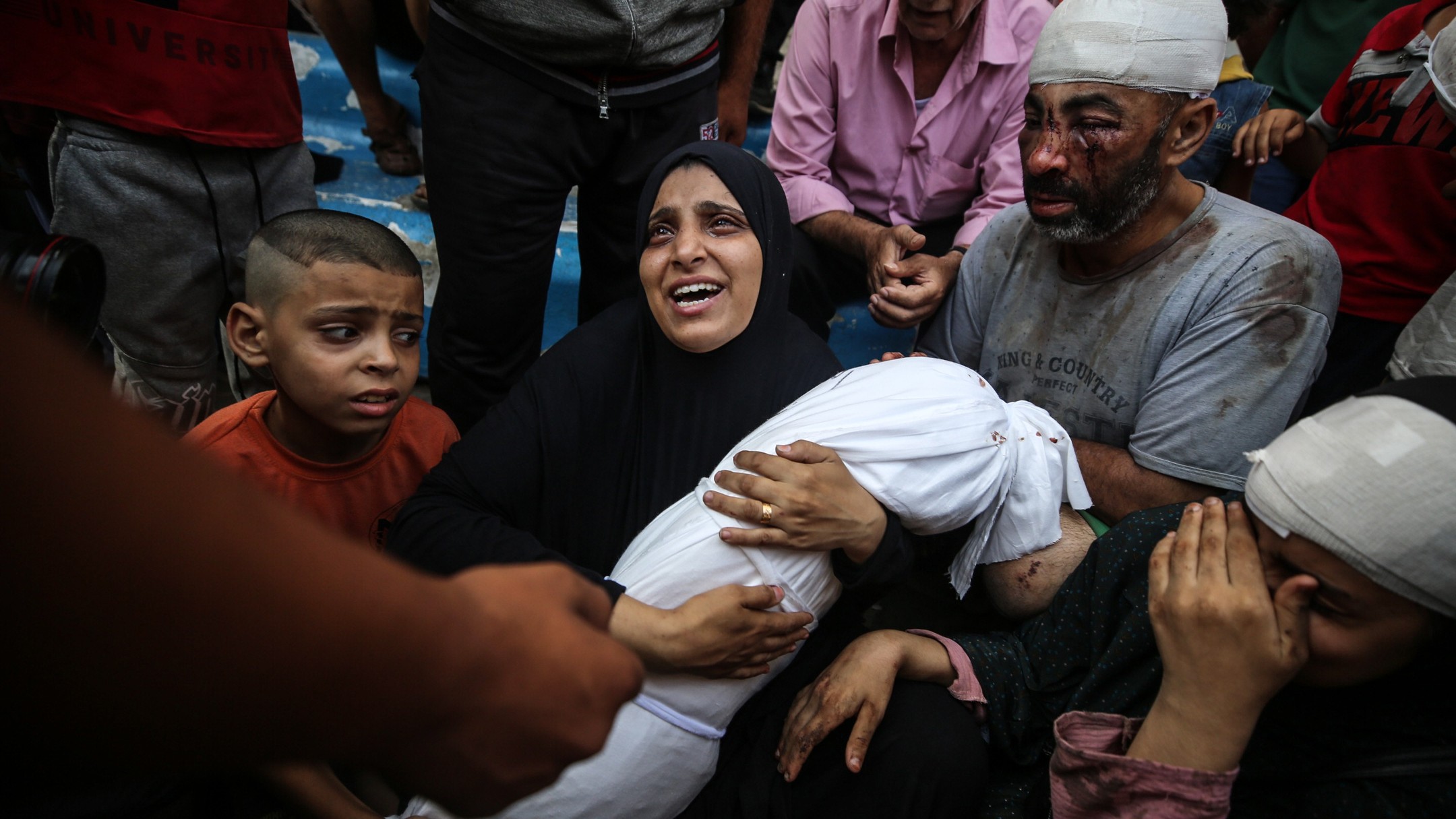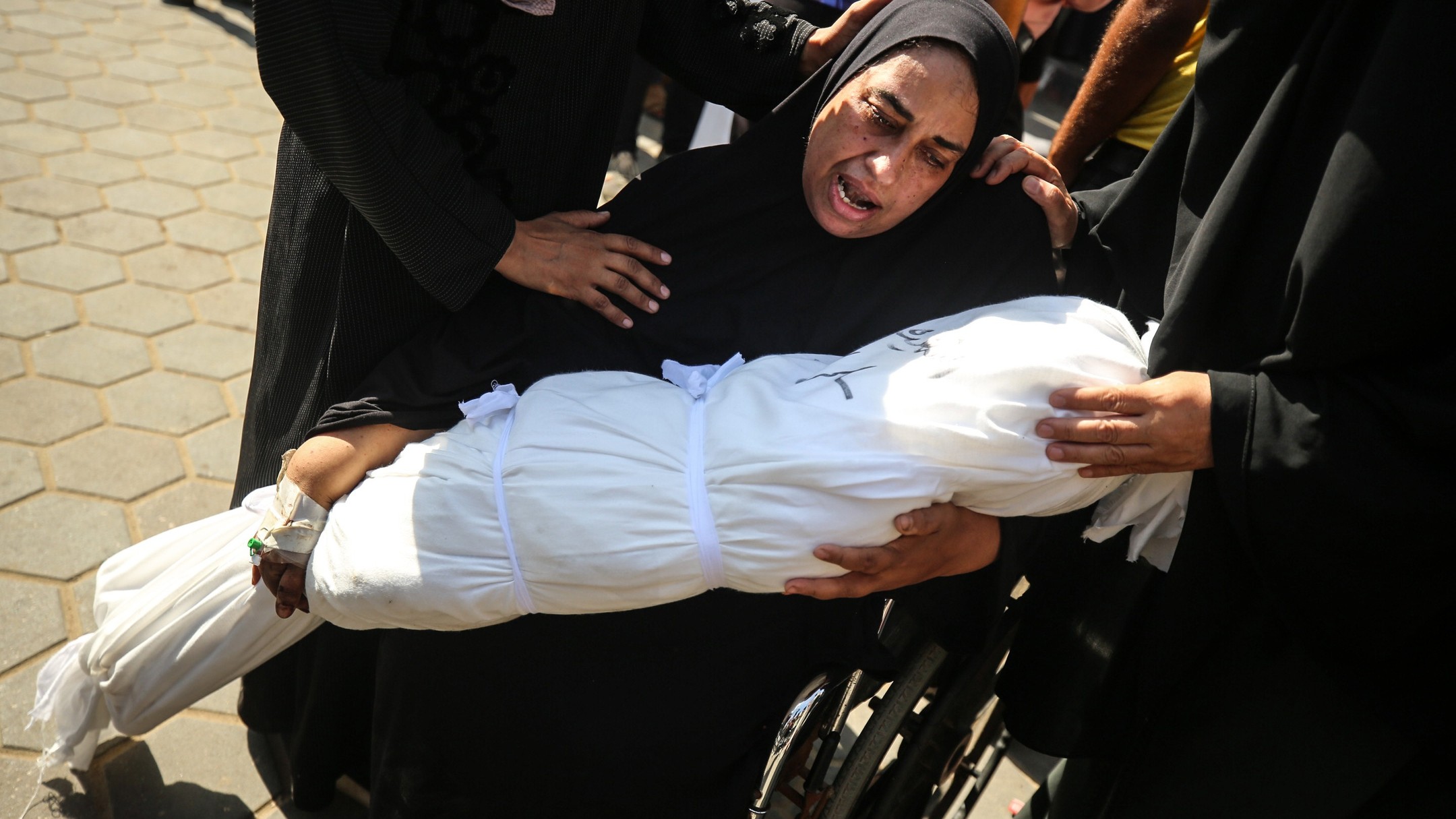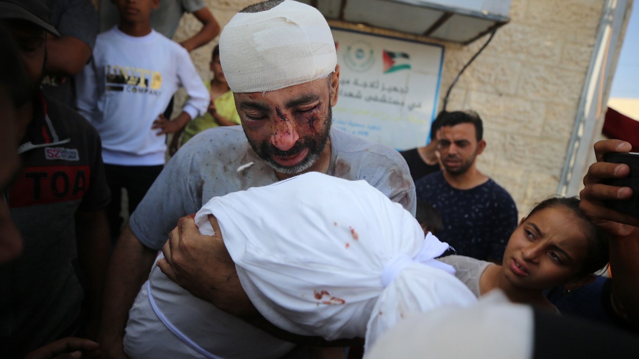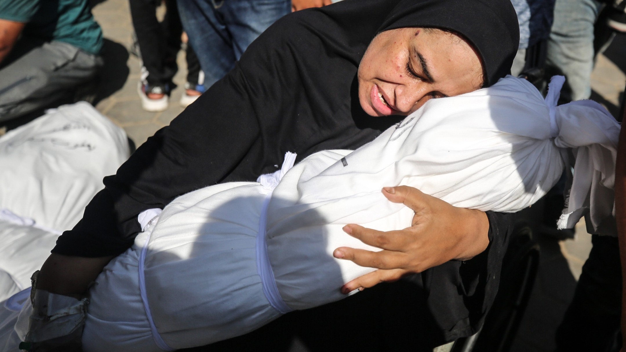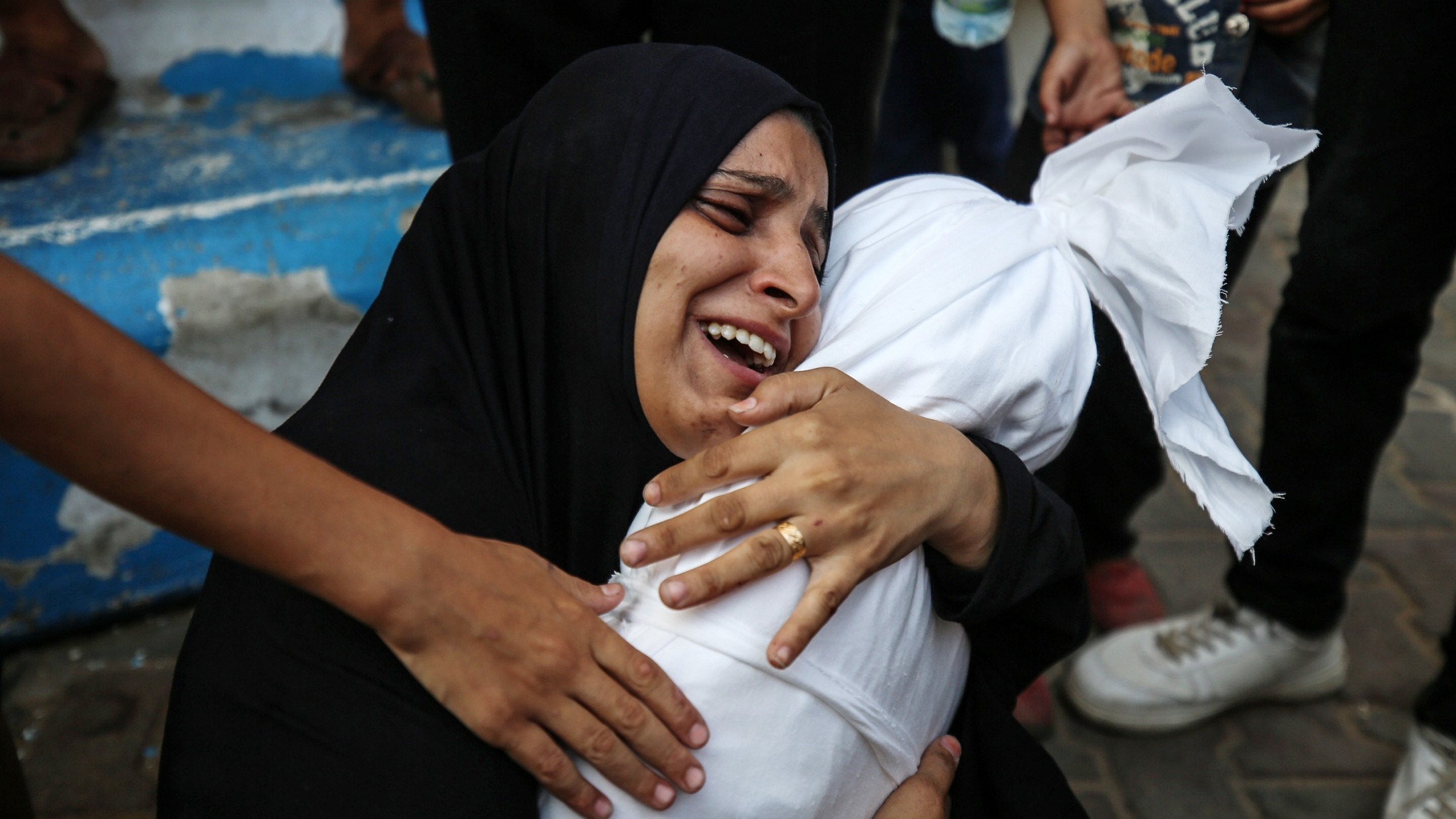 A grieving Palestinian mother cradles her little daughter, who was killed in an Israeli airstrike on their family home in the Maghazi refugee camp last night.