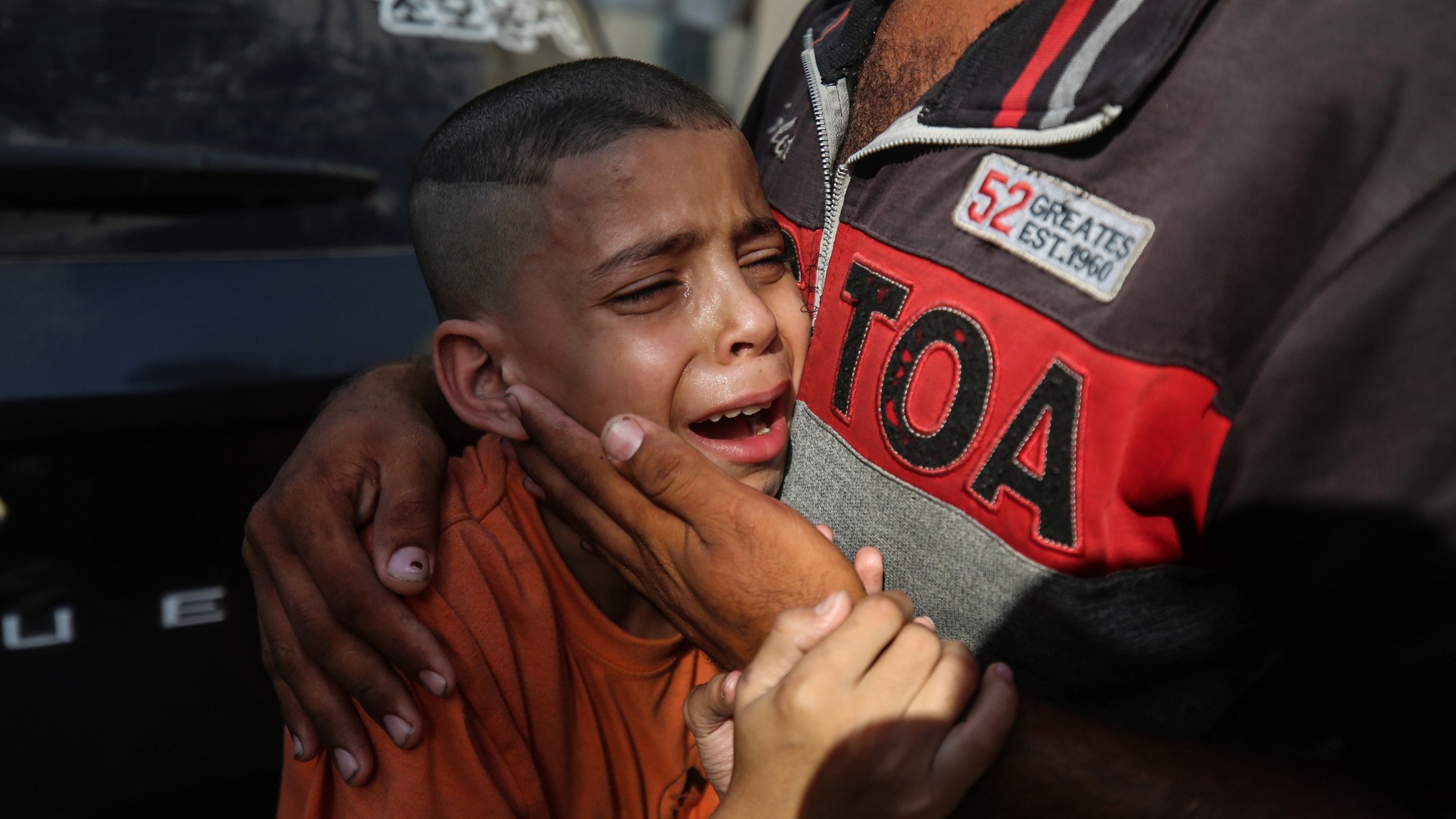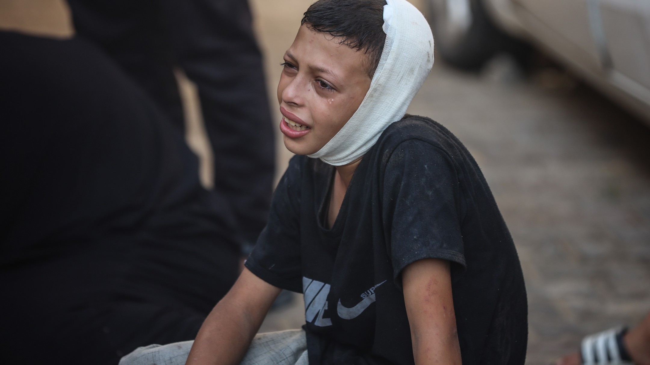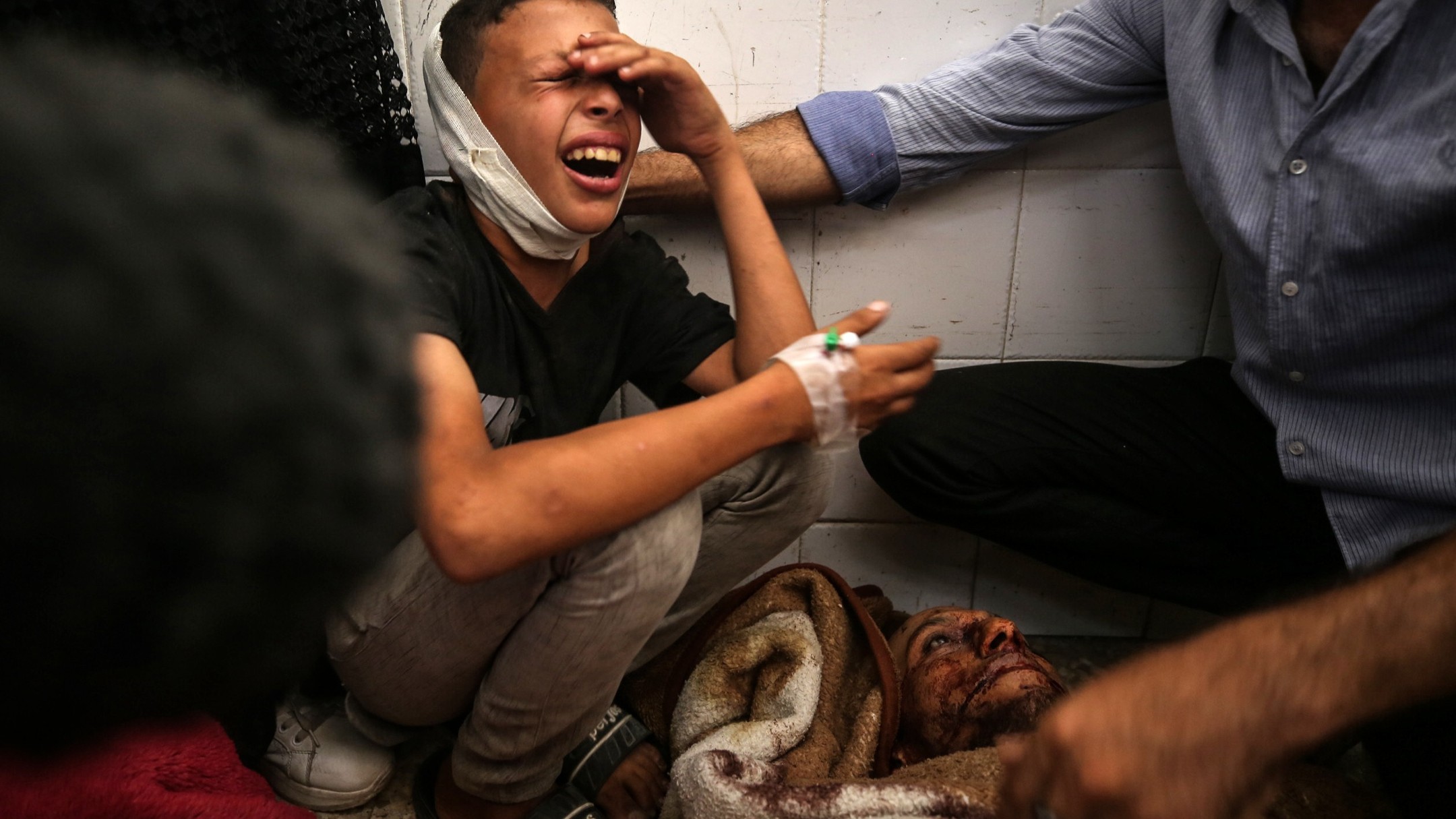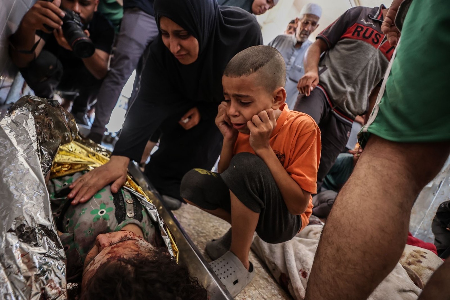 9-year-old Ibrahim (R), who lost his 4-year-old sister Xena due to Israeli attacks on Maghazi refugee camp, mourn at Al-aqsa Martyrs Hospital in Deir al-Balah, Gaza on June 25, 2024. (Photo by Ali Jadallah/Anadolu via Getty Images)