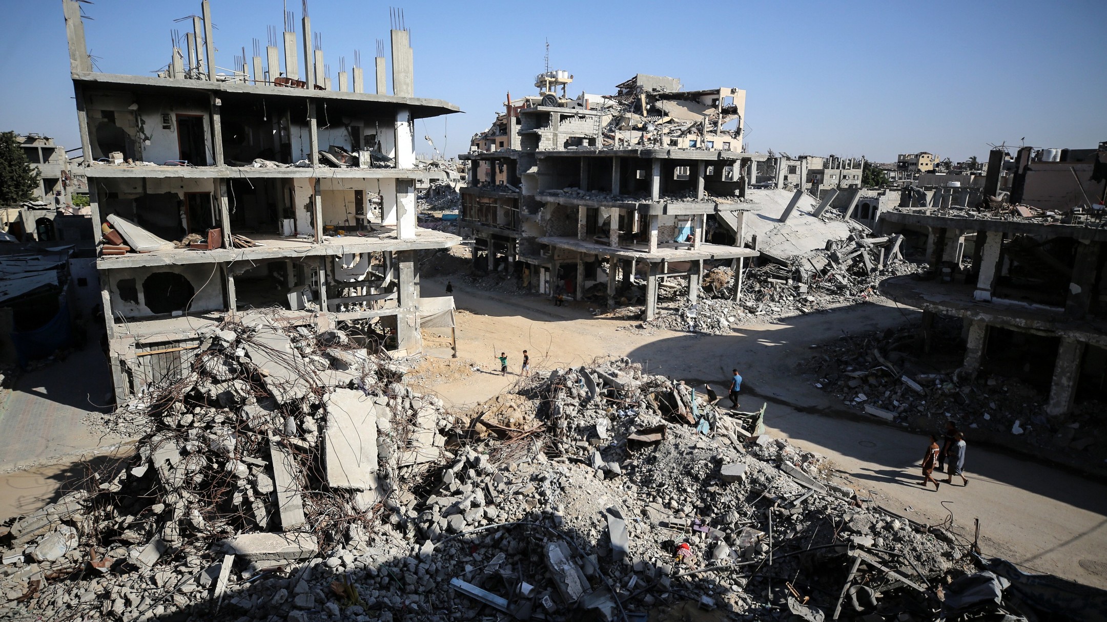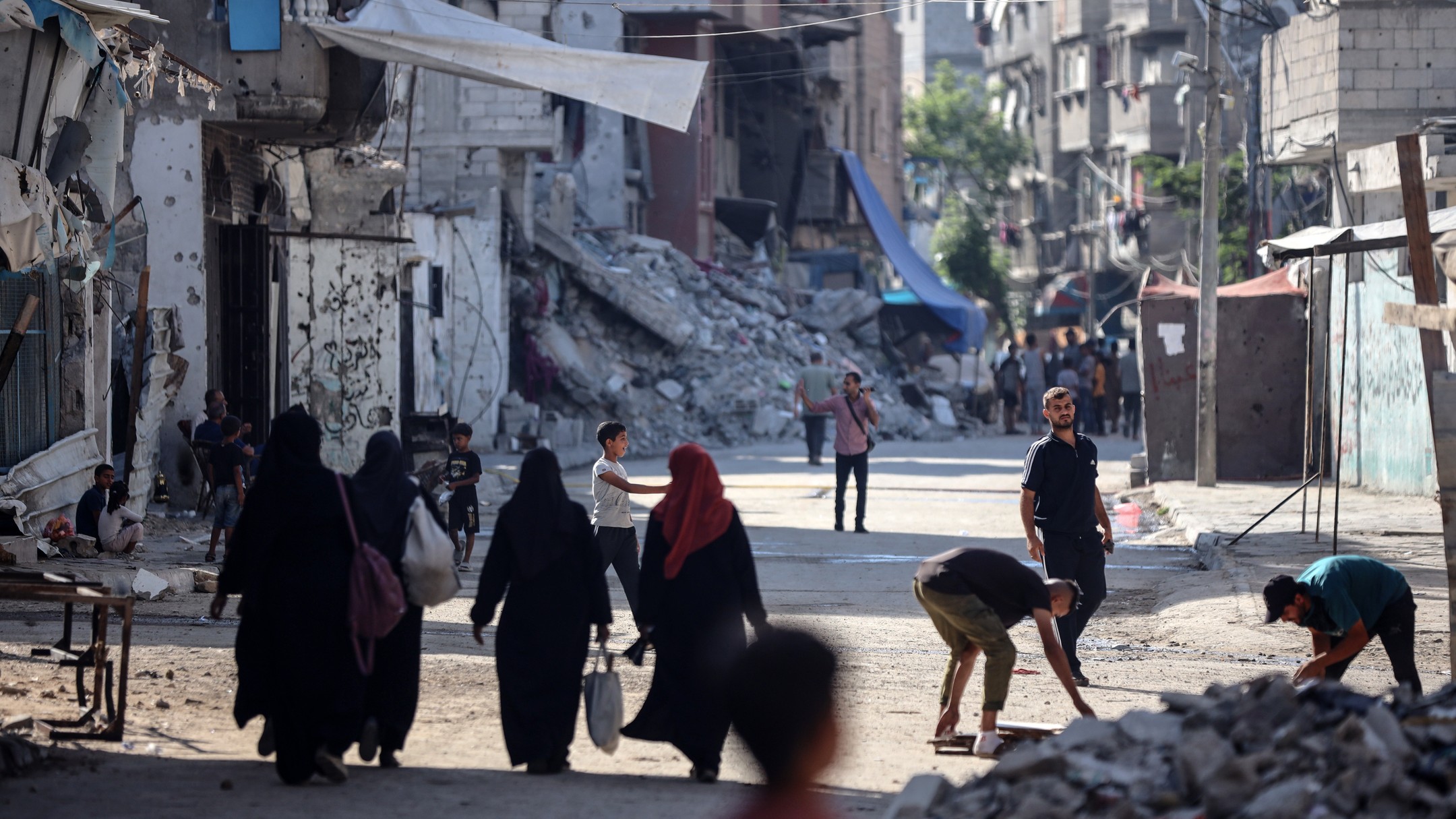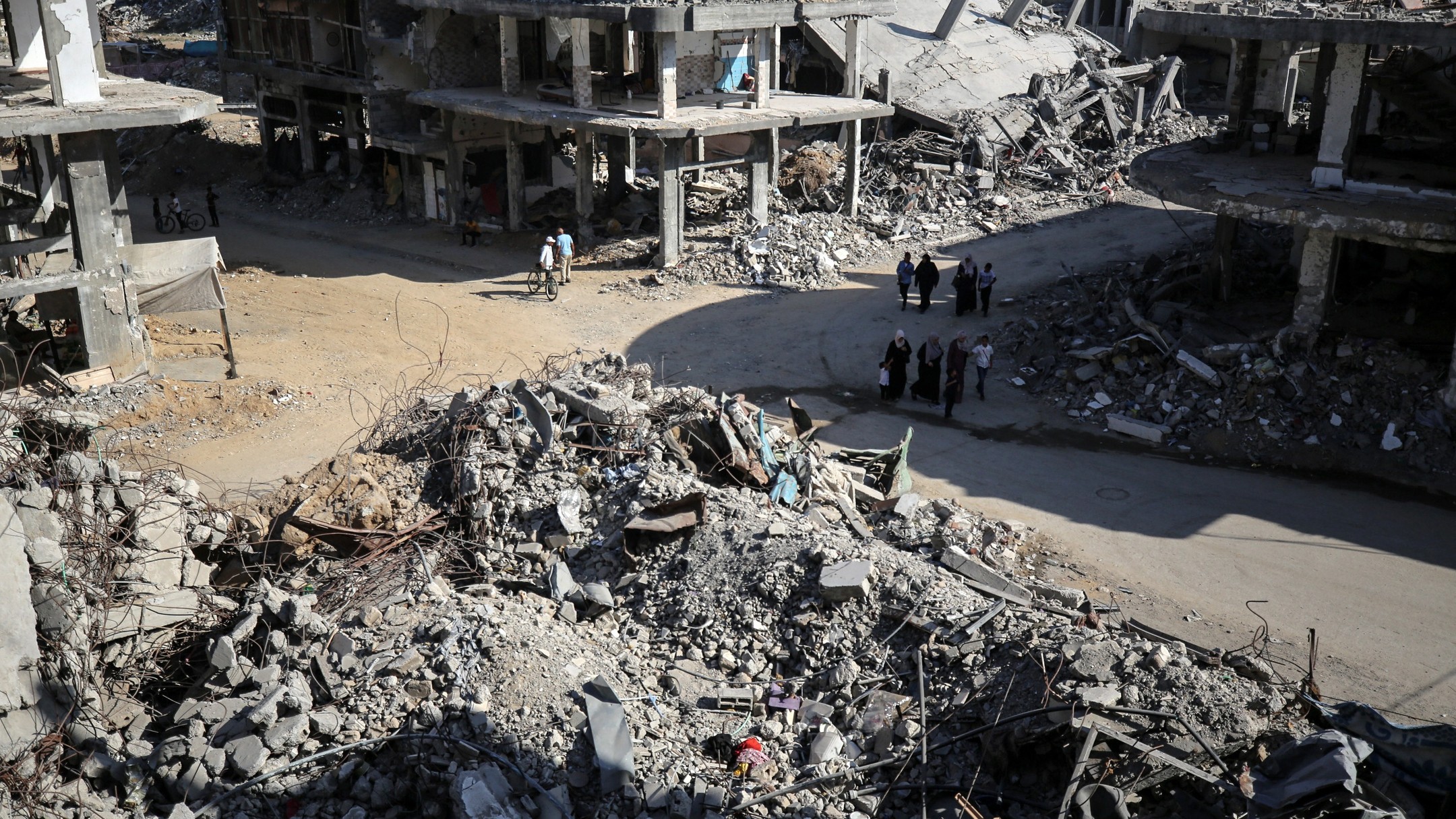 People walk along a road between the rubble of buildings destroyed during Israeli bombardment in Bureij camp in the central Gaza Strip, on June 24, 2024, photo by majdi fathi