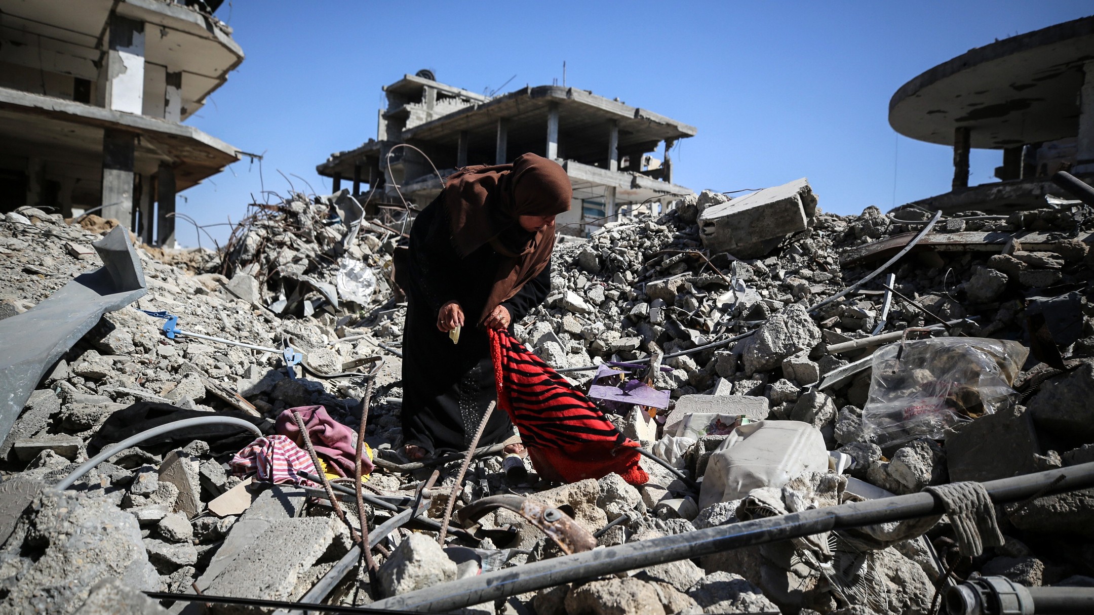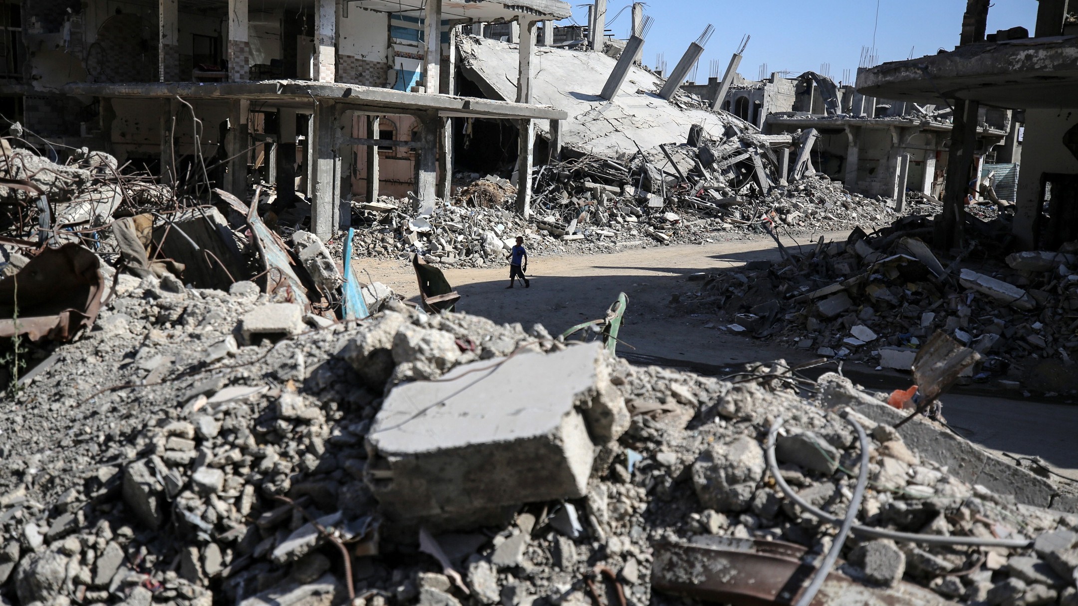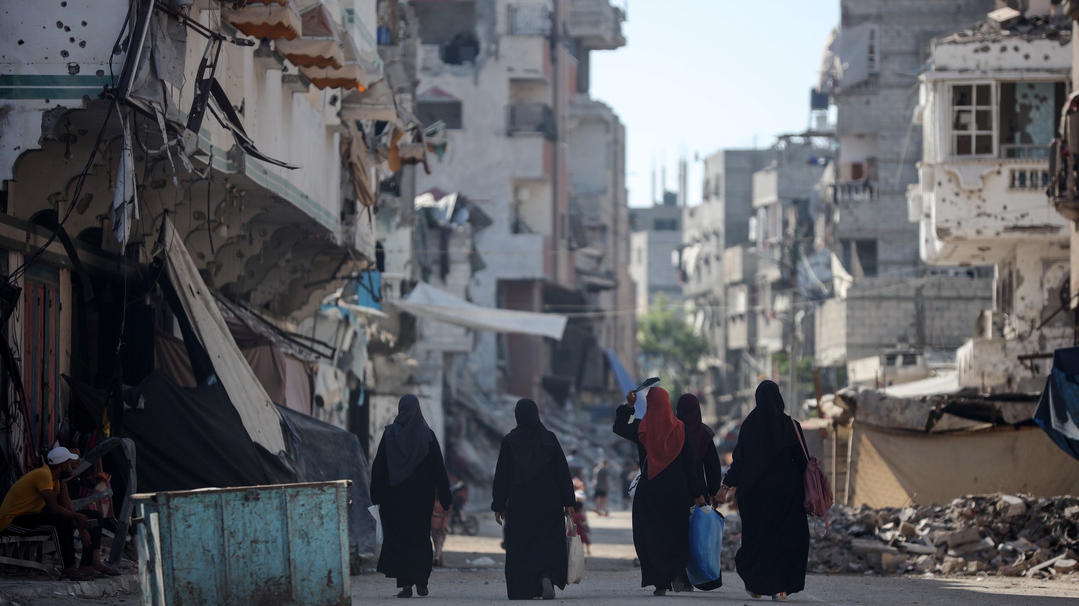 People walk along a road between the rubble of buildings destroyed during Israeli bombardment in Bureij camp in the central Gaza Strip, on June 24, 2024, photo by majdi fathi