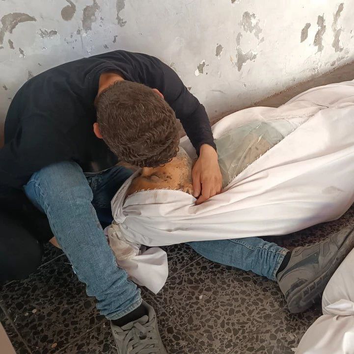 “My dear mother, oh Hanin.” A mother bids farewell to her daughter, Haneen Nasr, after she and a number of her family were martyred in a bombing by occupation aircraft on their home in the Maghazi camp in the central Gaza Strip. "حبيبتي يمّا .. يا حنين".. أم تودع طفلتها حنين نصر بعد استشهادها وعدد من عائلتها في قصف من طائرات الاحتلال على منزلهم في مخيم المغازي وسط قطاع غزة.