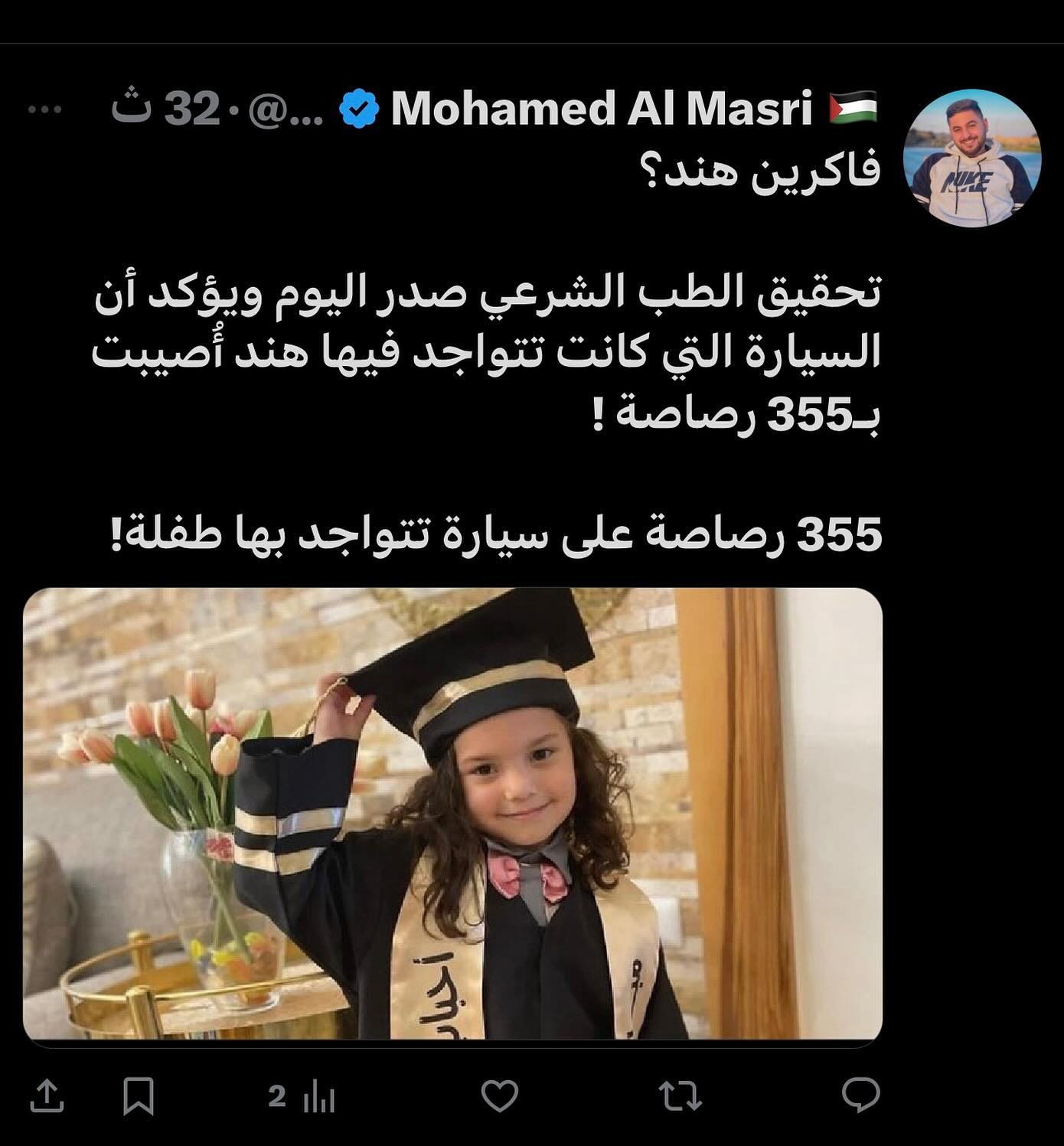 Do you remember Hind? The forensic investigation was released today and confirms that the car Hind was in was hit by 355 bullets! 355 bullets on the car with a child in it!