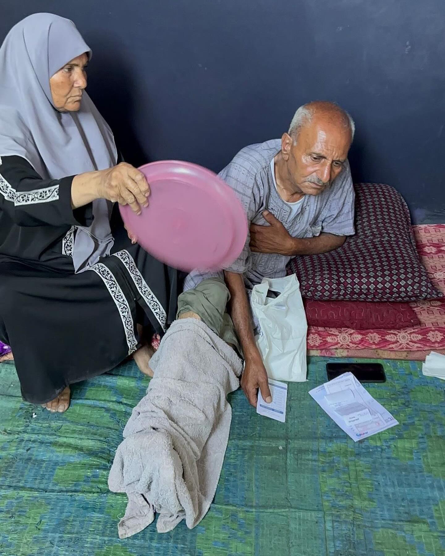 Mohammed Abu Ouda, a cancer patient, is unable to access treatment as the cancer center was destroyed by Israeli occupation forces. He now spends his days in a filthy classroom at a shelter without proper care, food, or medical attention. His elderly wife tries to comfort him by fanning him, but his weakened body struggles to endure the heat, pain, and lack of food.