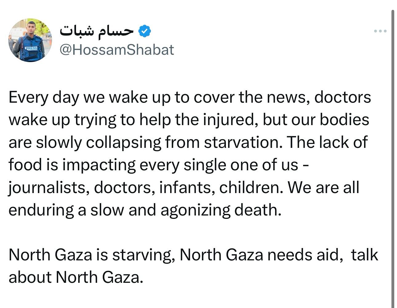 Every day we wake up to cover the news, doctors wake up trying to help the injured, but our bodies are slowly collapsing from starvation. The lack of food is impacting every single one of us - journalists, doctors, infants, children. We are all enduring a slow and agonizing death. North Gaza is starving, North Gaza needs aid, talk about North Gaza.