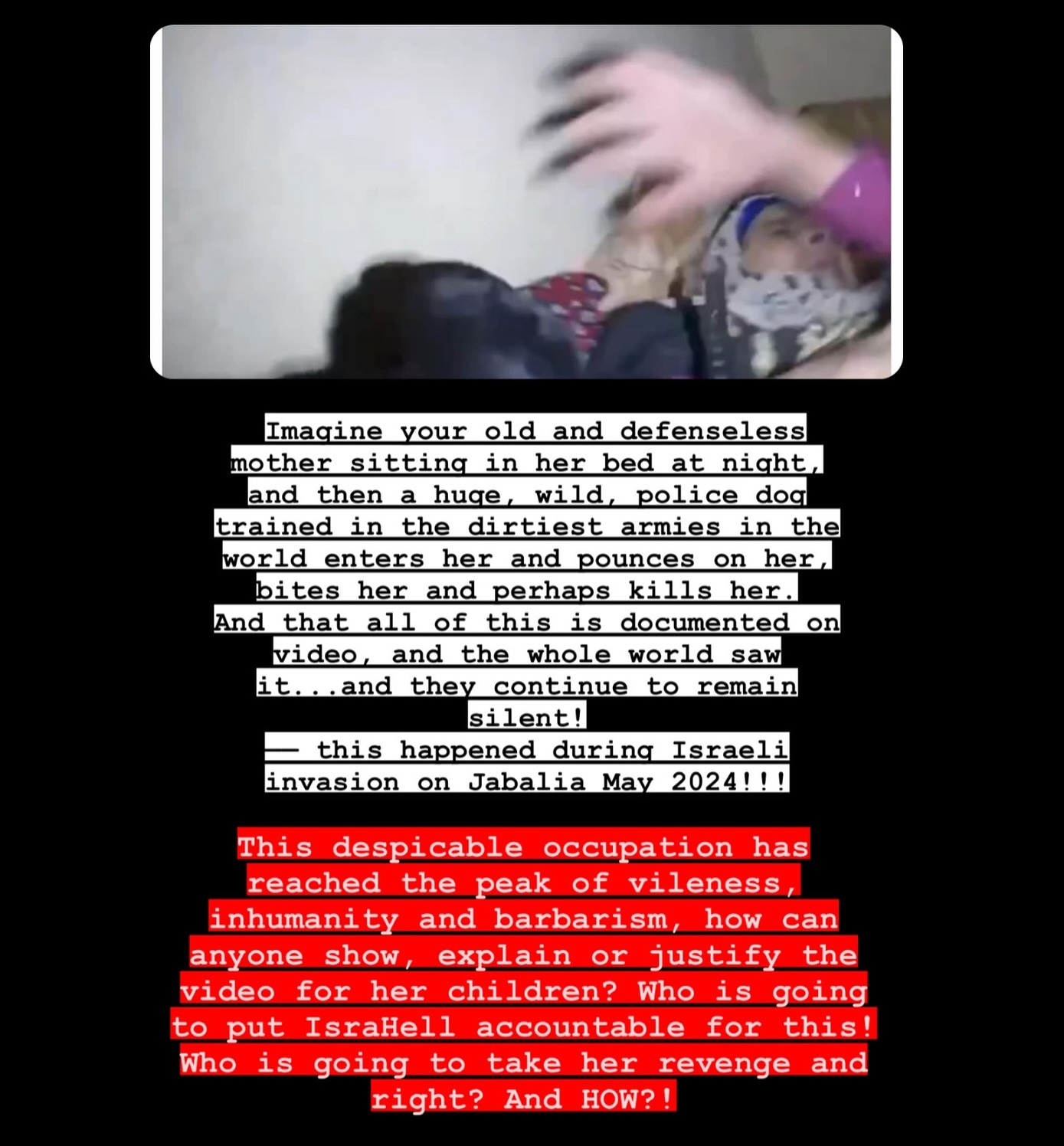 In footage published by Al-Jazeera, recorded from a camera mounted on an Israeli forces’ dog, showing the occupation forces releasing the dog inside a residential house in Jabalia refugee camp. The dog attacked an elderly Palestinian woman while she was sleeping, severely injuring her. من كاميرا مركبة على كلب بوليسي للاحتلال تُظهر اعتداء الكلب على سيدة مسنة داخل بيتها في جباليا شمال قطاع غزة