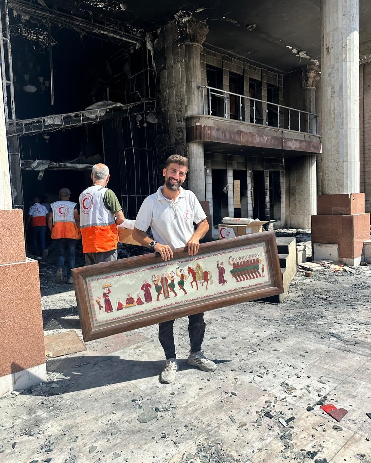 هذه اللوحة المميزة نجت من القصف والنيران التي احرقت مبنى مستشفى القدس برايكم ماذا تمثل ؟ تعرف على تفسيرها في الستوري ⬆️ This special painting survived the bombing and fire that burned AlQuds Hospital building, what do you think it represents? Know its interpretation in the story ⬆️