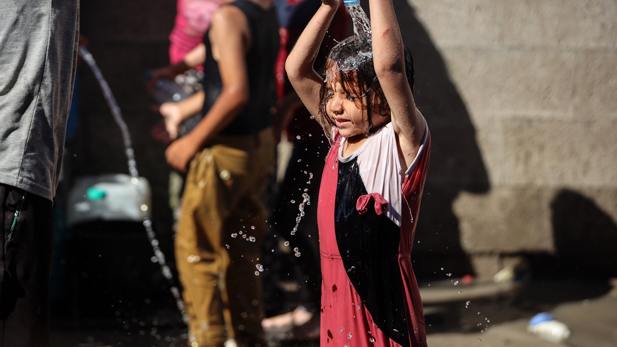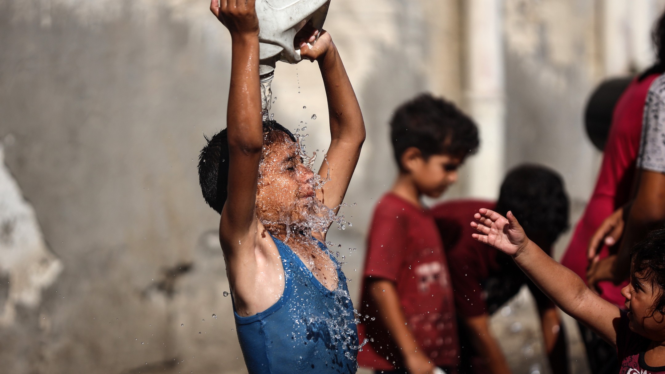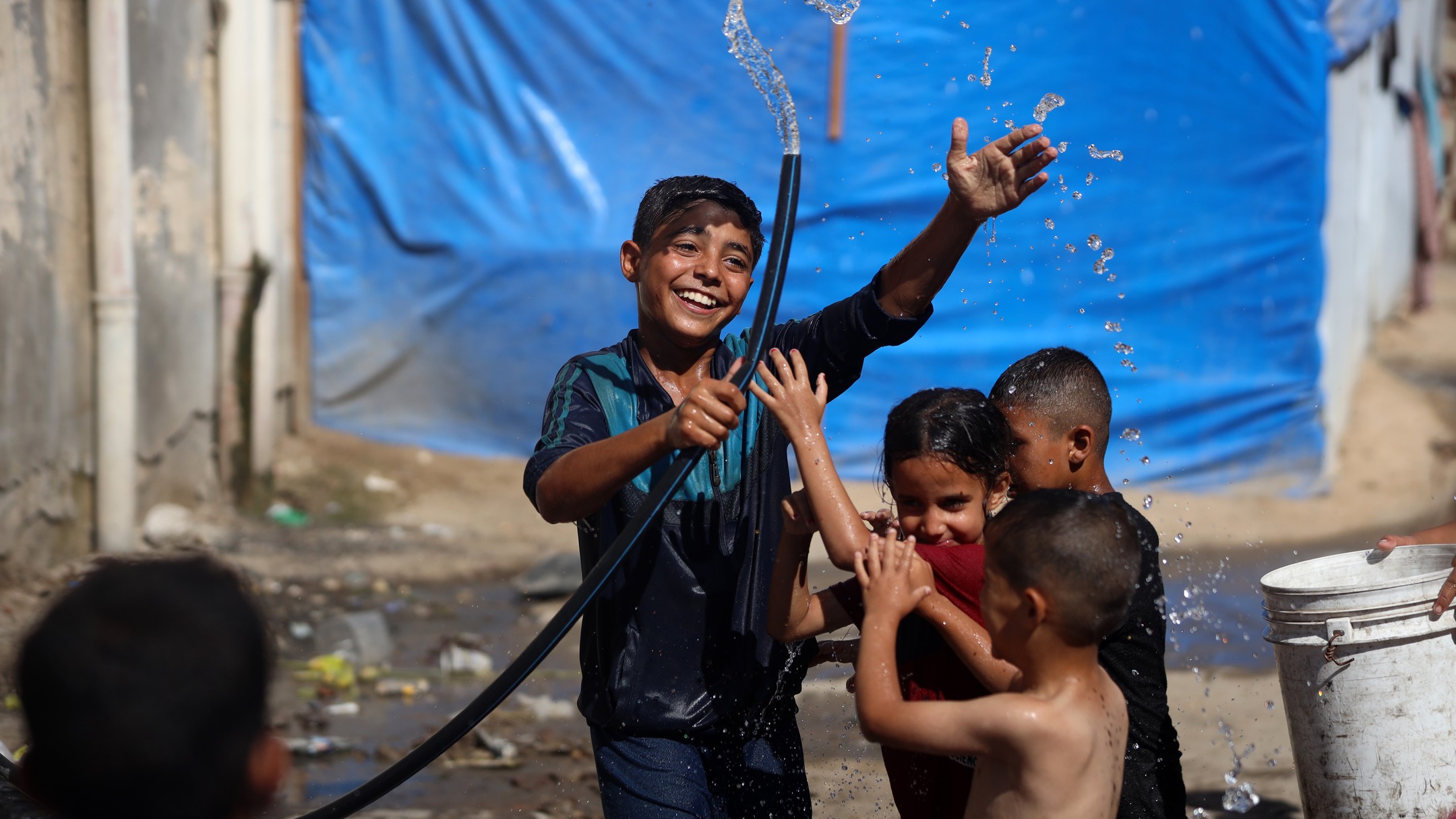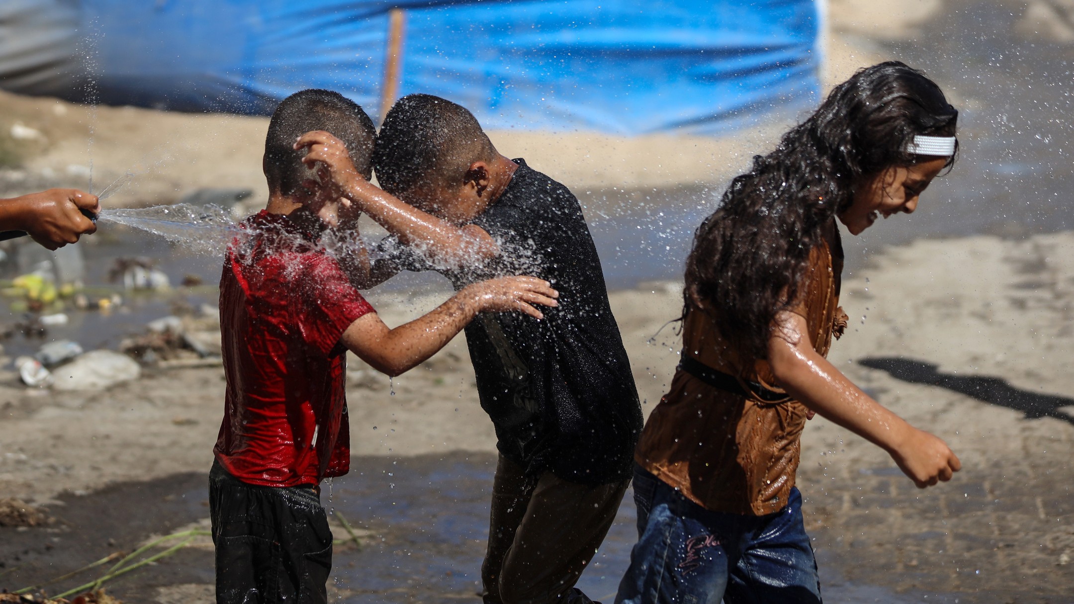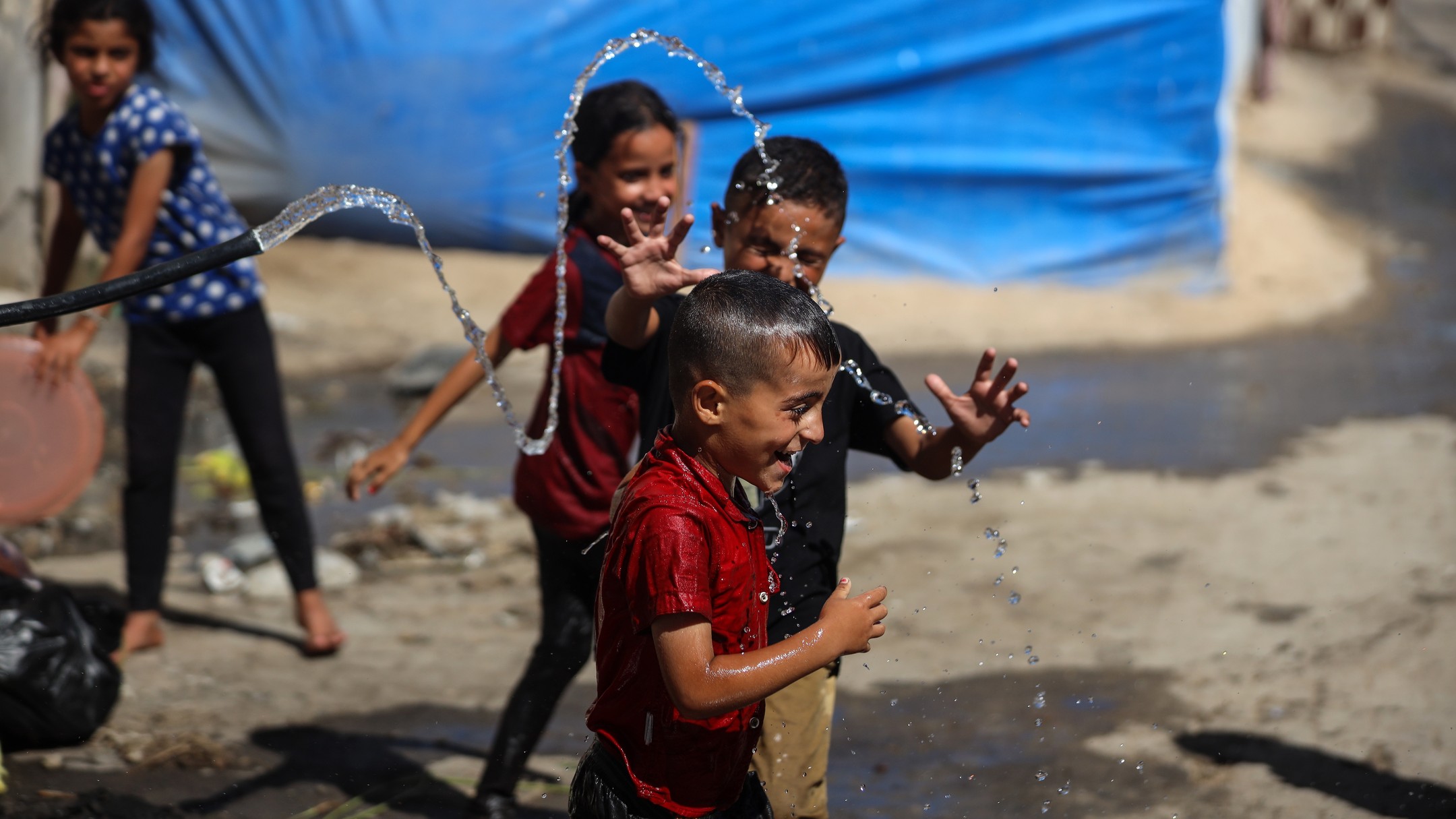 Displaced Palestinian children play with water outside their tents during a heat wave in Deir al-Balah in the central Gaza Strip on July 3, 2024. photo by majdi fathi