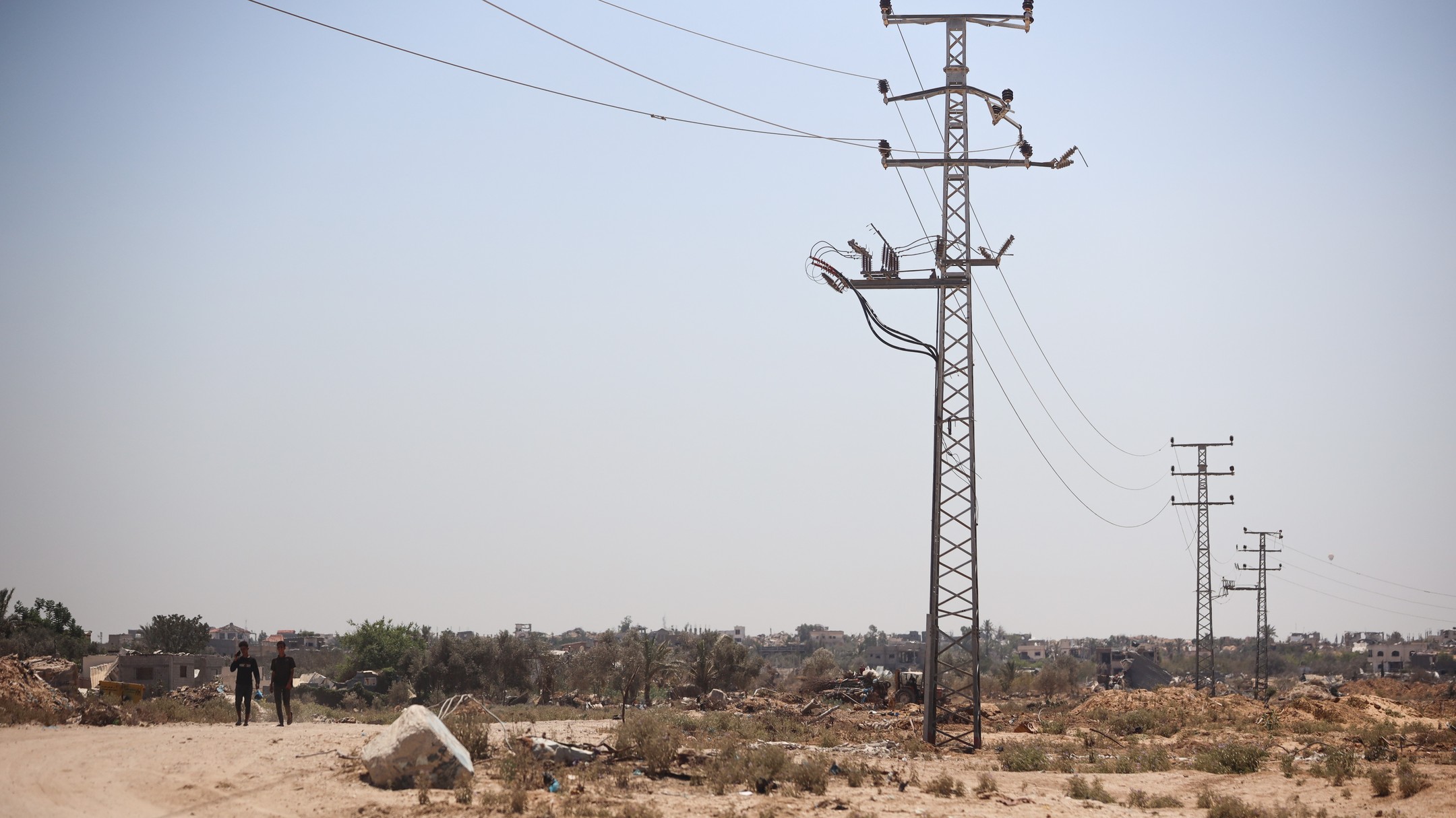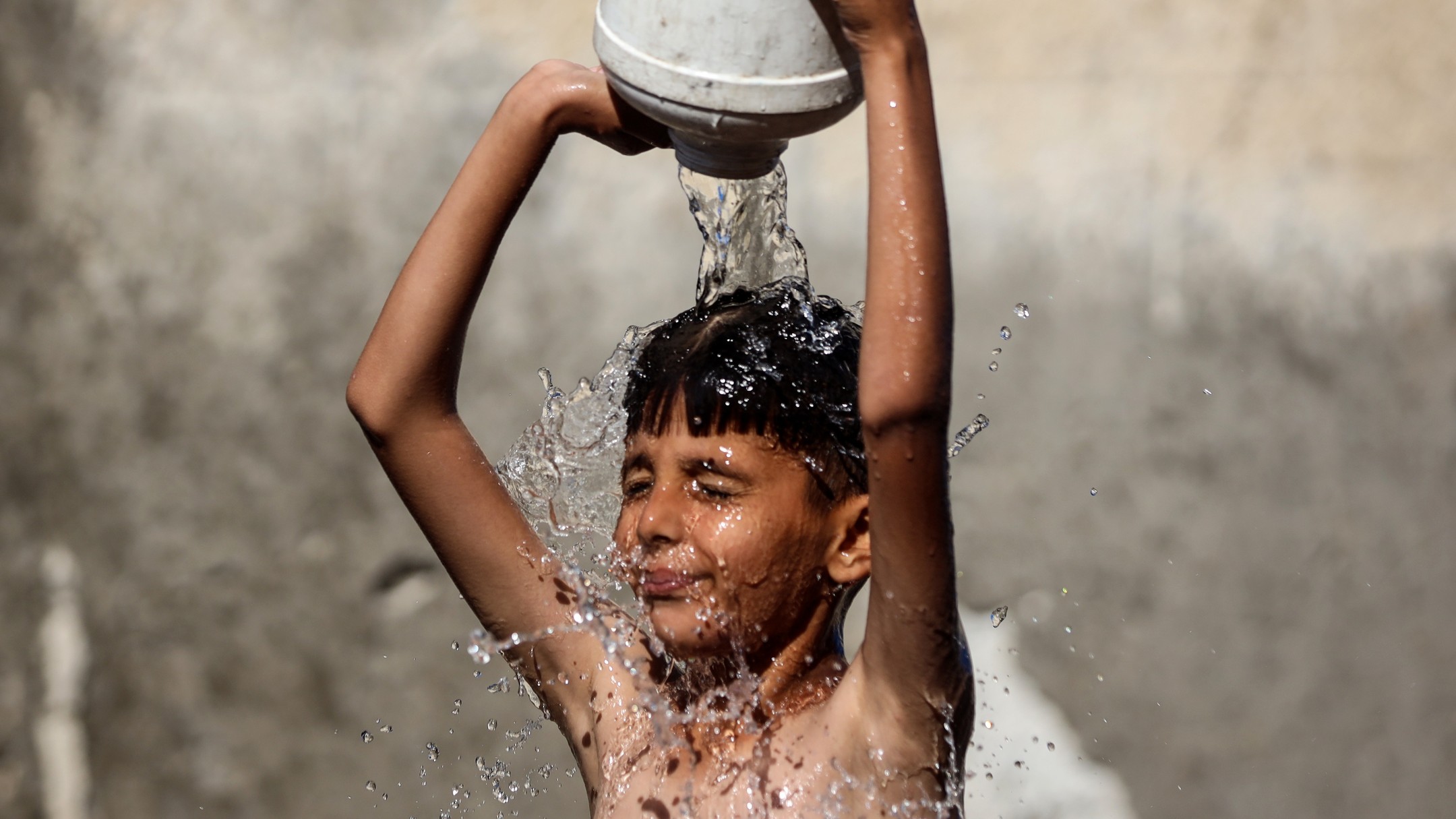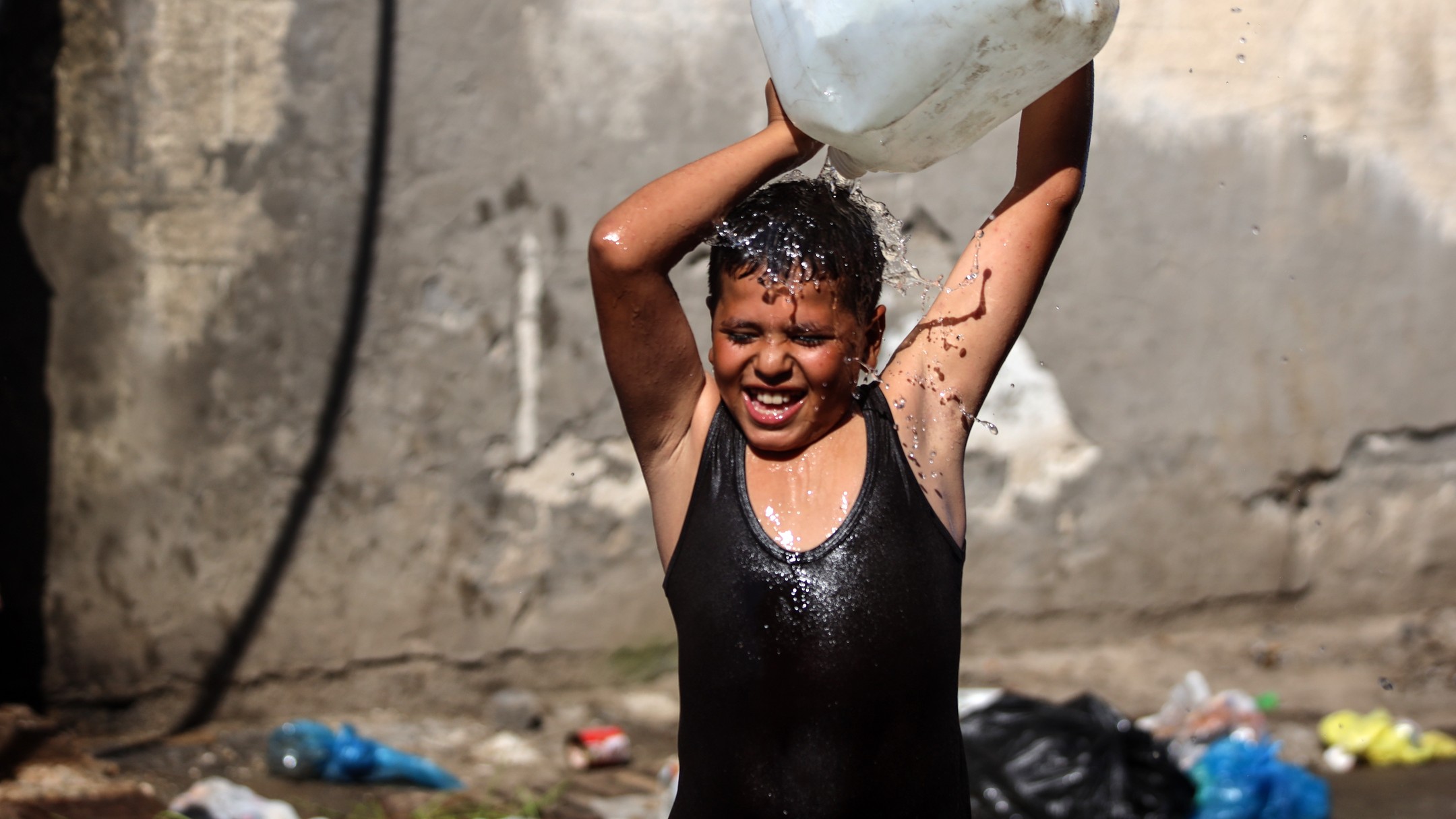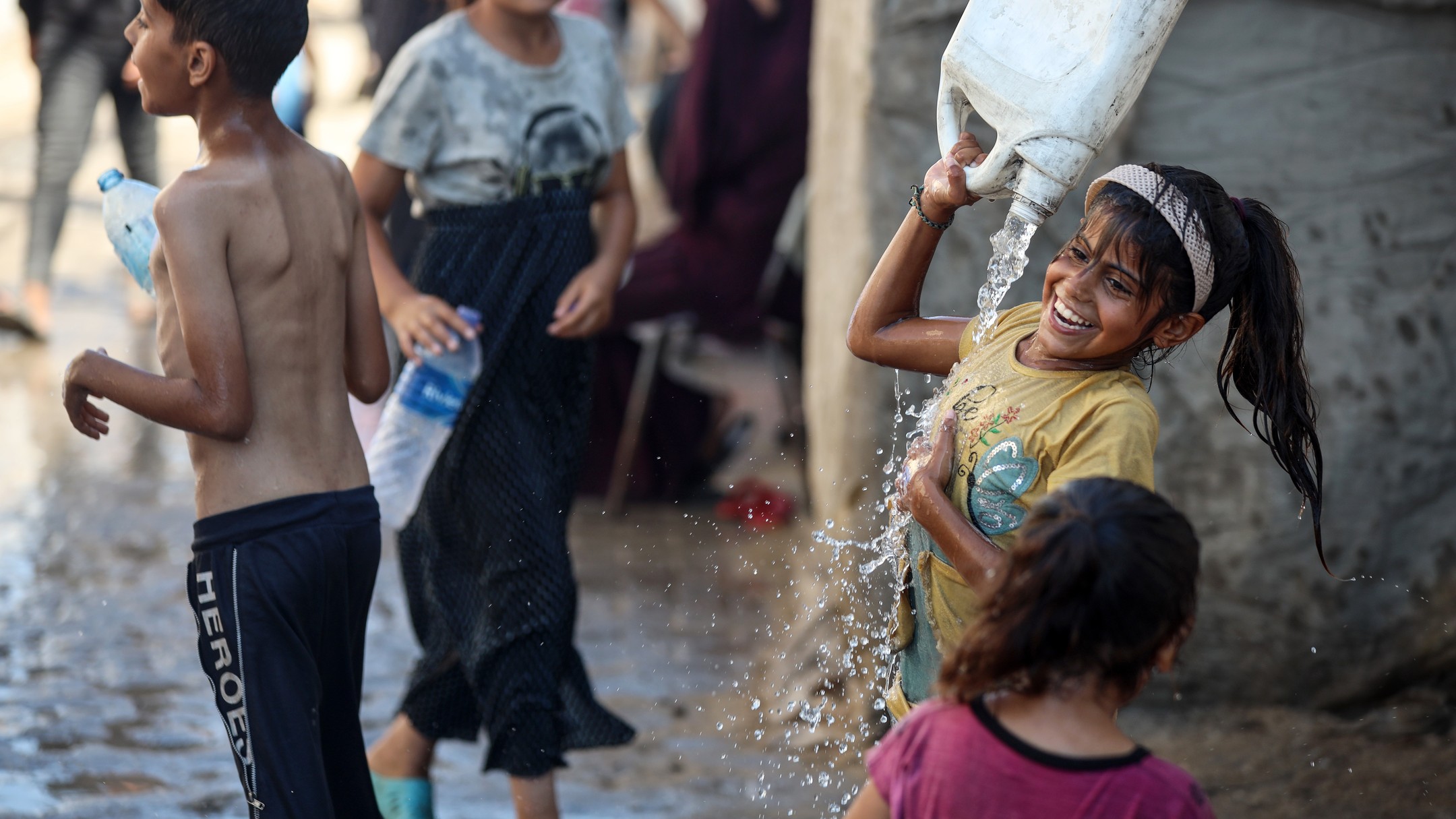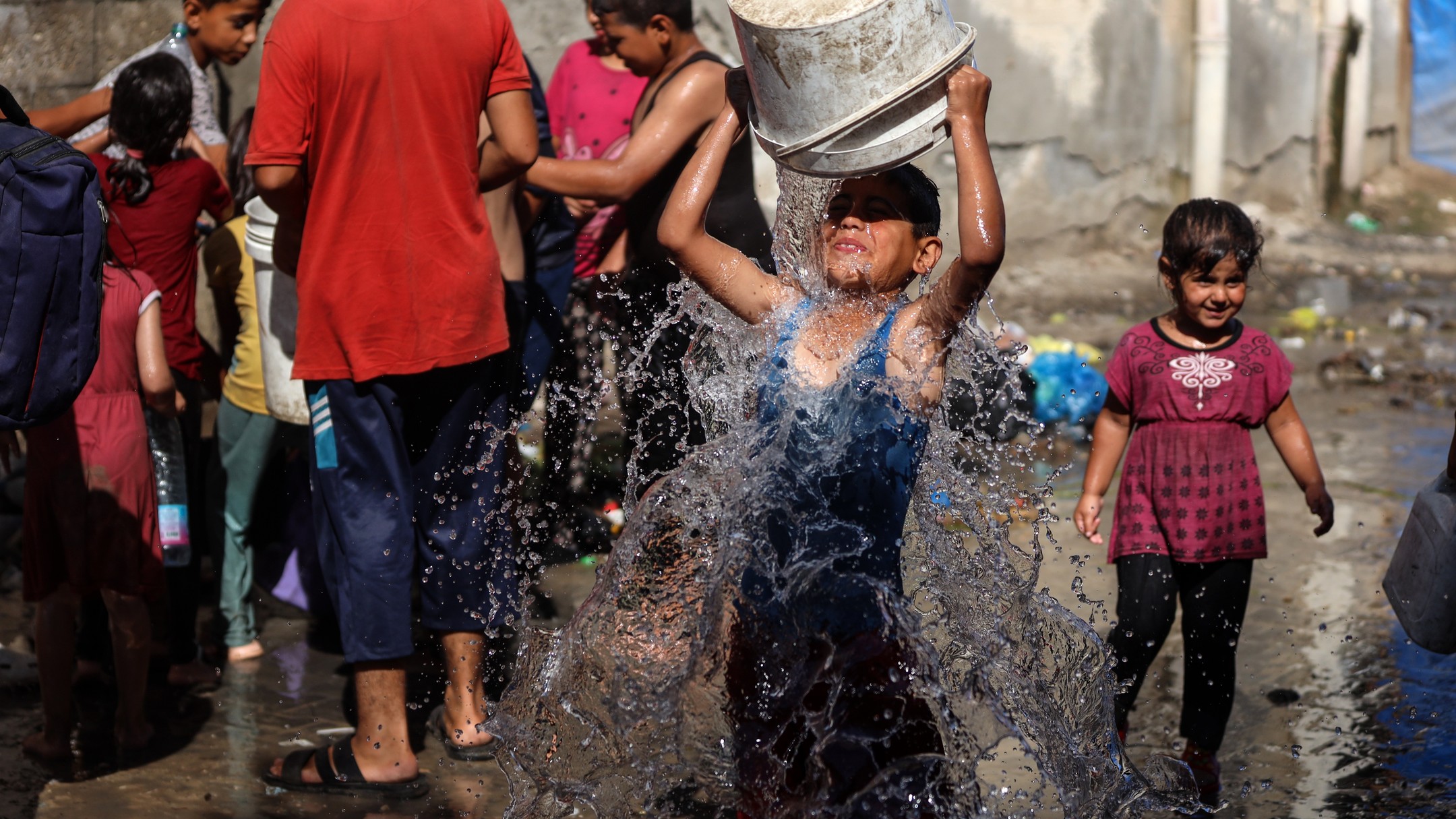 Displaced Palestinian children play with water outside their tents during a heat wave in Deir al-Balah in the central Gaza Strip on July 3, 2024. photo by majdi fathi