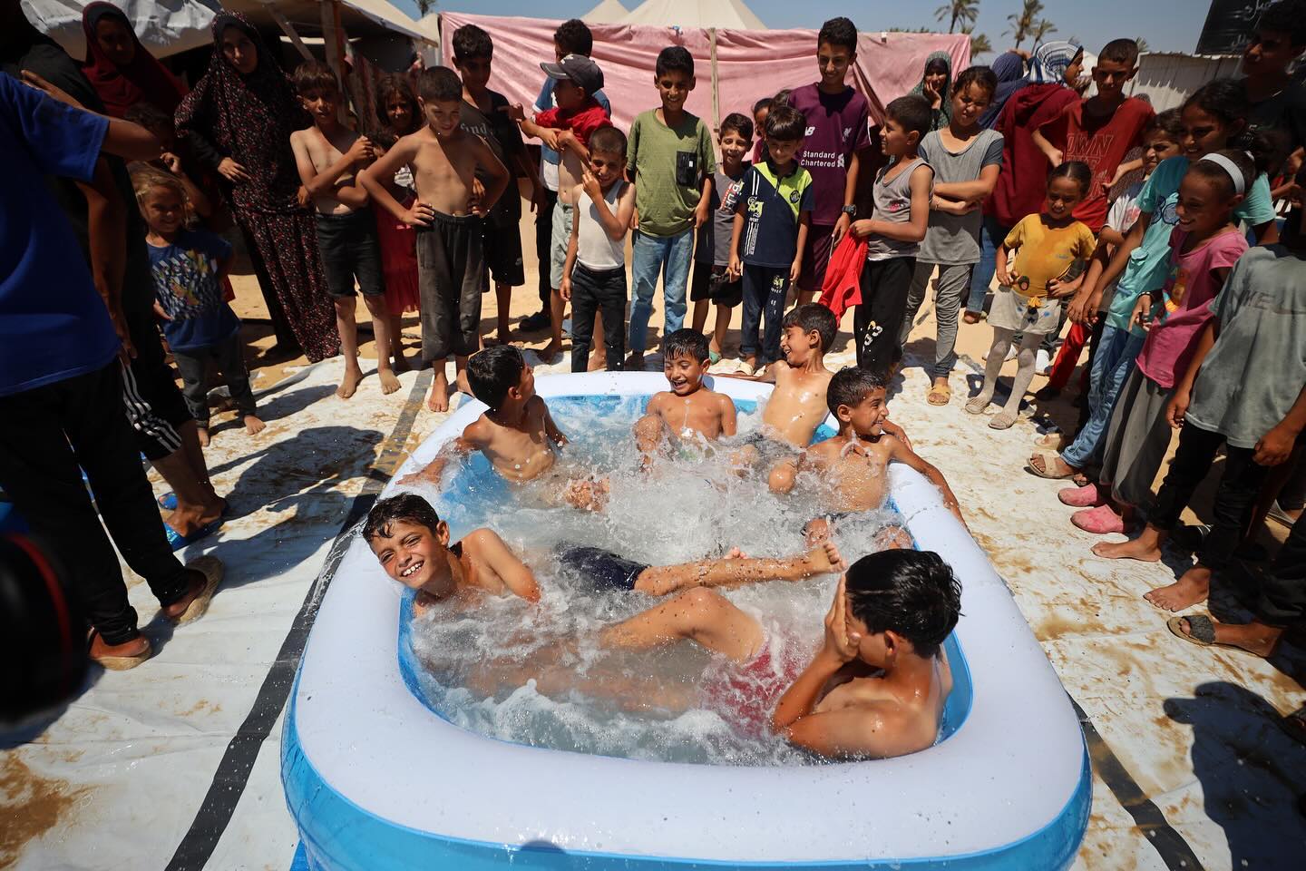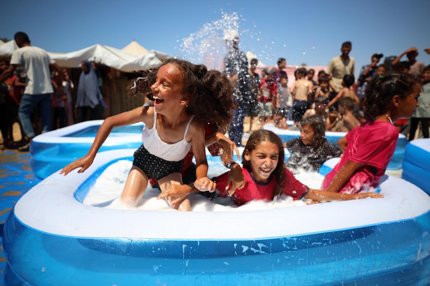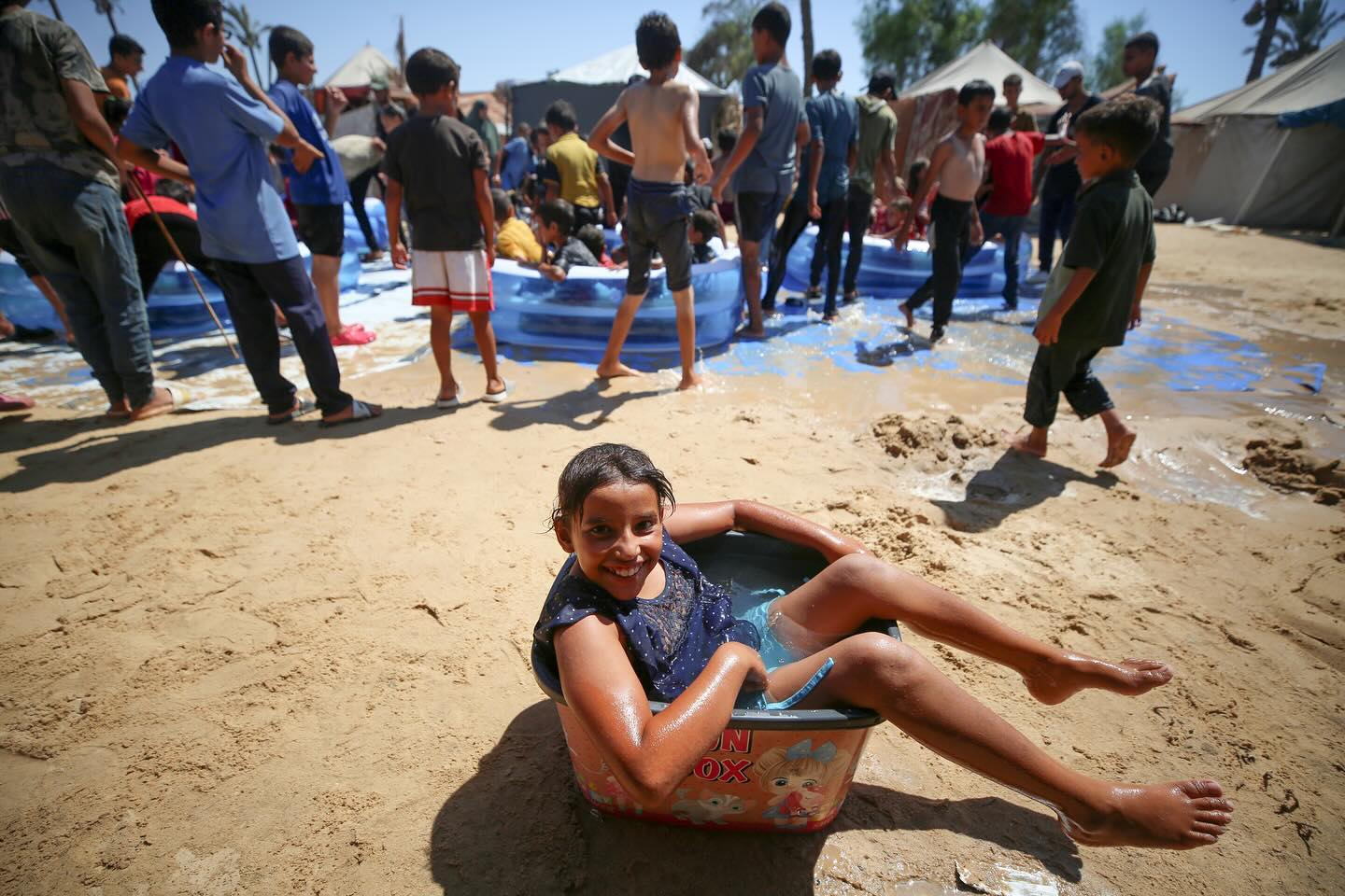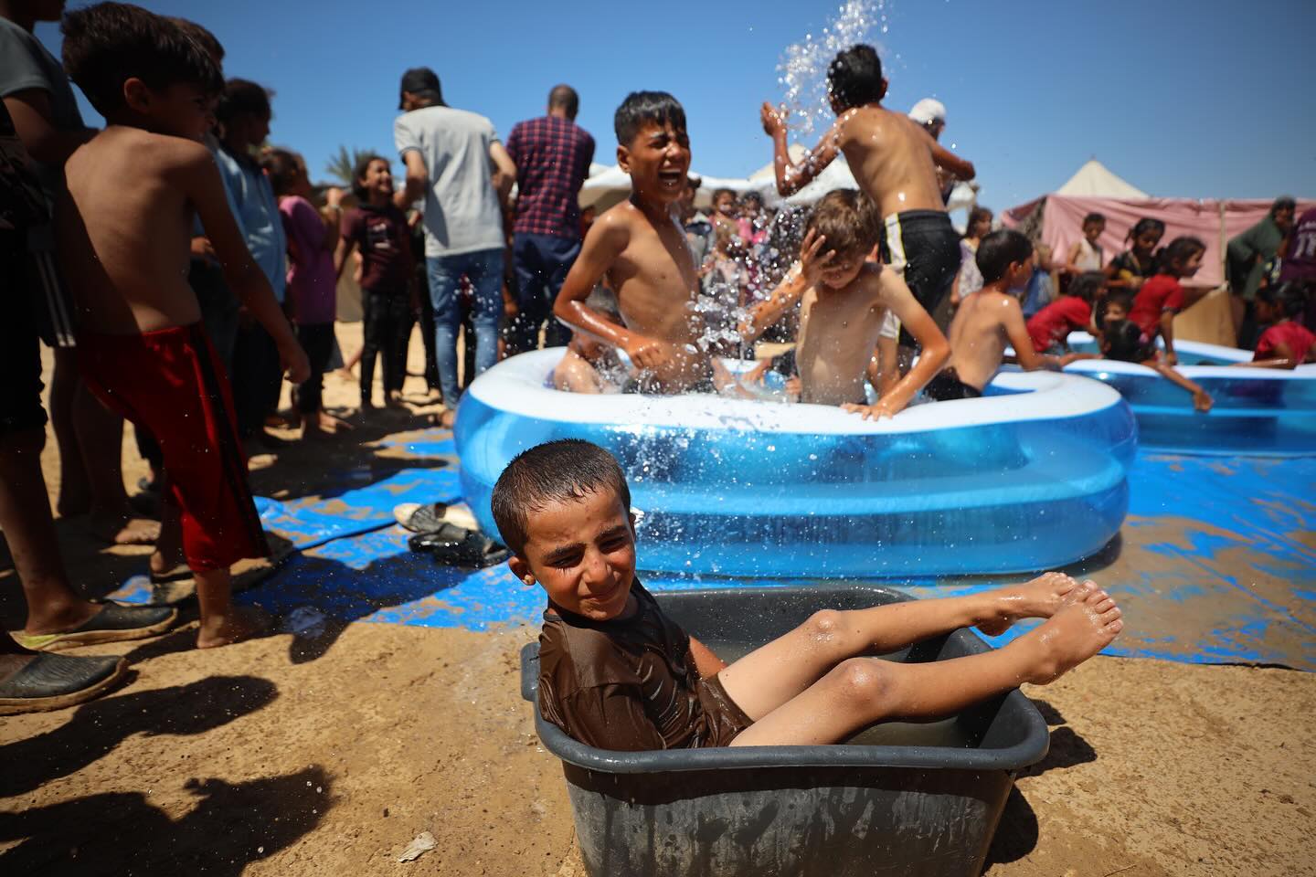 Displaced Palestinian children are playing together in the water in swimming pools in a makeshift camp during hot weather in Deir el-Balah, in the central Gaza Strip, on July 18, 2024, photo by majdi fathi