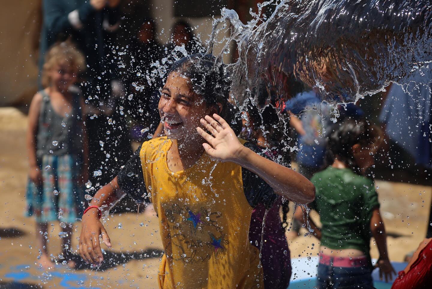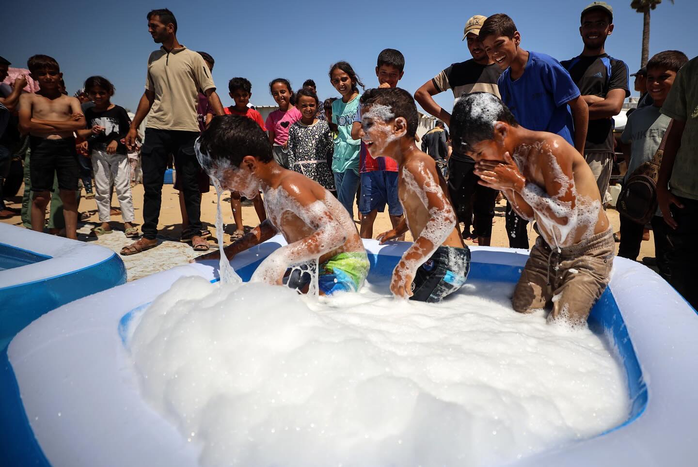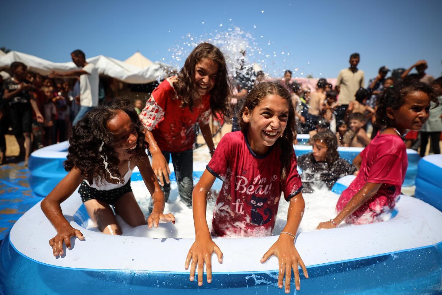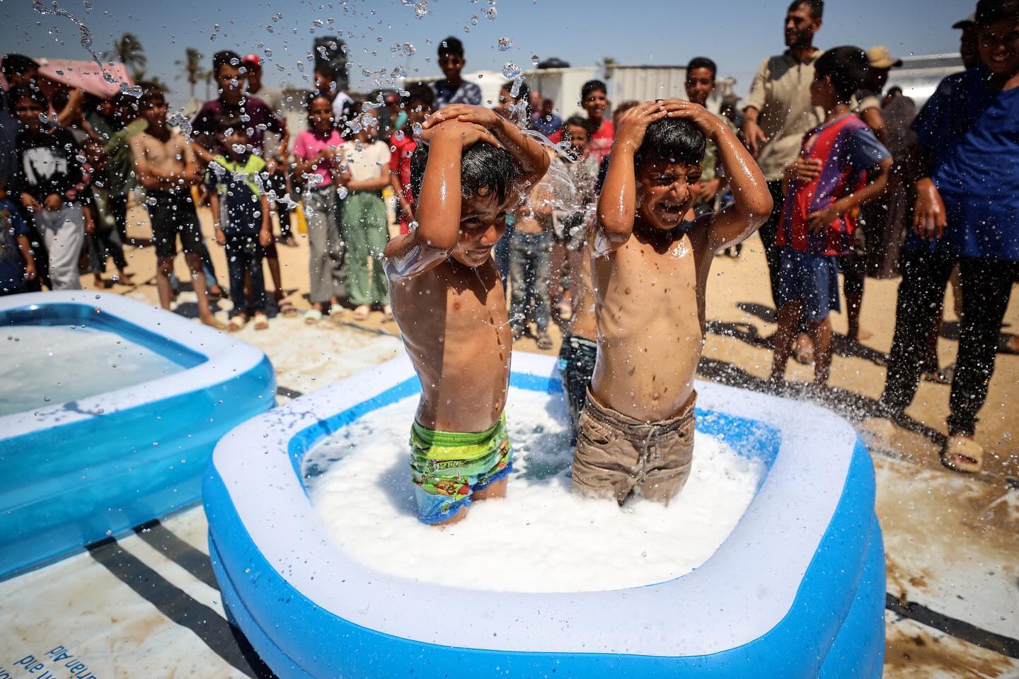 Displaced Palestinian children are playing together in the water in swimming pools in a makeshift camp during hot weather in Deir el-Balah, in the central Gaza Strip, on July 18, 2024, photo by majdi fathi