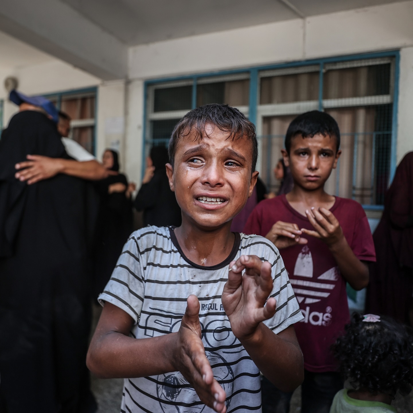 A Palestinian child cries after Israeli fighter jets hit United Nations Relief and Works Agency for Palestine Refugees in the Near East (UNRWA) school, killing and injuring many in Nuseirat refugee camp of Deir al-Balah, Gaza . (Photo by Ali Jadallah/Anadolu via Getty Images)