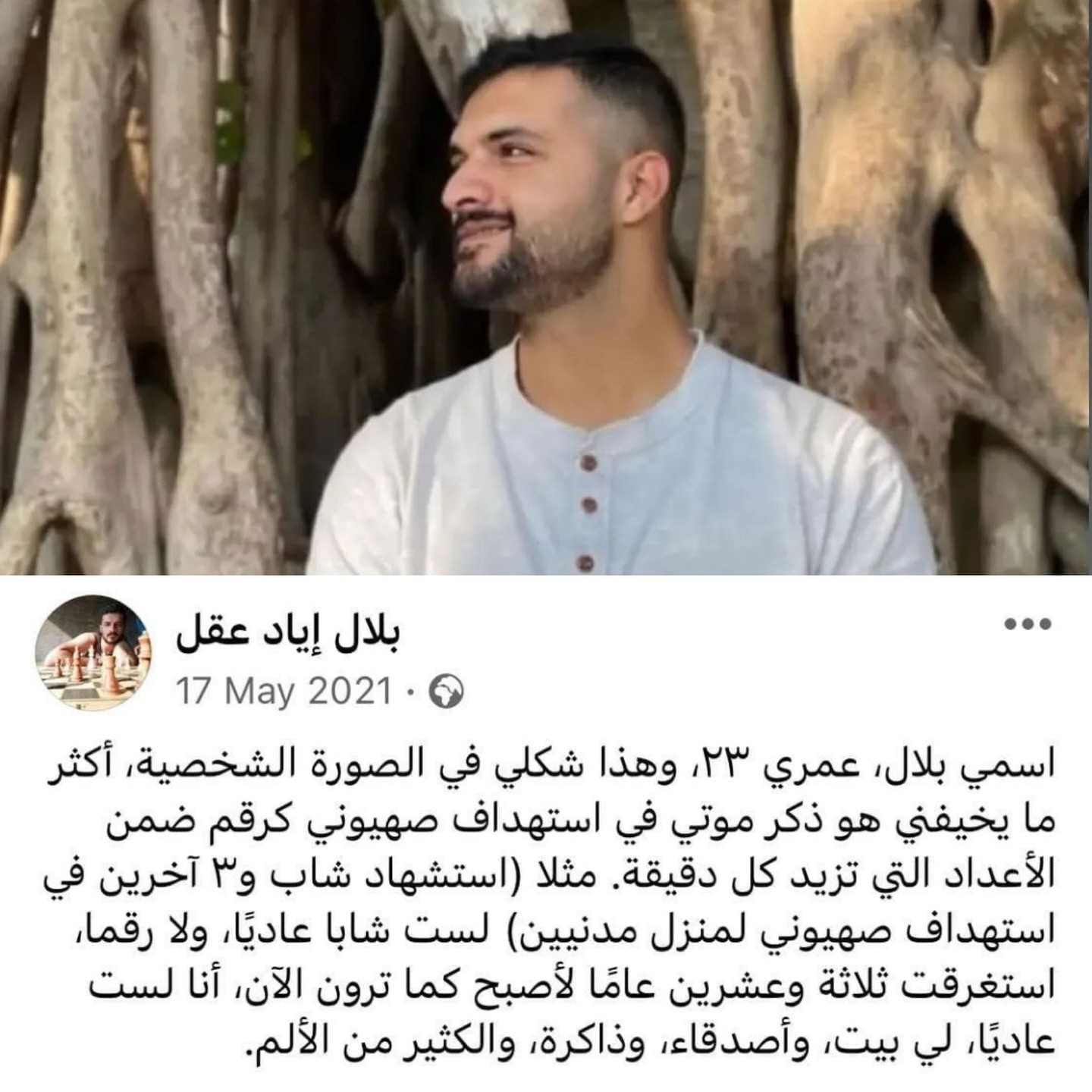 هذا هو بلال، كانت أكبر مخاوفه أن يكون مجرد رقـم استشهد بلال اليوم، ولن يكون مجرد رقـم ، سنجعل كل الكوكب يعرف قصته ويدعوا له والأهم أن اللّه يعرفه والجنة تعرفه. This is Bilal. His biggest fear was to become just a number. Bilal was martyred today, and he will not be just a number. We will make sure the whole world knows his story and prays for him. The most important thing is that God knows him, and Paradise knows him.
