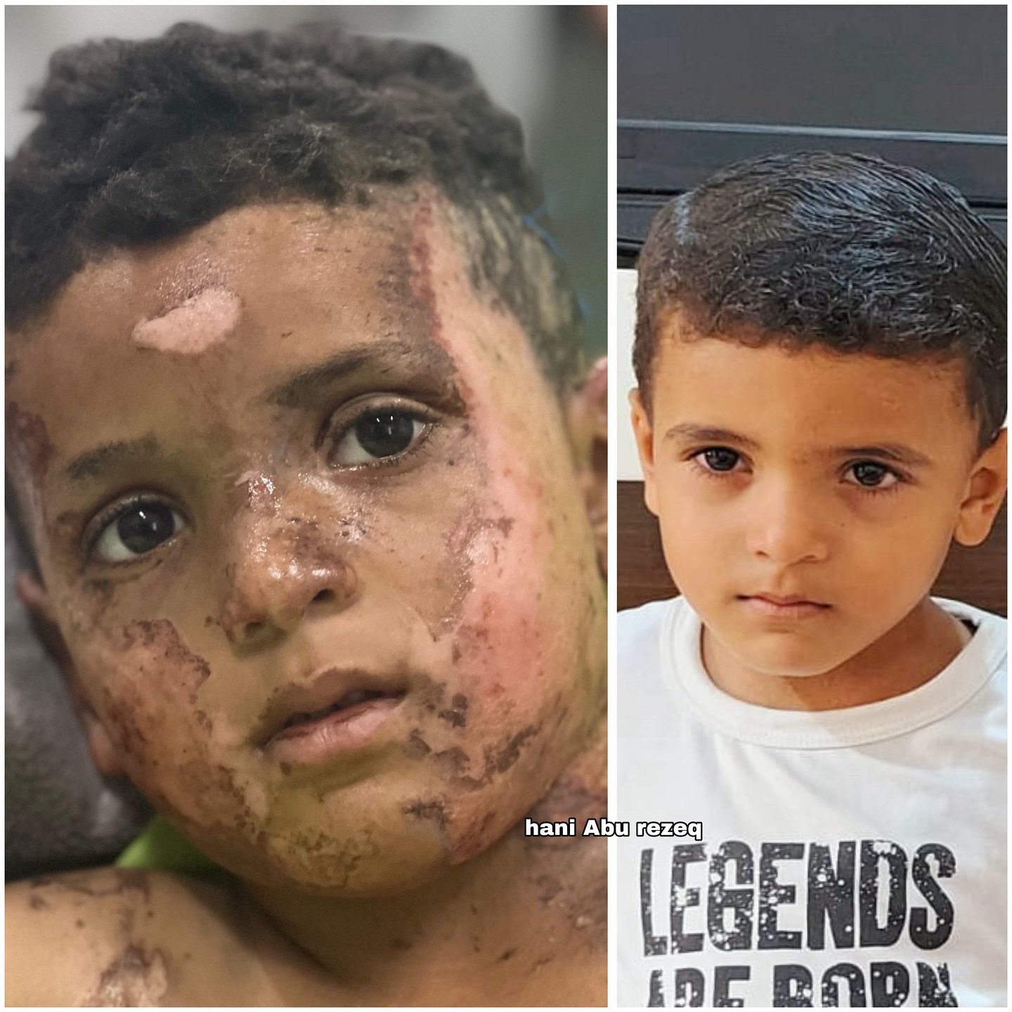 في صورة الطفل محمود السعافين قبل الإصابة، تظهر البراءة والابتسامة المشرقة التي تعكس عالماً من الأحلام والآمالعيونه تلمع بلمعان الطفولة البريئة، وبشرته ناعمة كصفحة بيضاء لم تمسها القسوة. أما في صورة محمود بعد الإصابة نتيجة قصف مدرسة بمخيم النصيرات ، تظهر آثار الحرب على وجهه الصغير، تختفي الابتسامة لتحل محلها نظرة من الألم والتساؤل، والندوب على وجهه تروي قصة قاسية ، يبقى الطفل نفسه، لكن عينيه تحملان الآن ثقل تجربة تفوق عمره بكثير. #stop_the_war