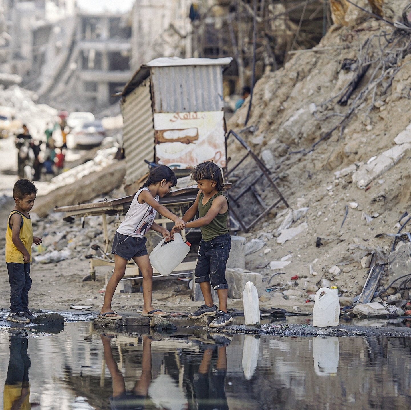A Palestinian boy help girl carries cans to collect water as she walks by houses which were destroyed in an Israeli strike, in Khan Younis, in the southern Gaza Strip. By: Ahmed Abu Ajwa