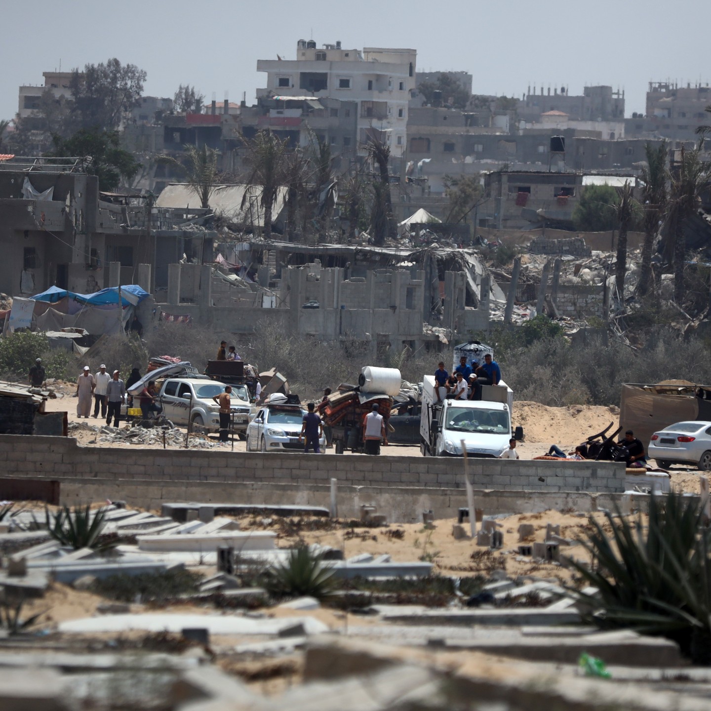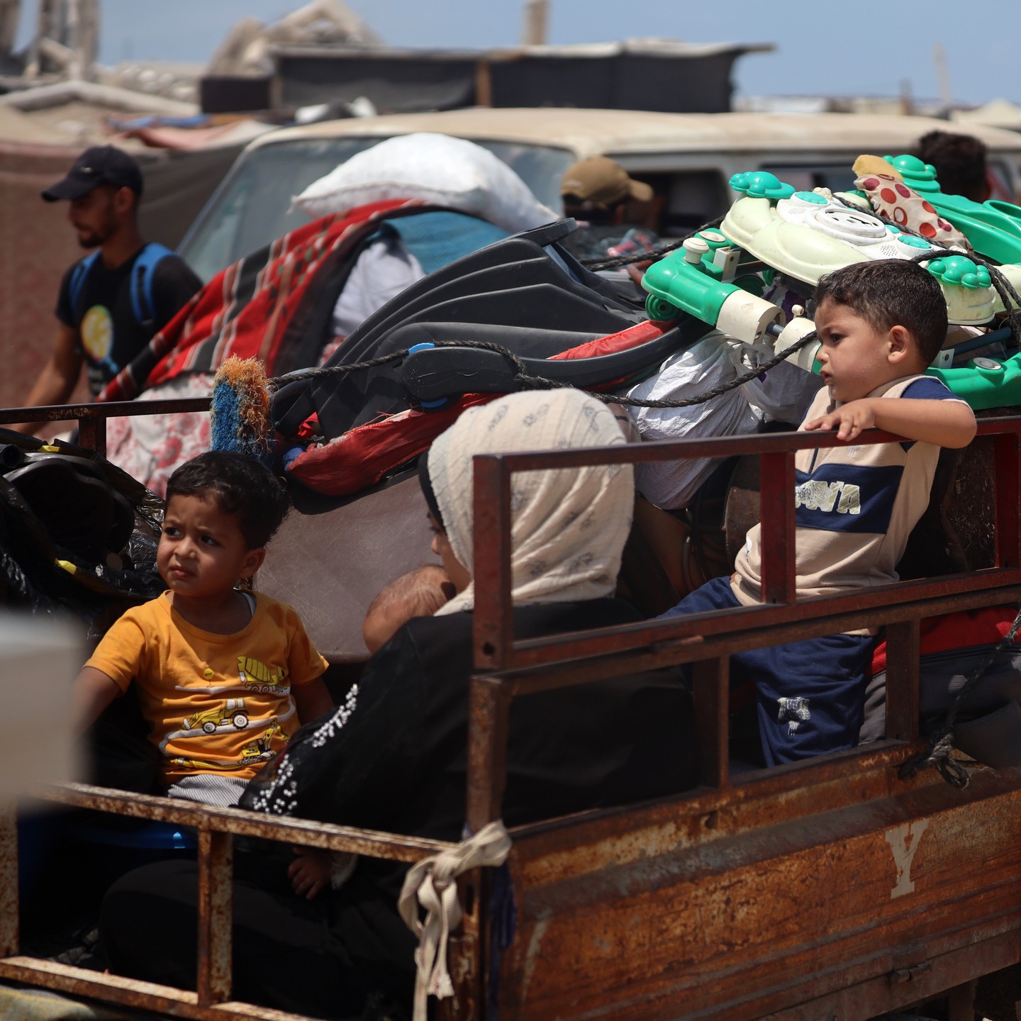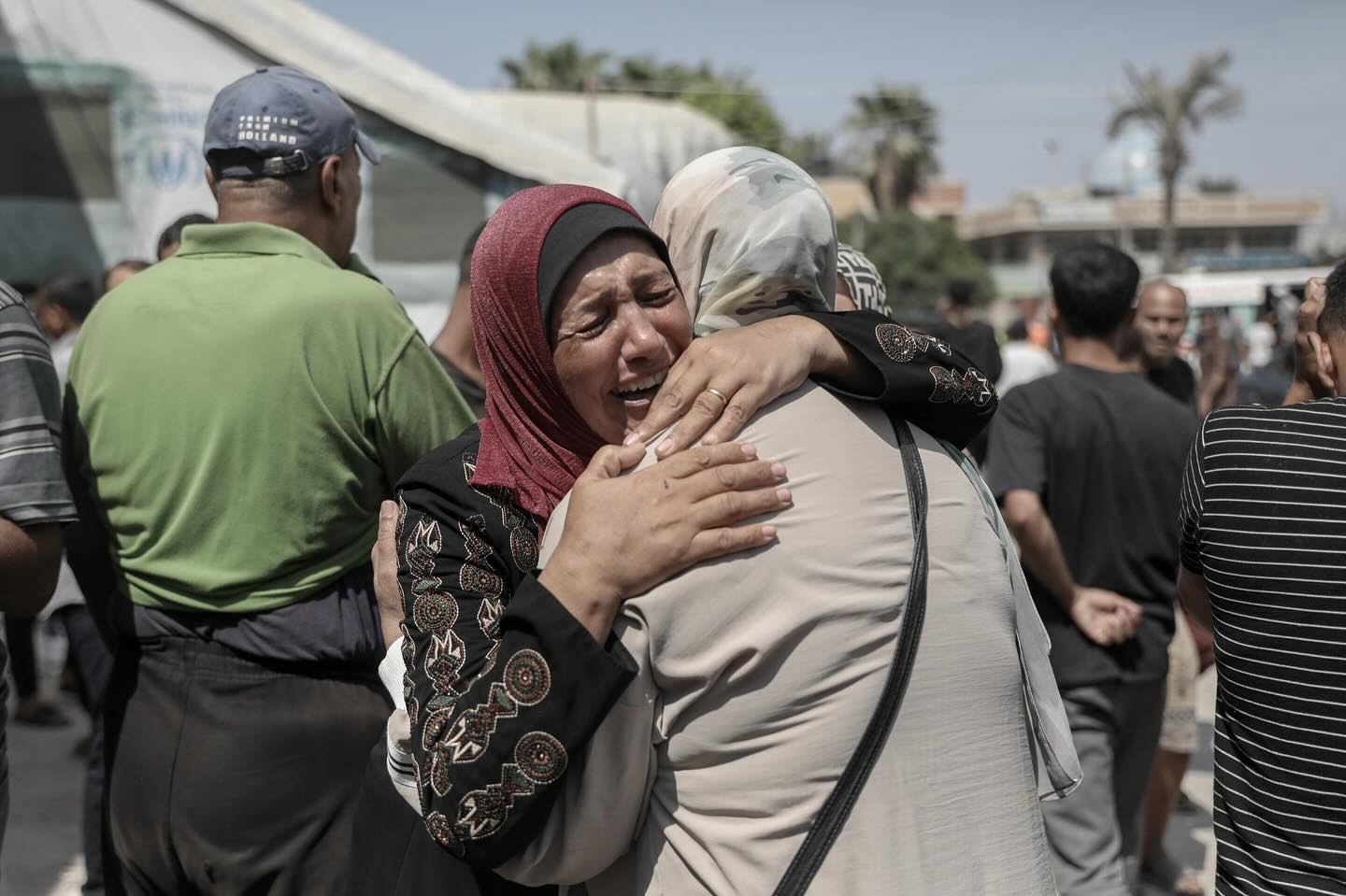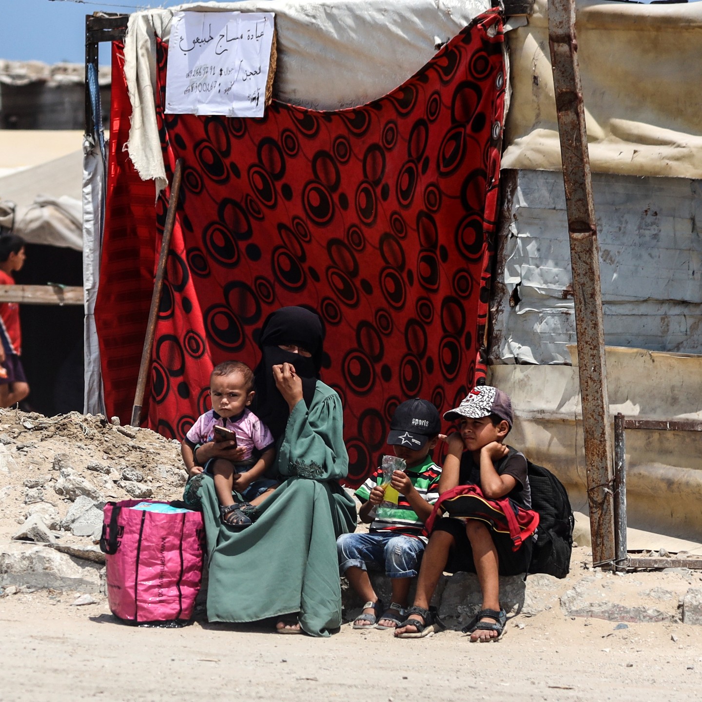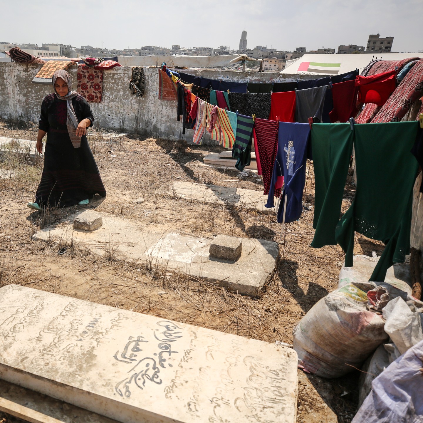 Displaced Palestinians from the eastern part of Khan Yunis, are seen at a temporary camp set up in the grounds of a cemetary in the western part of the city, in the southern Gaza Strip, on July 27, 2024, amid the ongoing conflict between Israel and the Palestinian militant group Hamas. photo by majdi fathi