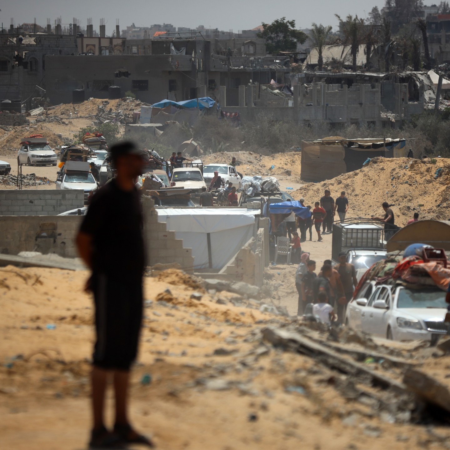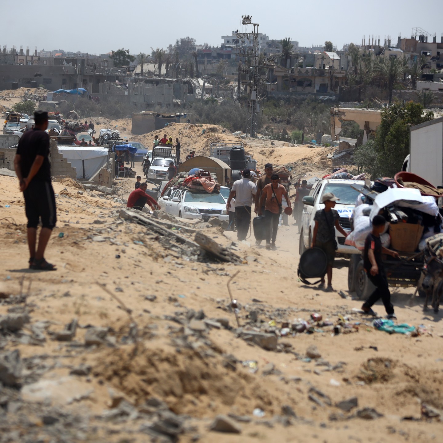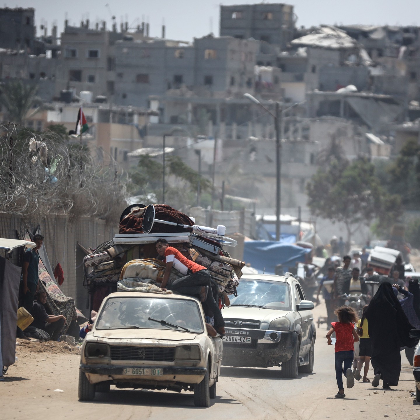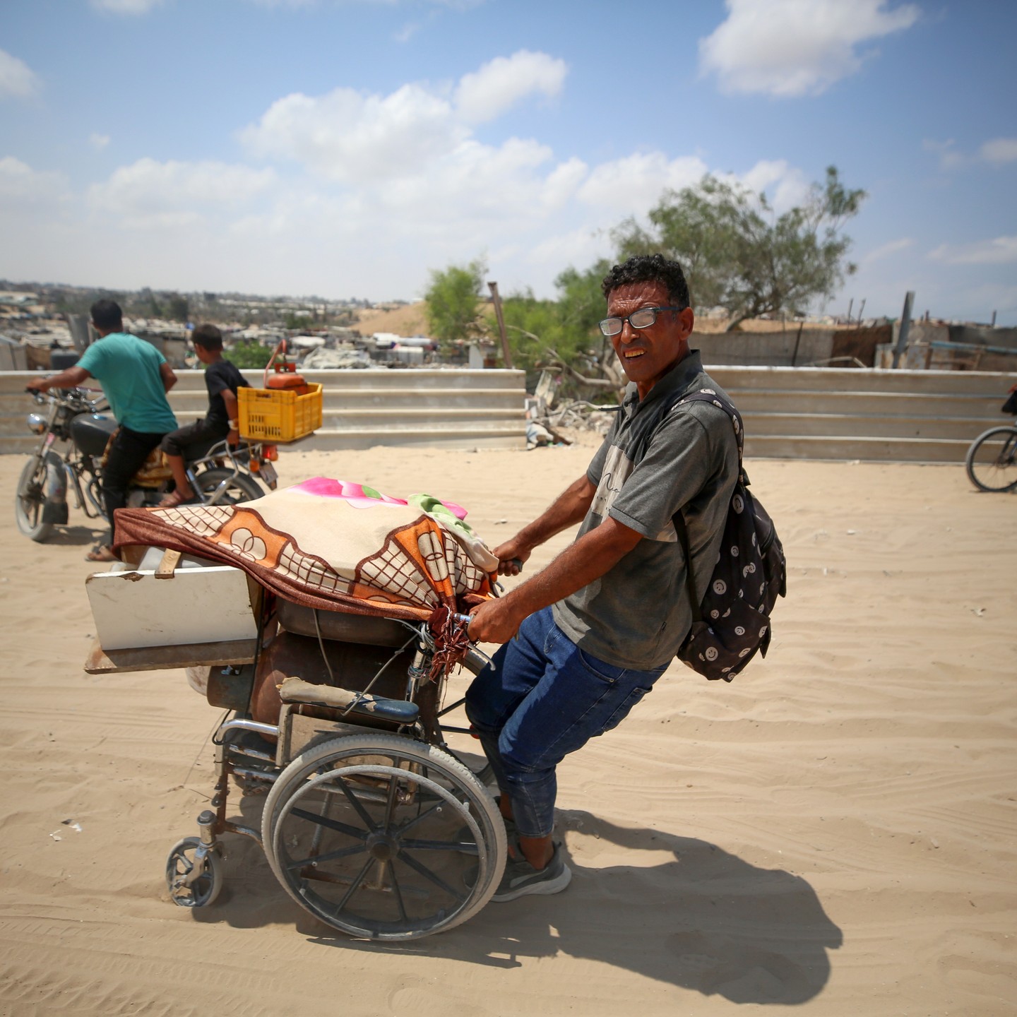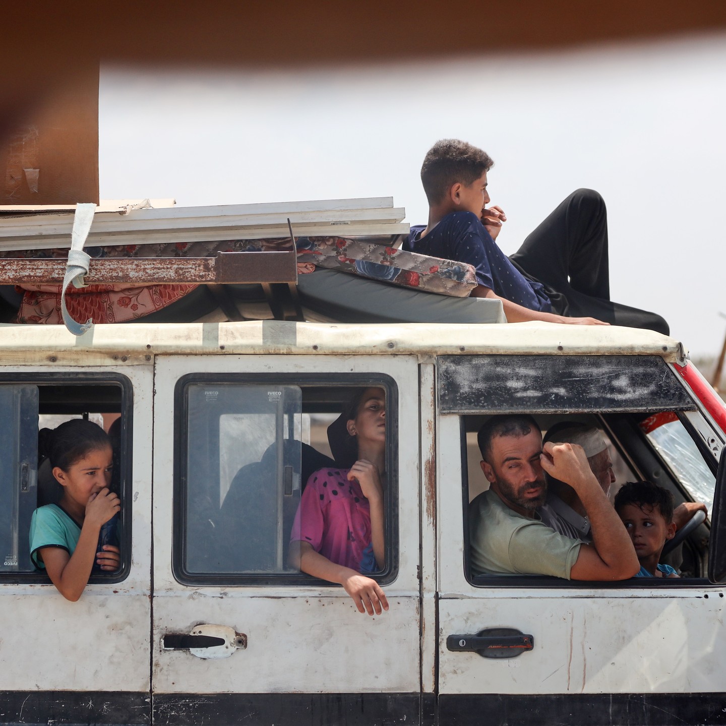 Displaced Palestinians from the eastern part of Khan Yunis, are seen at a temporary camp set up in the grounds of a cemetary in the western part of the city, in the southern Gaza Strip, on July 27, 2024, amid the ongoing conflict between Israel and the Palestinian militant group Hamas. photo by majdi fathi