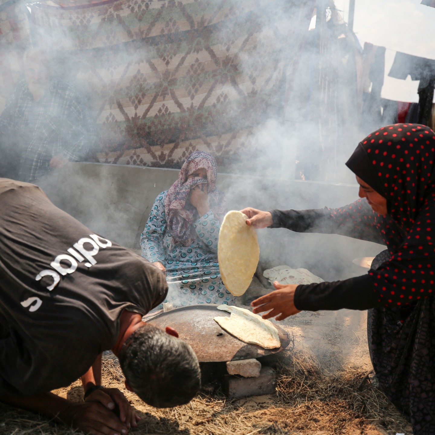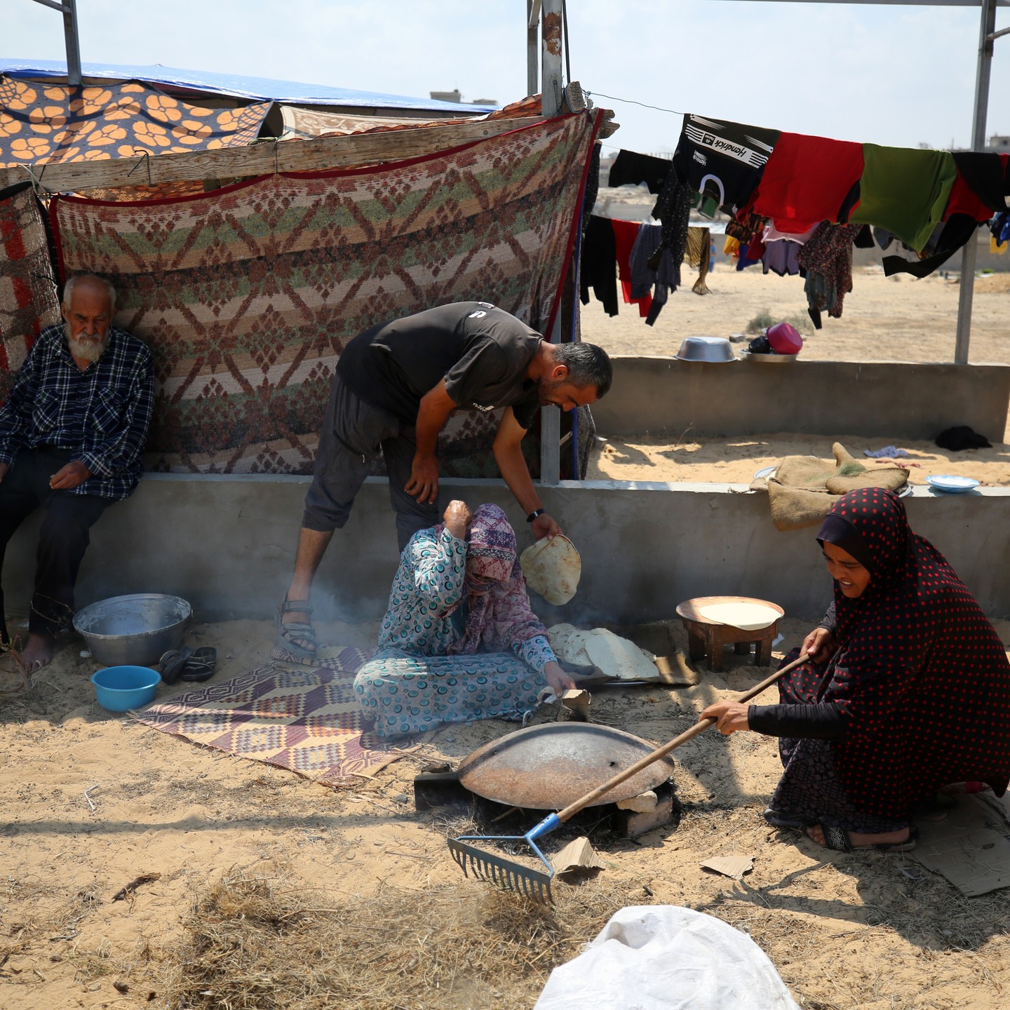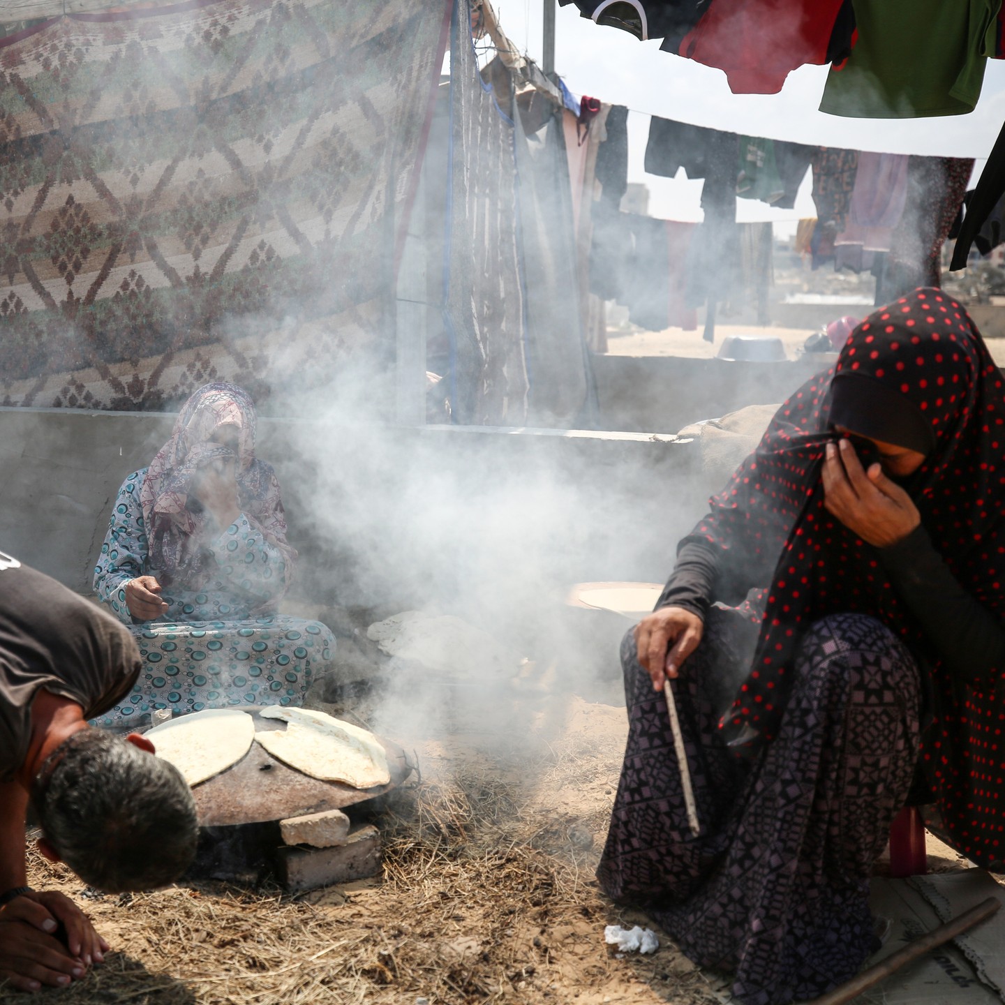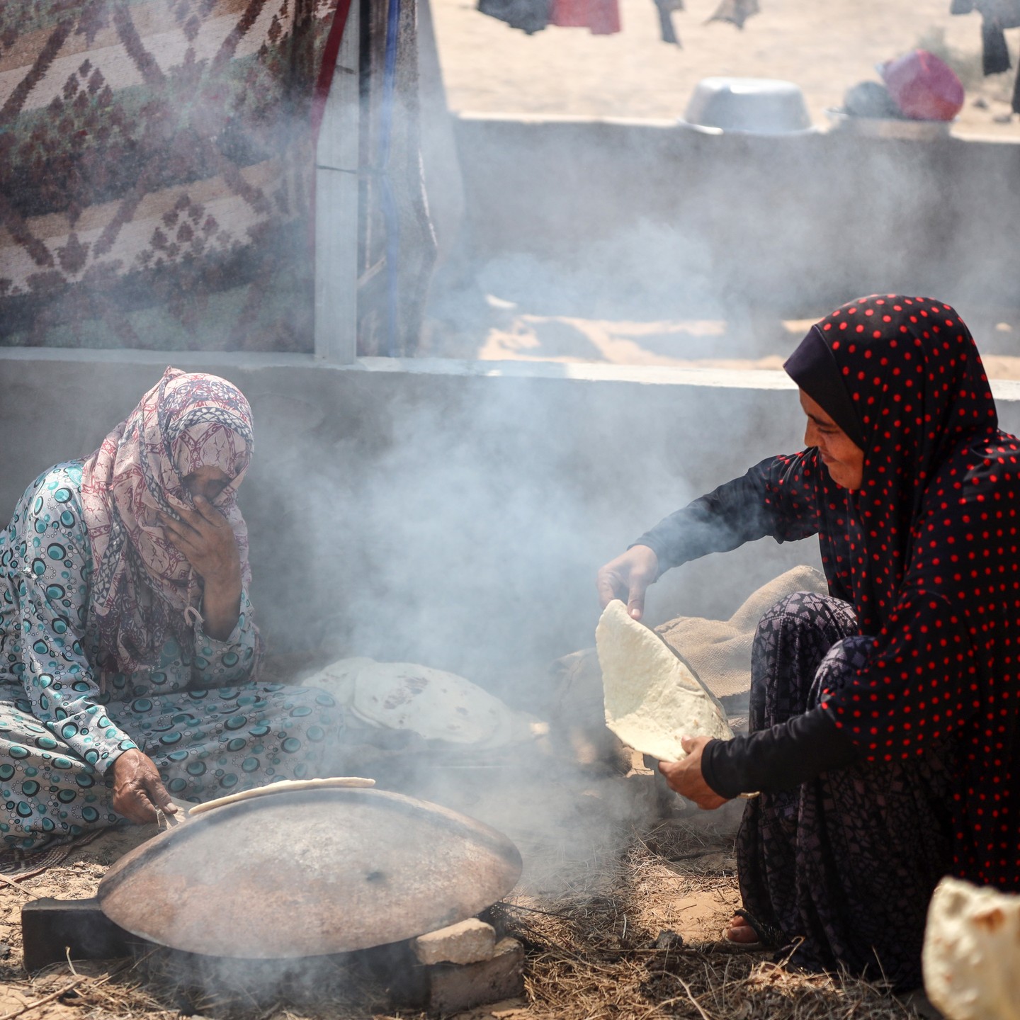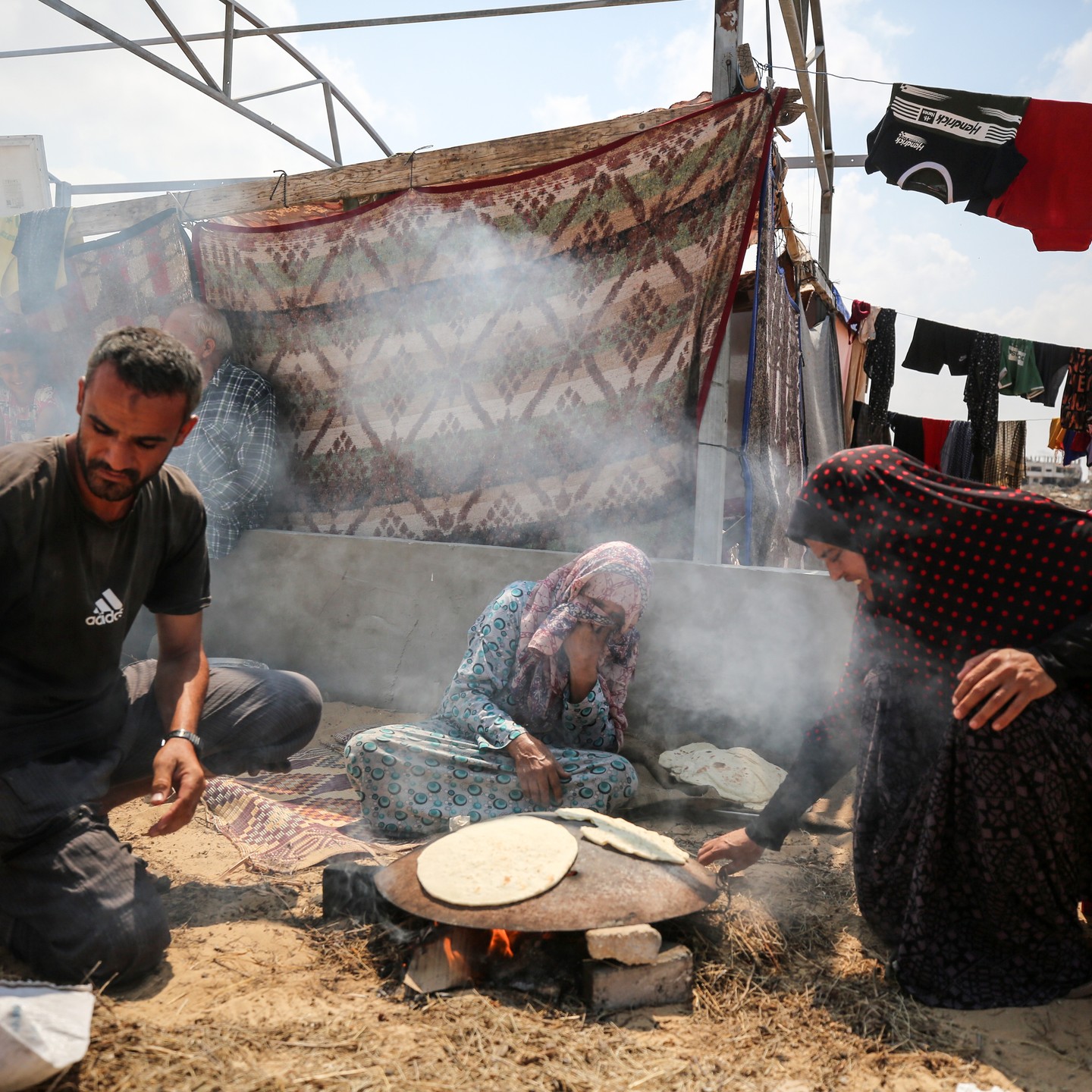 7:02 PM @majdi_fathi Displaced Palestinians from the eastern part of Khan Yunis, prepare to cook at a temporary camp set up in the grounds of a cemetary in the western part of the city, in the southern Gaza Strip, on July 27, 2024, amid the ongoing conflict between Israel and the Palestinian militant group Hamas.