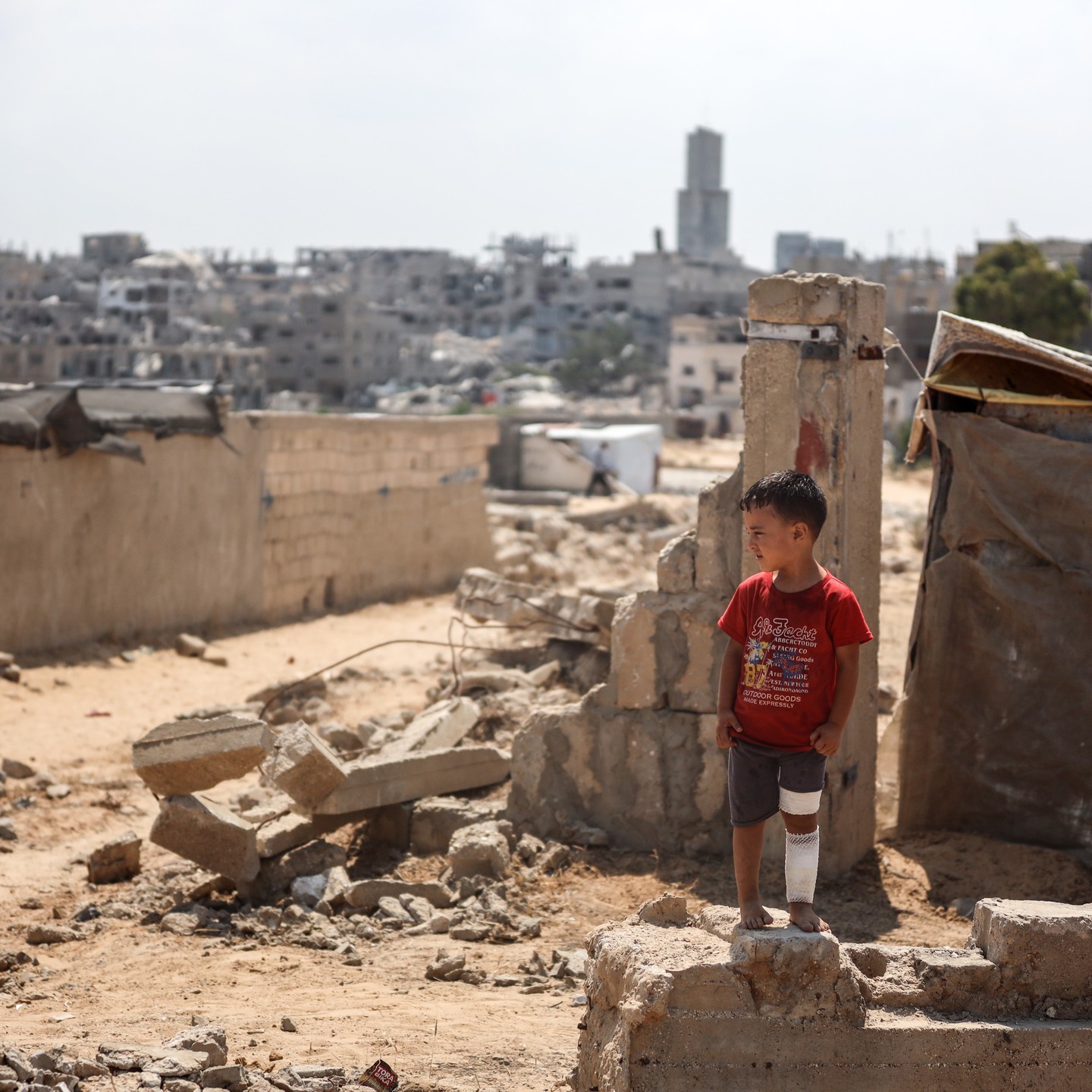 A boy stands next to graves as displaced Palestinians from the eastern part of Khan Yunis set up temporary camp in the grounds of a cemetary in the western part of the city, in the southern Gaza Strip, on July 27, 2024, amid the ongoing conflict between Israel and the Palestinian militant group Hamas.