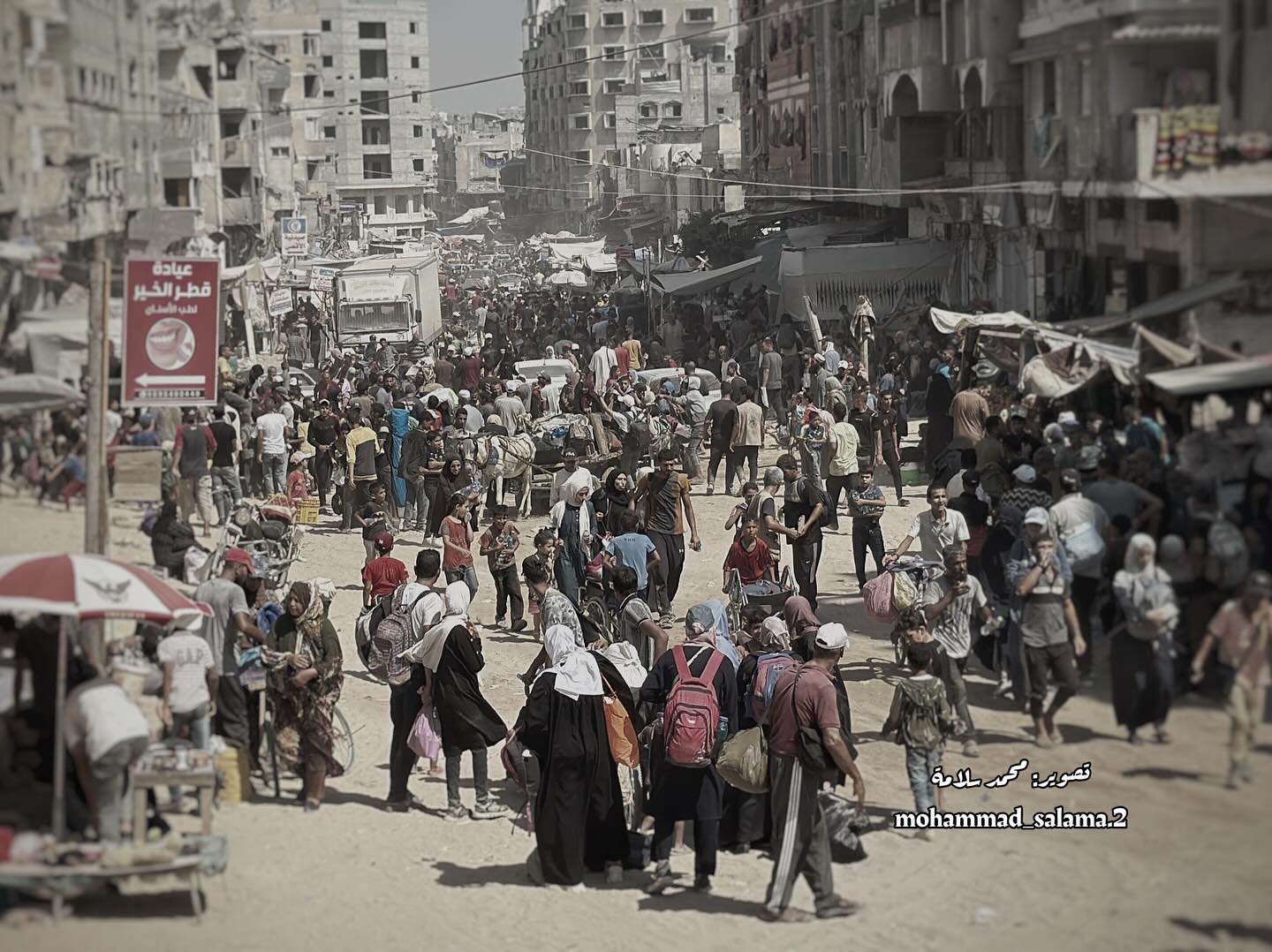 The Israeli occupation forces forcibly displaced Palestinians from the Braij and Nusairat refugee camps following threats to invade the area. By @salah.97ib الالاف ينزحون من مخيمي النصيرات و البريج بعد تعزيزات الاحتلال باجتياح المنطقة