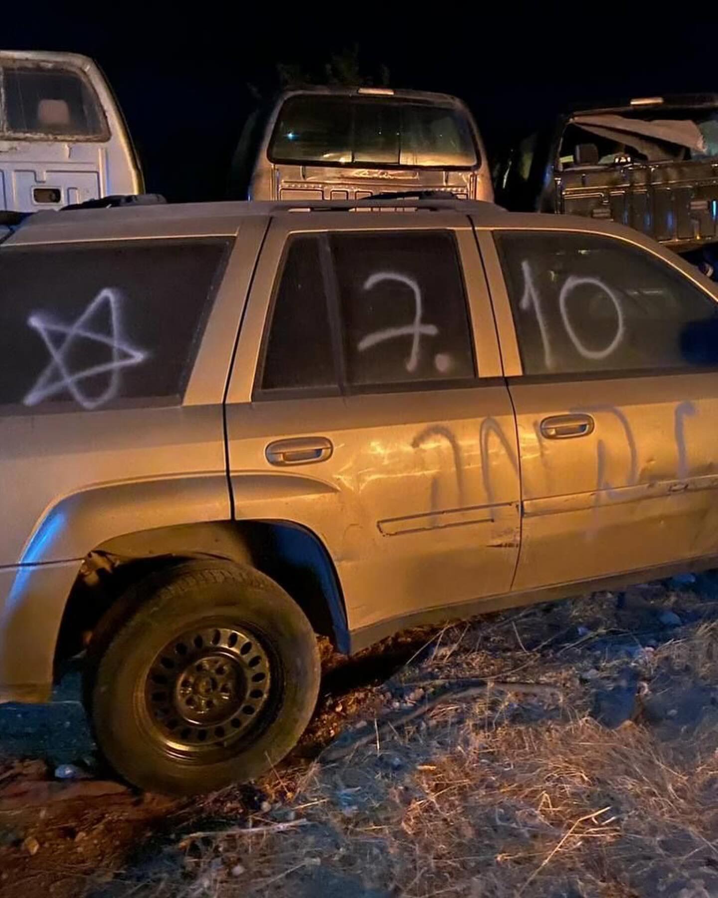 Israeli settlers burn a number of vehicles and sprayed racist slogans in Qalqas village near Hebron. مستوطنون يشعلون النار في عدد من المركبات ويخطون عبارات معادية بعد هجوم على خربة قلقس بالخليل فجر اليوم.