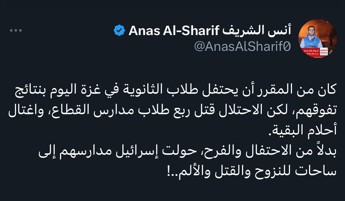 كان من المقرر أن يحتفل طلاب الثانوية في غزة اليوم بنتائج تفوقهم، لكن الاحتلال قتل ربع طلاب مدارس القطاع، واغتال أحلام البقية. بدلاً من الاحتفال والفرح، حولت إسرائيل مدارسهم إلى ساحات للنزوح والقتل والألم..!