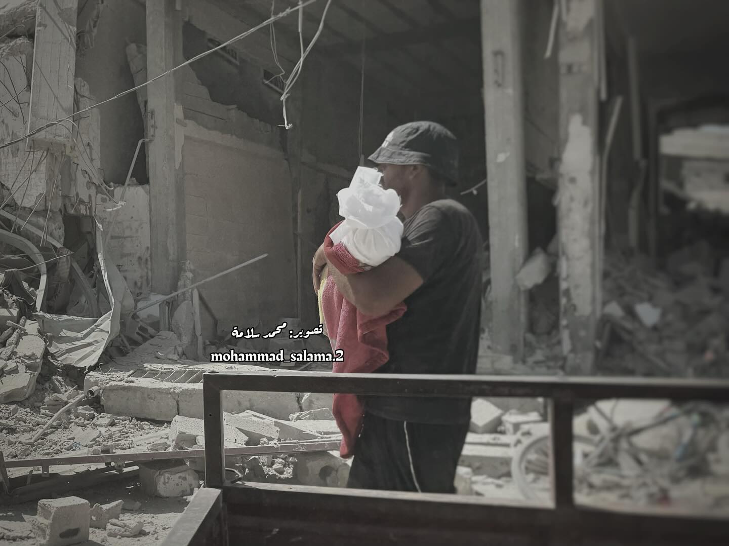 أب يعود لبيته حاملاً طفله الشهيد بين يديه بعد انسحاب الجيش من شرق خانيونس A father returns home with his martyred child in his hands after the army withdrew from eastern Khan Yunis