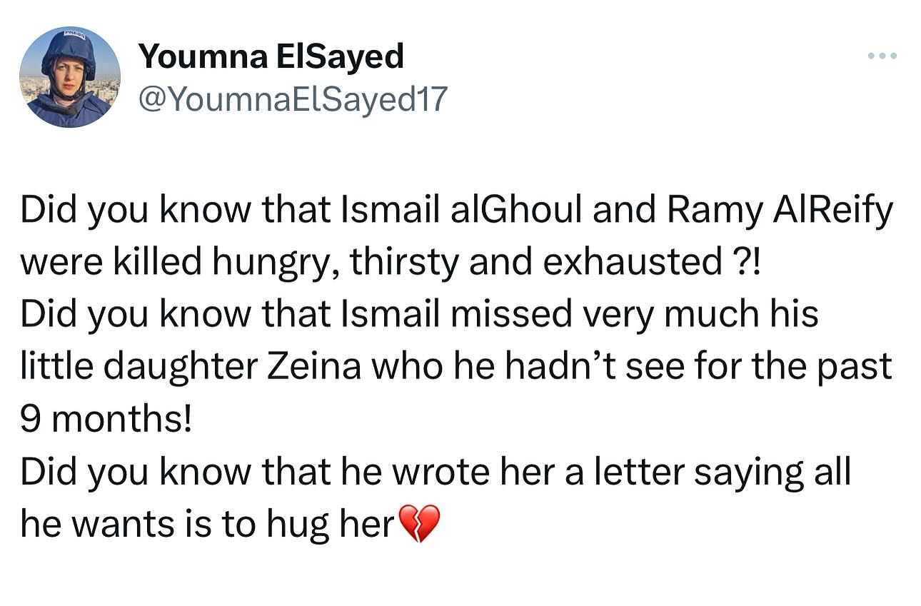 زوجة الصحفي اسماعيل الغول تكتب: "قلبي عليك زي النار يا نور عيني.. رحت مقهور وبحسرتك علينا، نفسك تشوفنا أنا وزينة، رحت وأنت بتحكي أنا تعبااان تعبان من غيركم مش عارف أعيش من غيرك أنتي وزينة النا 10 شهور بحسرتنا وبقهرنا وولا مرة تخيلت يجيني خبرك ولا مرة تخيلت حد يقلي إسماعيل ارتقى! أنا كنت بستنى الحرب تخلص عشان نشوفك! أنا مكنتش بستنى هاد النهاية! أنا كنت بستنى أول لقاء بينك أنت وزينة مكنتش بستنى صورة جنازتك! زينة تعلقت فيك كثيررر كل ما يرن الجوال بتحكي بااباااا وينك ترد على بنتك! لحتى الآن بستنى باتصالك تحكيلي مشتاقلكم يا أم زينة يلا هانت عدها خلصت الحرب وبنشوفكم ع خير.. رحت بدري والله بدري كتير لسا ما شبعناش منك.. لسا زينة بدها أبوها وبدها حضنه الحرب مش هتخلص الحرب بدأت من جديد كنت دايما تحكيلي كل ما أشوف زوجات الشــHـداء بتيجي في بالي وبحزن عليكي، بحكي ملك ايش هتعمل! تعيطيش عليي لمن أموت خليكي قوية.. أنت عارف قديش متعلقة فيك وراكنة عليك بكل اشي وبحكيلك كل اشي.. ليش رحت وسبتنا ! يااا الله برّد قلوبنا وهوّن علينا حتى وأنت بنص الموت بتفكر فينا وهمك علينا، قبل ما تستشهد بلحظة كنت أحكي معك! حكتلي تقلقيش عليي أنا كويس يااريت الحياة وقفت بهديك اللحظة حياتنا وقفت من بعدك يا سمعة💔💔💔 إحنا فخورين فيك وبكل اشي عملته طول هالحرب.. أنت كنت بطل يا حبيب💔😢 حسبنا الله ونعم الوكيل ياارب انتقم لدمائنا وأزواجنا وأطفالنا"