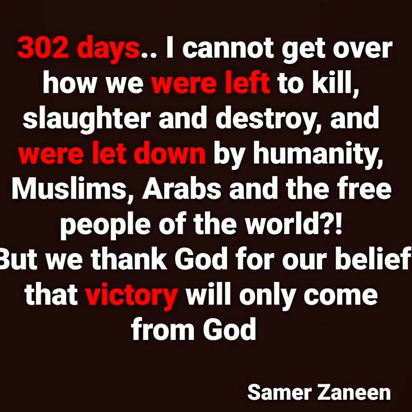 302 days.. I cannot get over how we were left to kill, slaughter, and destroy, and were let down by humanity, Muslims, Arabs, and the free people of the world?! But we thank God for our belief that victory will only come from God 302 يوم .. لا أستيطع أن أتخطى كيف تُركنا نقتل ونذبح وندمر، وخُذلنا من الإنسانية و المسلمين والعرب وأحرار العالم؟! ولكن نحمد الله على إيماننا بإن النصر لن يأتي إلا من عند الله