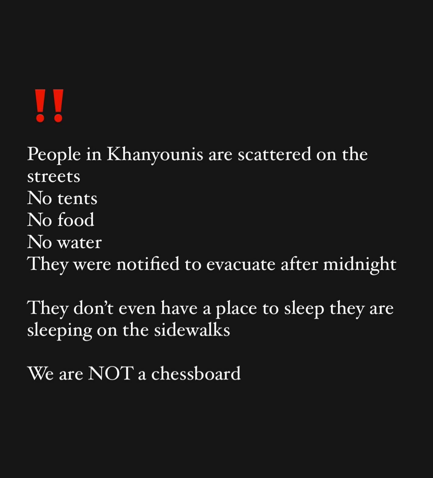 People in Khanyounis are scattered on the streets No tents No food No water They were notified to evacuate after midnight They don't even have a place to sleep they are sleeping on the sidewalks We are NOT a chessboard @hindkhoudary