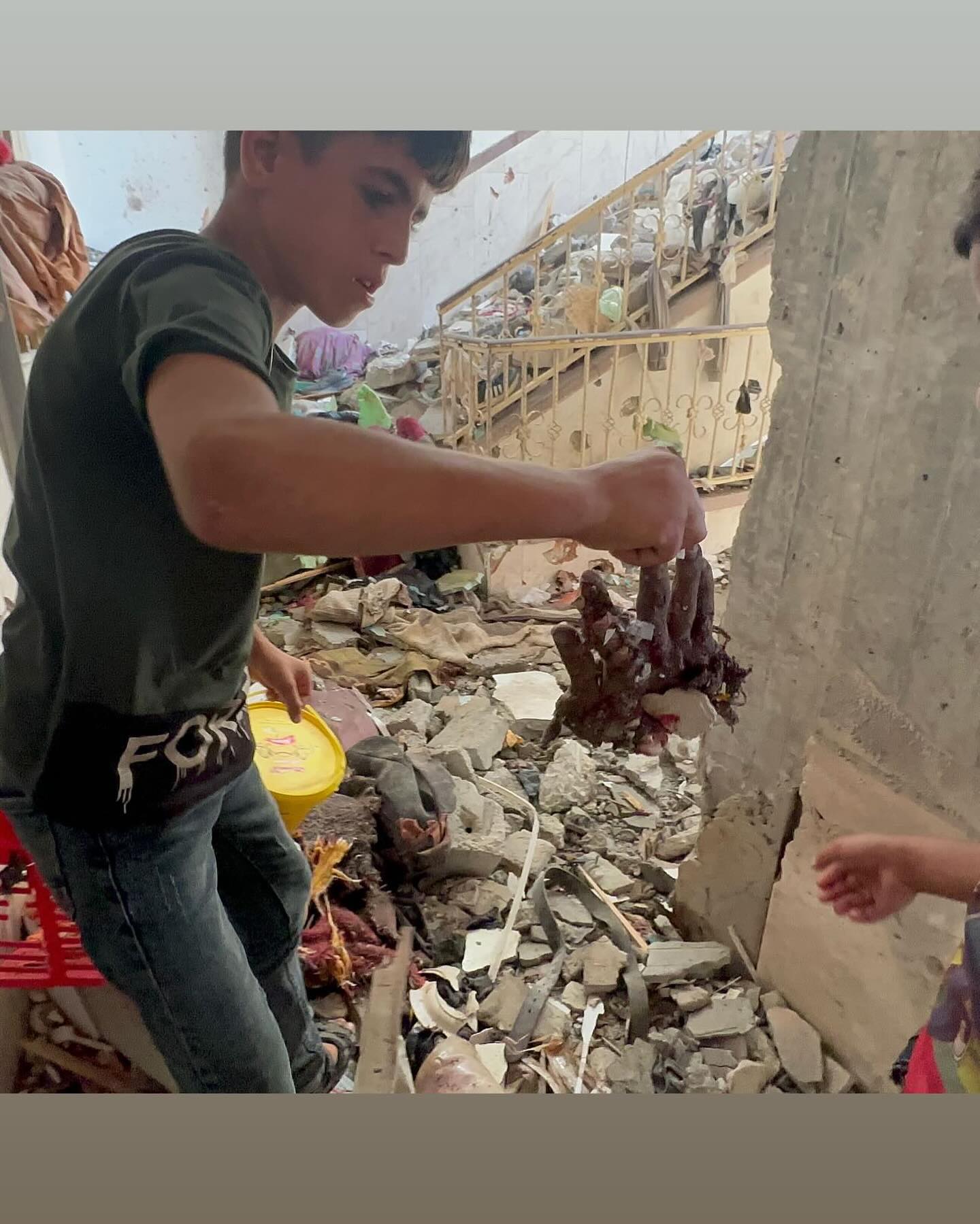 هذا مواطن من عائلة ابو جامع توجه مع مجموعة من أقاربه وقاموا بجمع أشلاء ملقاه خارج المنزل المدمر في عبسان الكبيرة ولم يتمكنوا من فعل شيء آخر فقط أشلاء وليش ٤ أشخاص