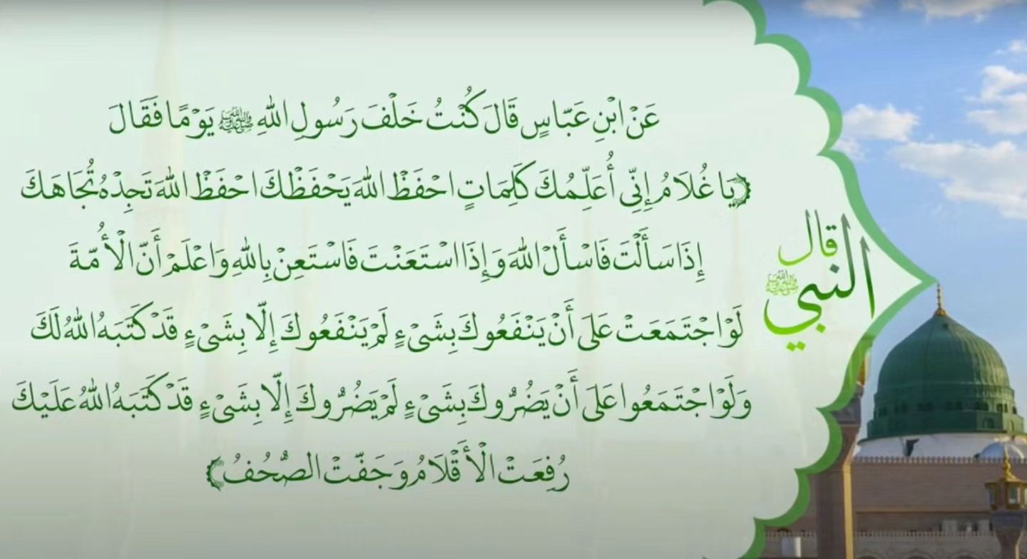 قال رَسُولِ اللَّهِ ﷺ «يَا غُلَامُ إِنِّي أُعَلِّمُكَ كَلِمَاتٍ احْفَظْ اللَّهَ يَحْفَظْكَ احْفَظْ اللَّهَ تَجِدْهُ تُجَاهَكَ إِذَا سَأَلْتَ فَاسْأَلْ اللَّهَ وَإِذَا اسْتَعَنْتَ فَاسْتَعِنْ بِاللَّهِ وَاعْلَمْ أَنَّ الْأُمَّةَ لَوْ اجْتَمَعَتْ عَلَى أَنْ يَنْفَعُوكَ بِشَيْءٍ لَمْ يَنْفَعُوكَ إِلَّا بِشَيْءٍ قَدْ كَتَبَهُ اللَّهُ لَكَ وَلَوْ اجْتَمَعُوا عَلَى أَنْ يَضُرُّوكَ بِشَيْءٍ لَمْ يَضُرُّوكَ إِلَّا بِشَيْءٍ قَدْ كَتَبَهُ اللَّهُ عَلَيْكَ رُفِعَتْ الْأَقْلَامُ وَجَفَّتْ الصُّحُفُ».رواه الترمذي