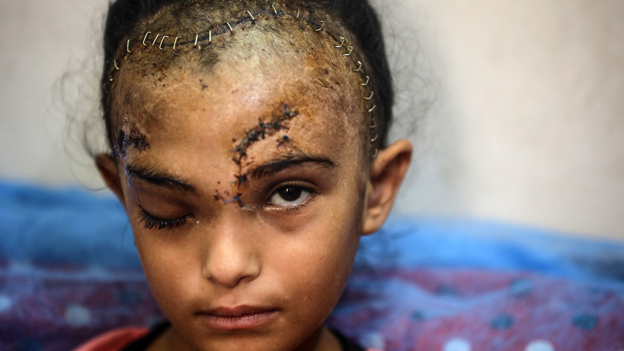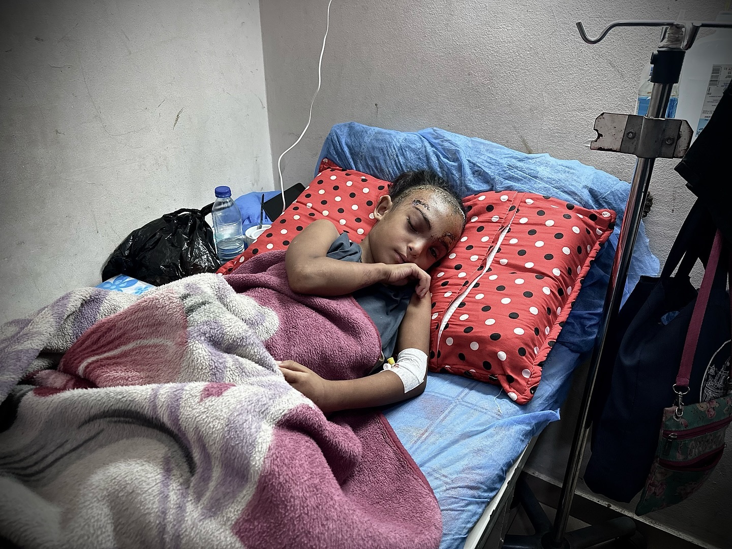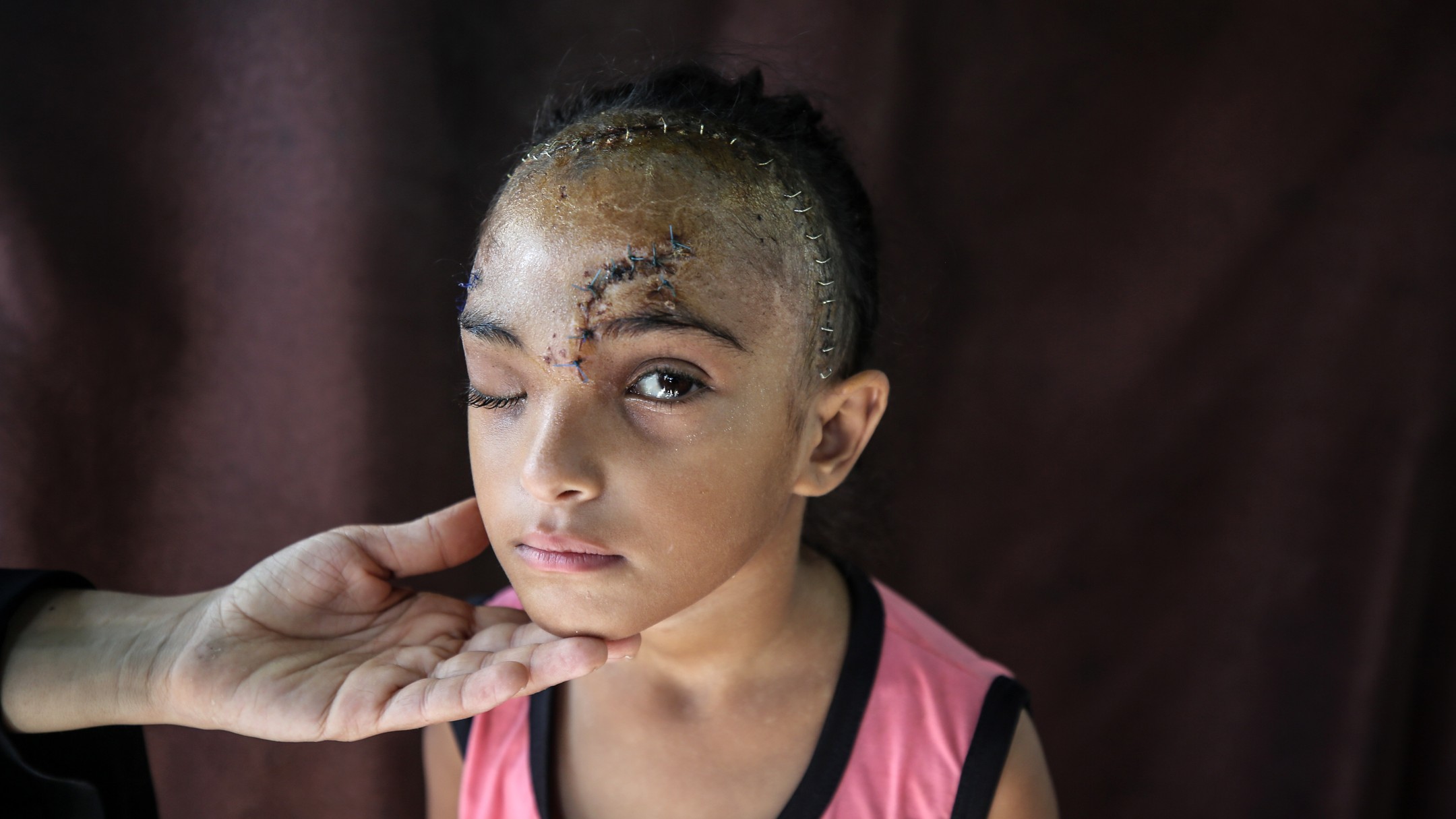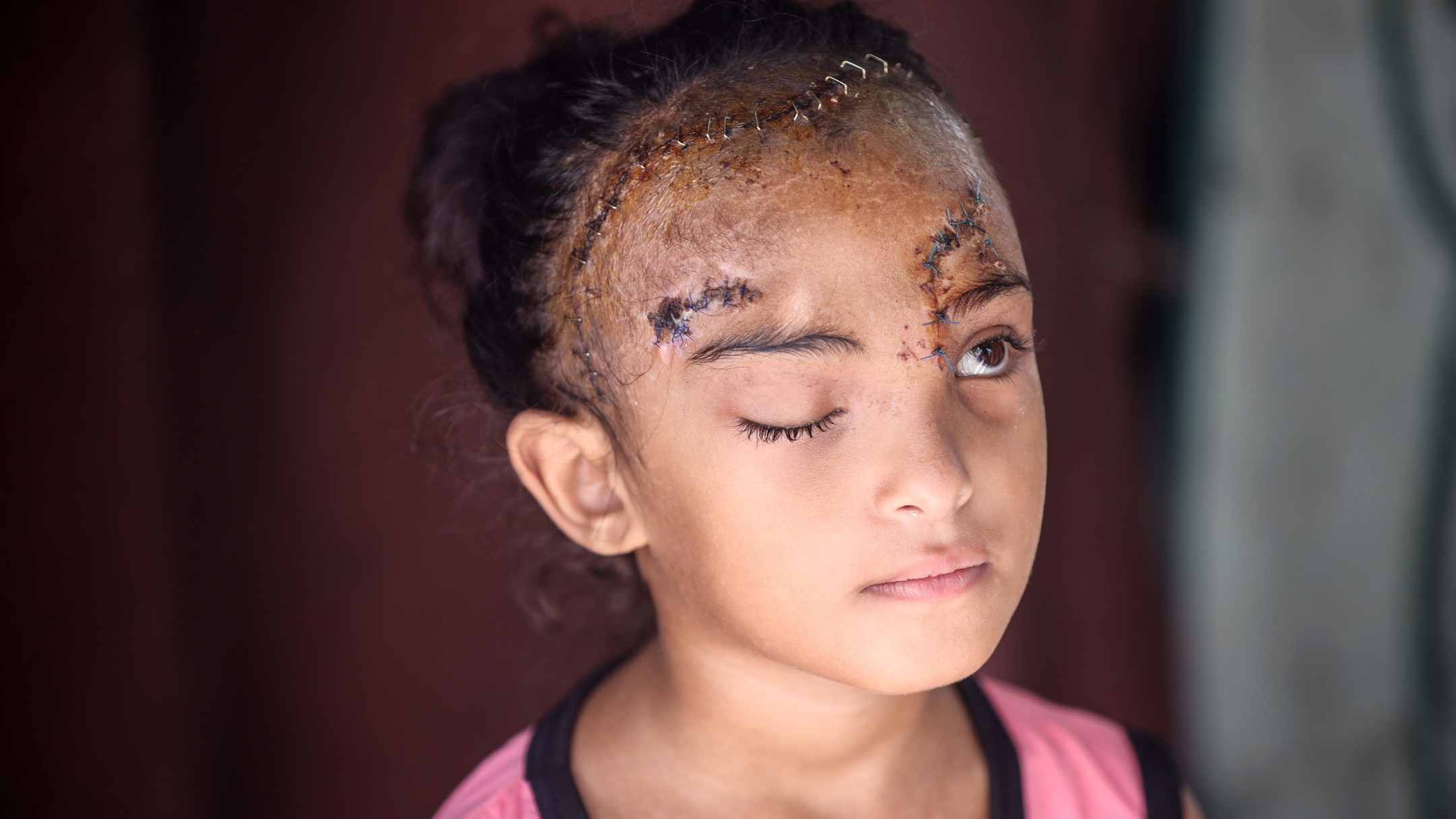 Sila Hoso (7), a displaced Palestinian girl from Gaza city to Deir al-Balah. She was injured in an Israeli bombing on the Khadija School in Deir al-Balah. Sila suffers from a fractured skull, a tear in her retina, and distorted vision. She demands to go abroad to receive urgent medical treatment. photo by majdi fdathi