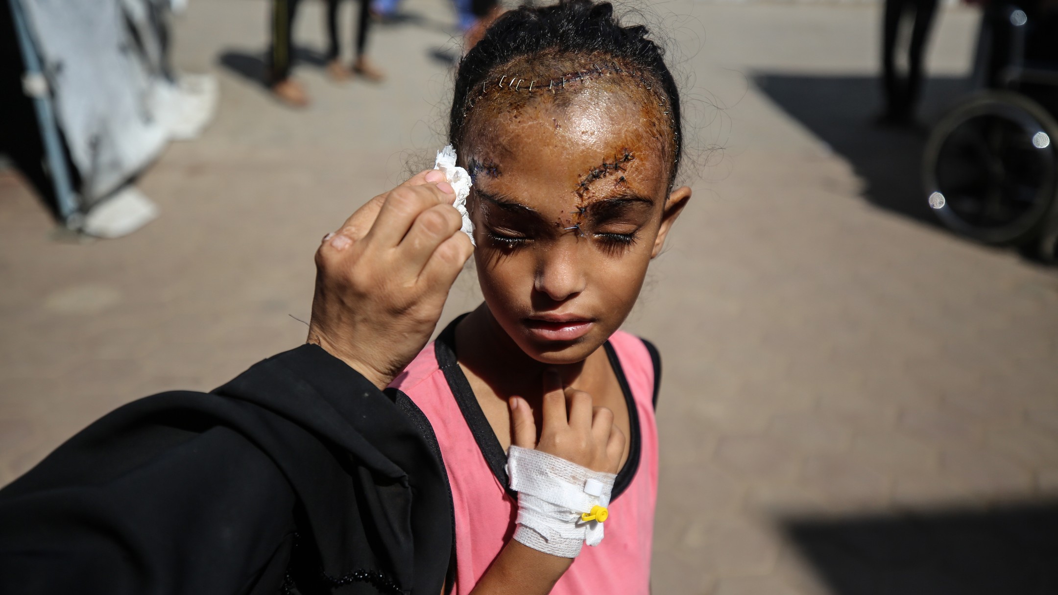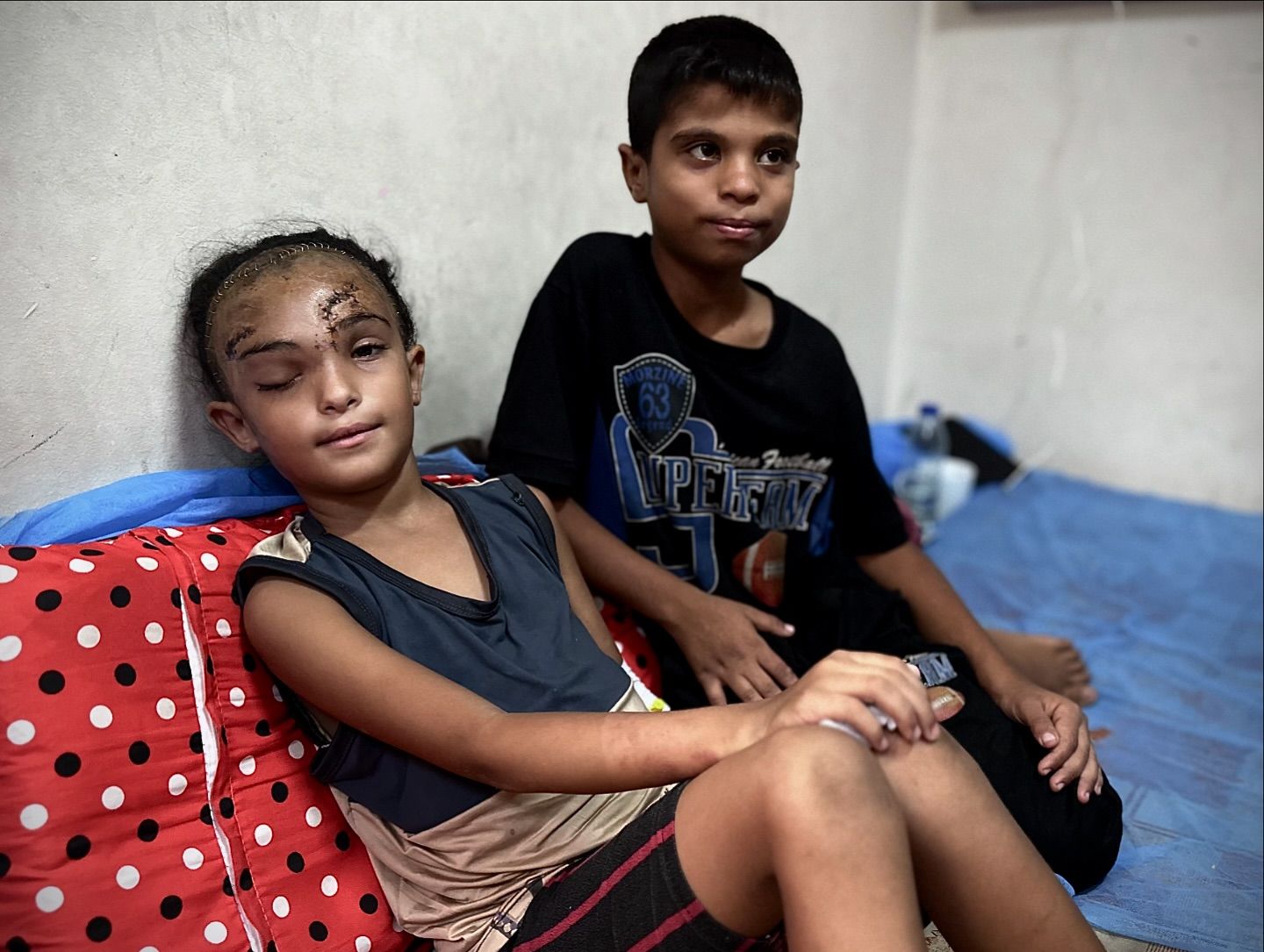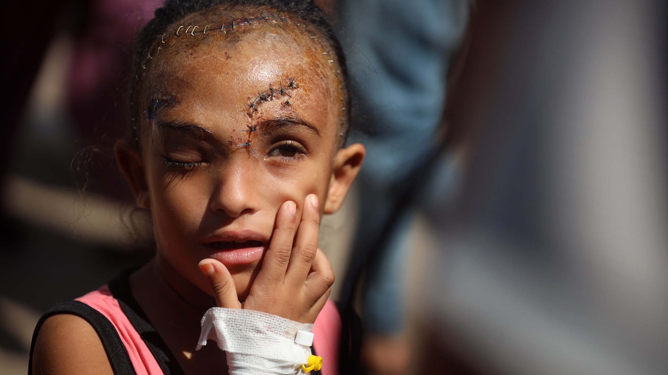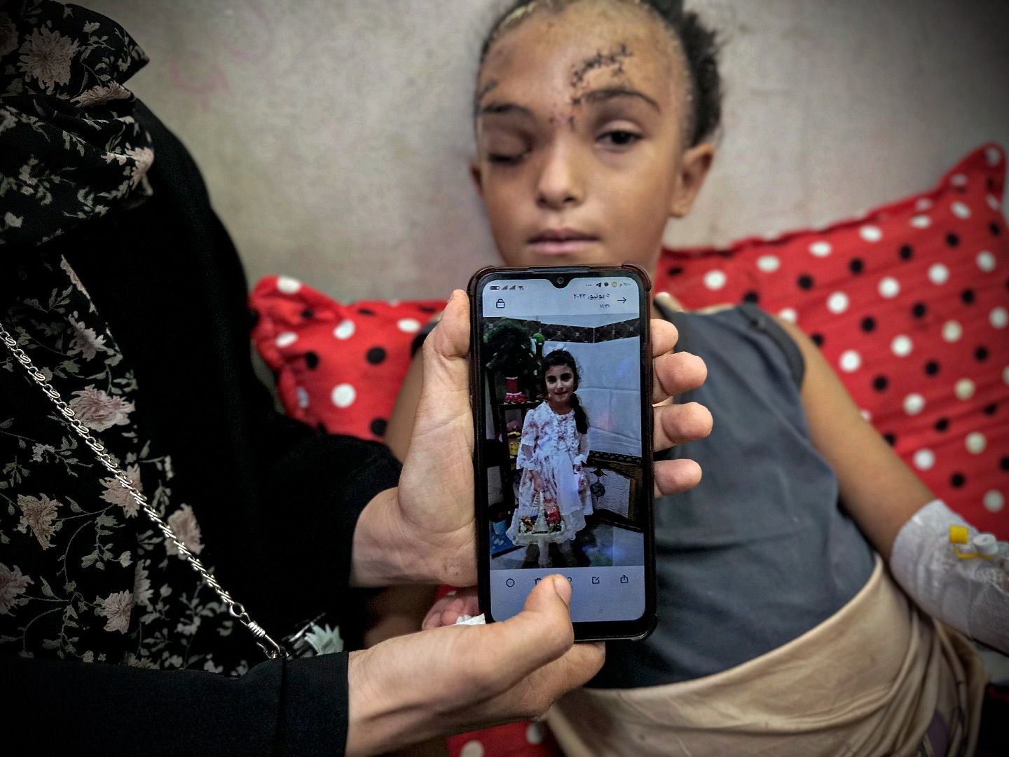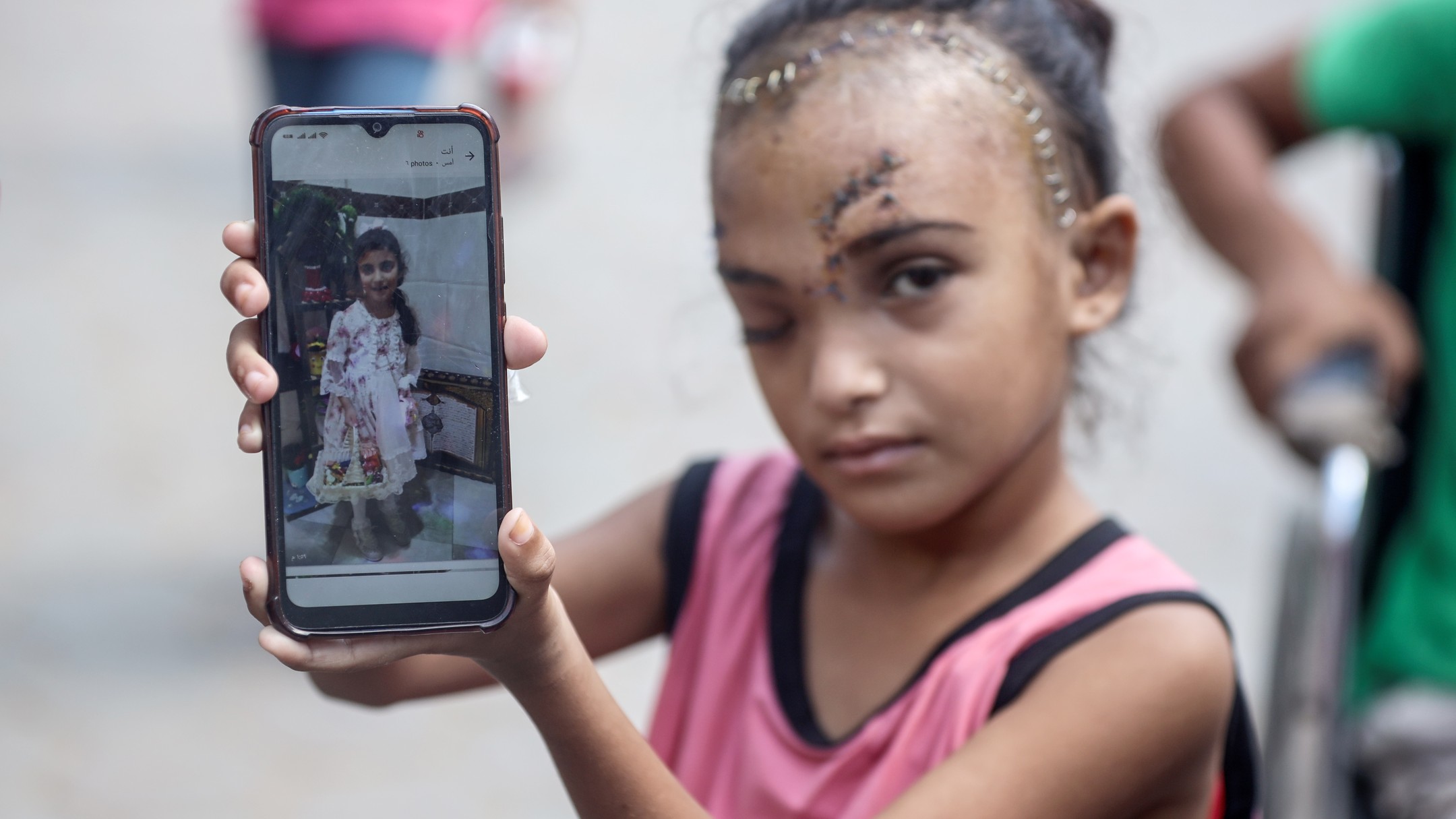 Sila Hoso (7), a displaced Palestinian girl from Gaza city to Deir al-Balah. She was injured in an Israeli bombing on the Khadija School in Deir al-Balah. Sila suffers from a fractured skull, a tear in her retina, and distorted vision. She demands to go abroad to receive urgent medical treatment. photo by majdi fdathi