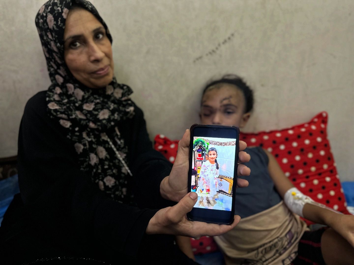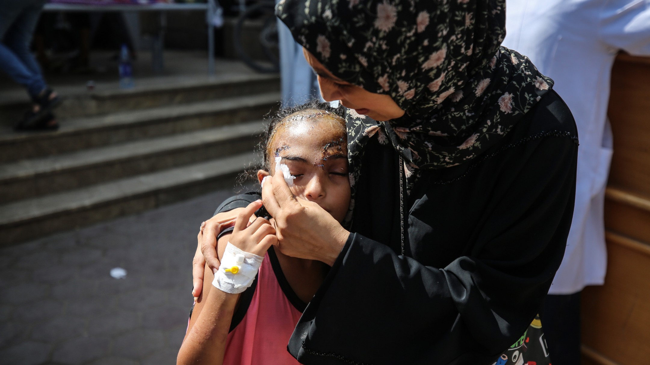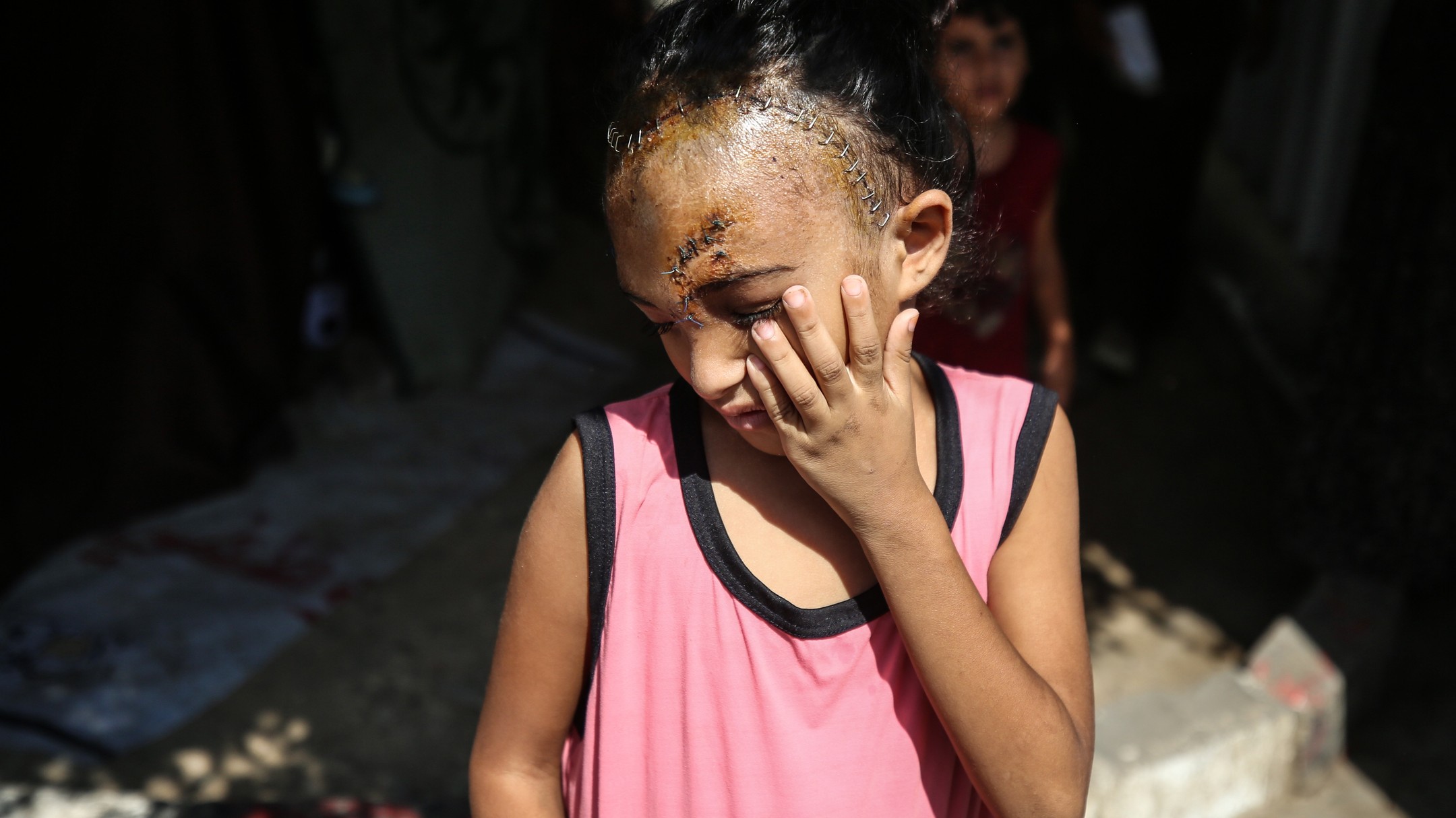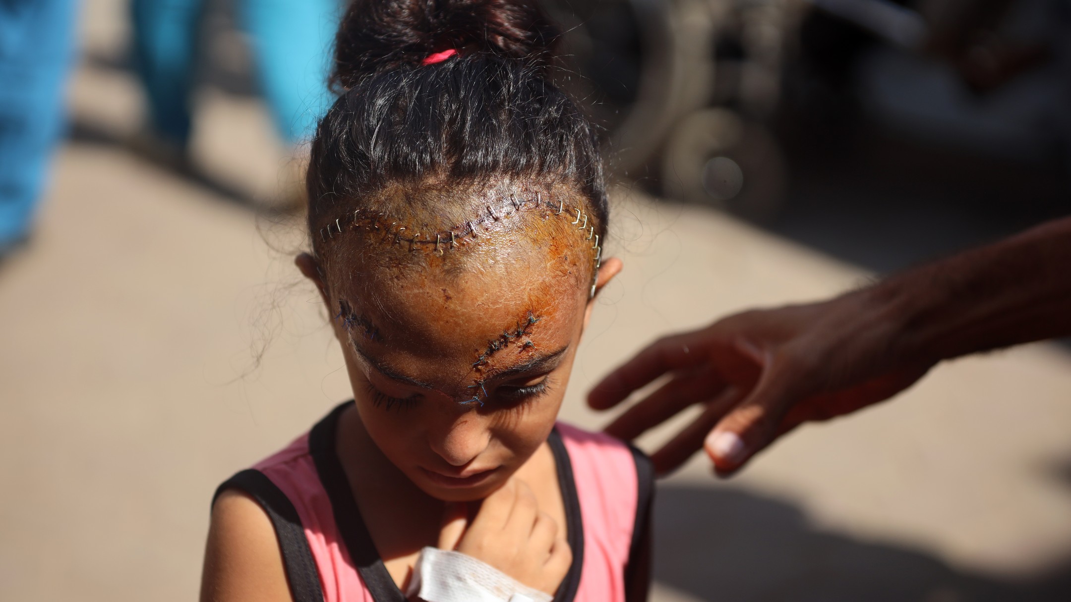 Sila Hoso (7), a displaced Palestinian girl from Gaza city to Deir al-Balah. She was injured in an Israeli bombing on the Khadija School in Deir al-Balah. Sila suffers from a fractured skull, a tear in her retina, and distorted vision. She demands to go abroad to receive urgent medical treatment. photo by majdi fdathi