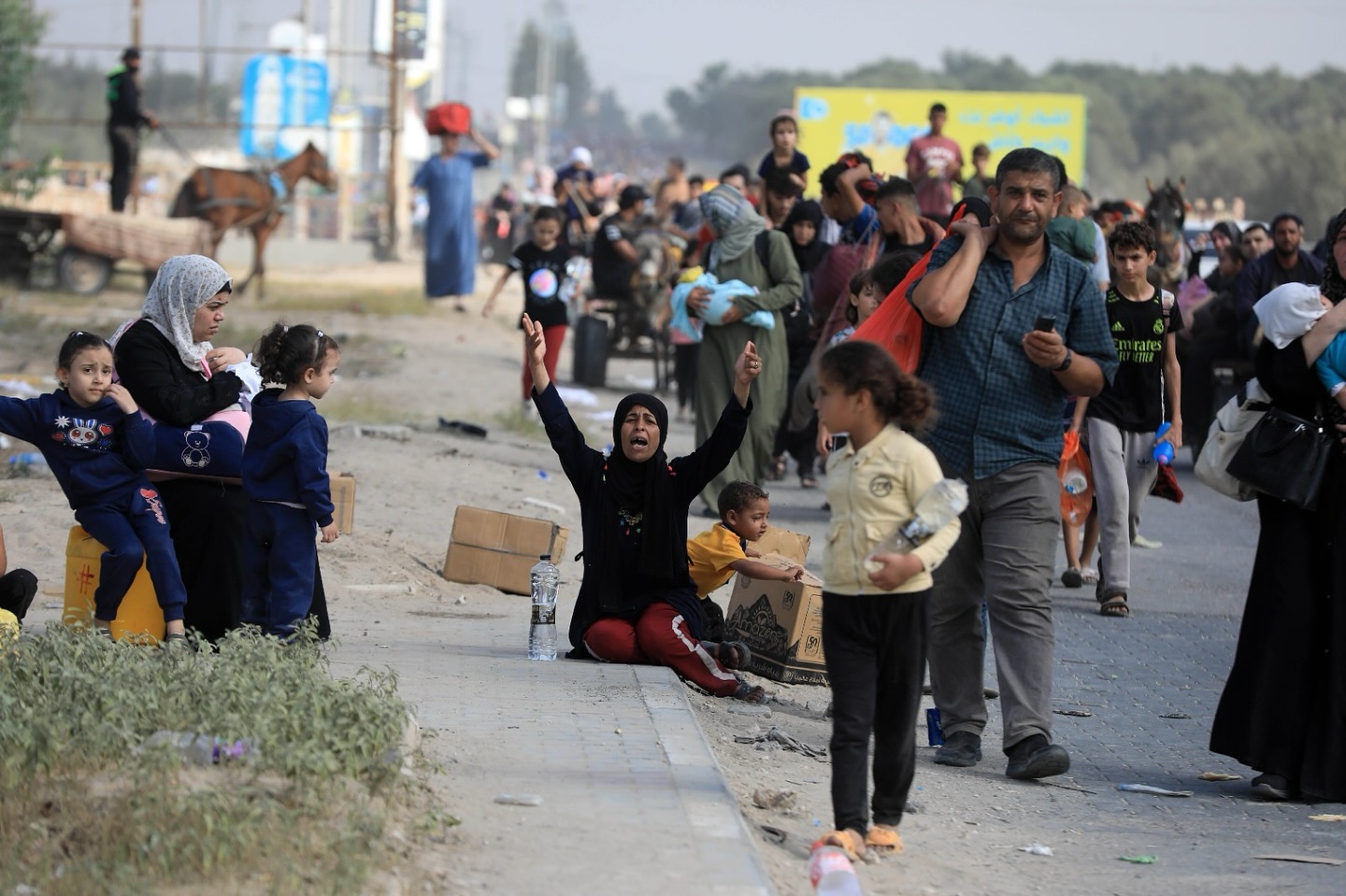 A Palestinian woman screams in exhaustion after repeated displacement due to military operations inside the Gaza Strip. Photo /Yasser Qudih سيدة فلسطينية تصرخ من التعب بعد تكرار عمليه النزوح بسبب العمليات العسكرية داخل قطاع غزة تصوير/ياسر قديح