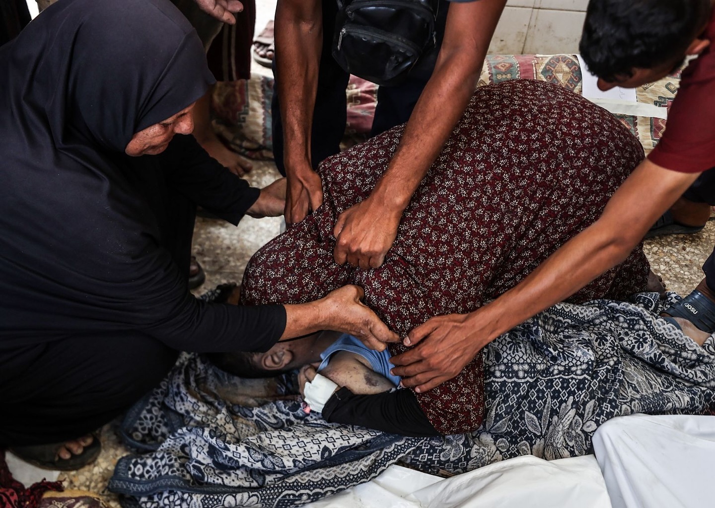 Relatives of the Palestinian children who lost their lives as a result of an Israeli attack, mourn as the bodies are brought to the morgue of Al-Aqsa Martyrs Hospital in Deir al Balah, Gaza. (Photo by Ali Jadallah/Anadolu via Getty Images)