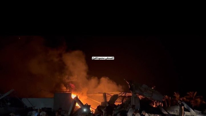 Israeli warplanes bomb a residential building in the Nusairat refugee camp, central Gaza Strip. قصف بناية سكنية في مخيم النصيرات وسط قطاع غزة