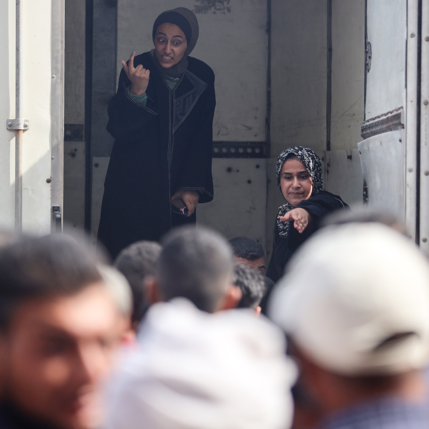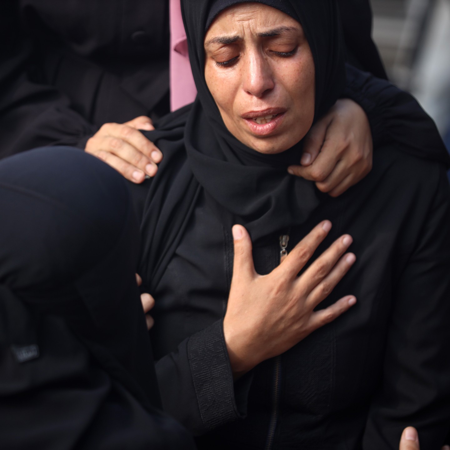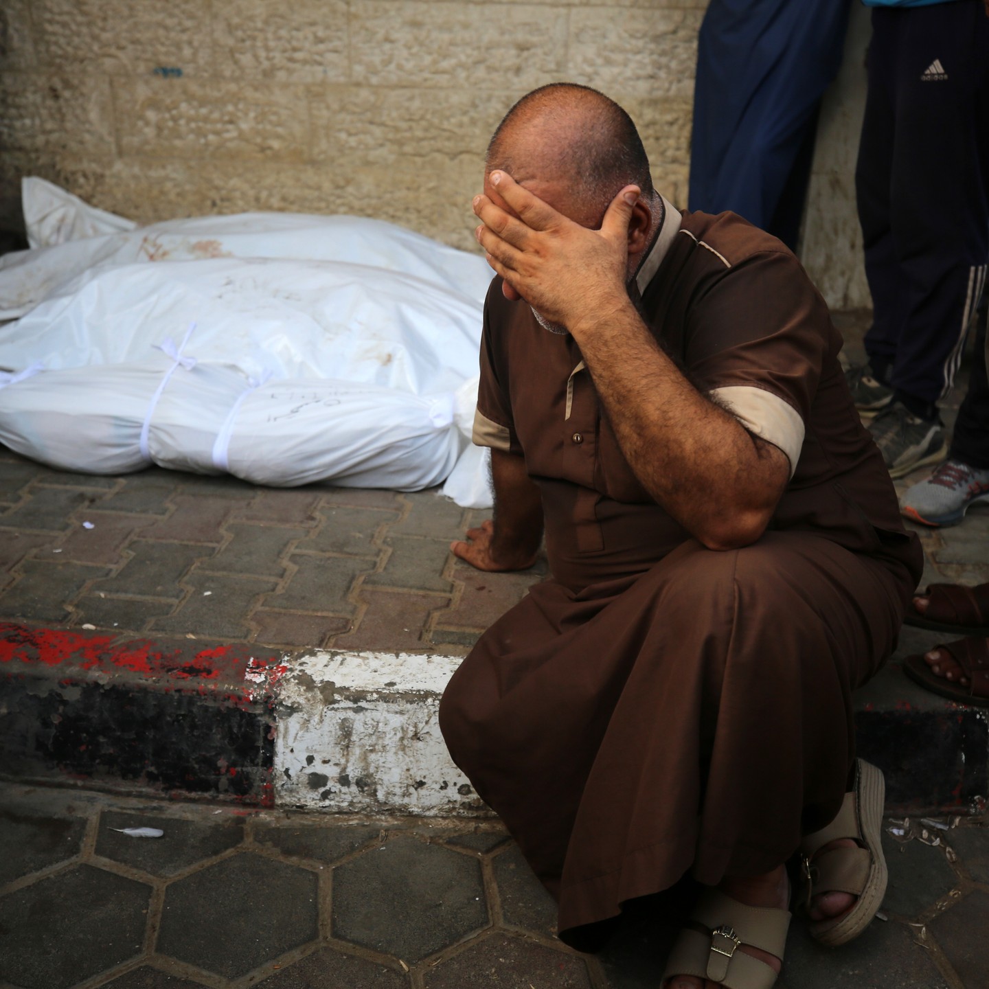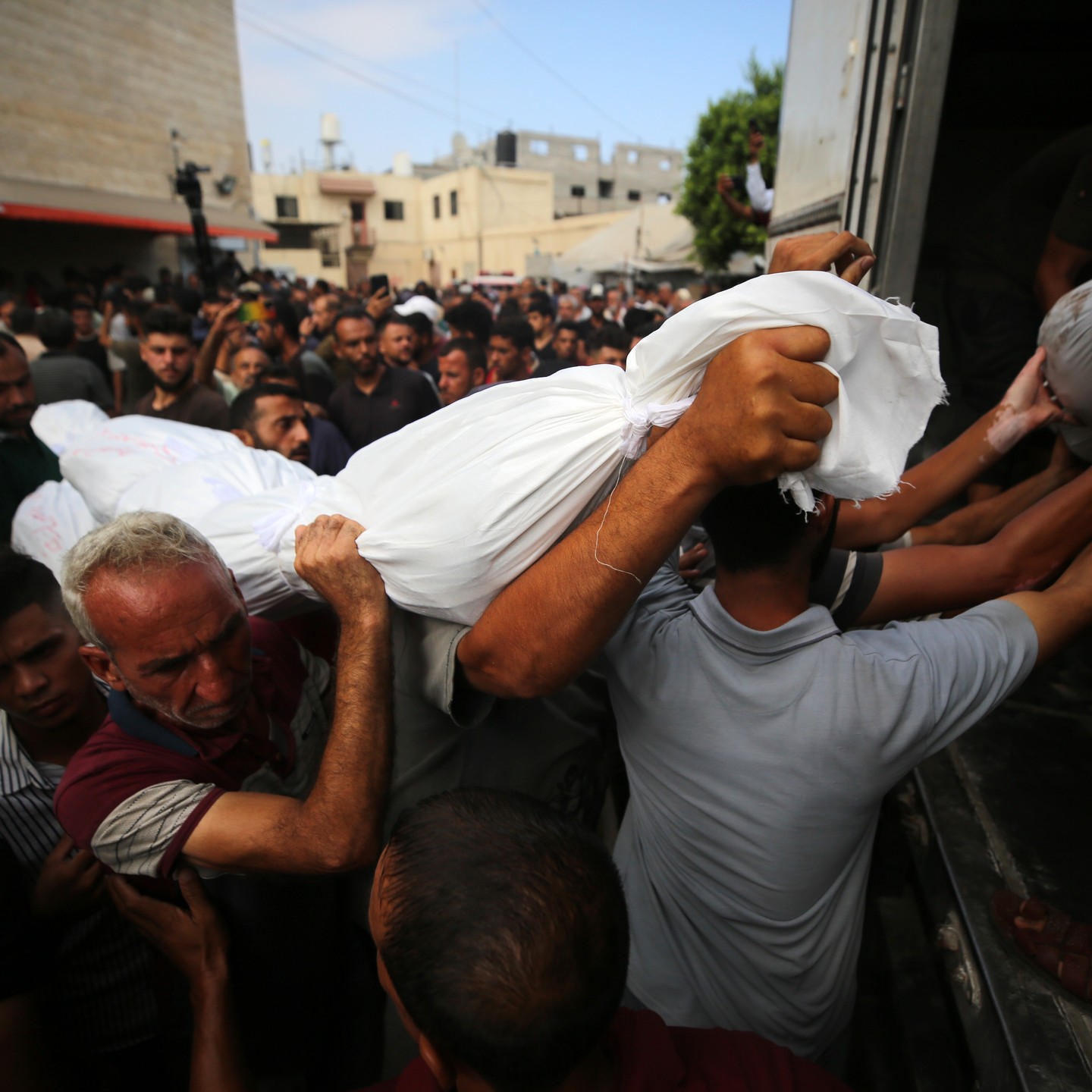 Relatives of Palestinians, who lost their lives in Israeli attacks over Az-Zawayda district, mourn after dead bodies brought to the morgue of the Al-Aqsa Martyrs Hospital in Deir al-Balah, Gaza on August 17, 2024. (Photo by Ali Jadallah/Anadolu via Getty Images
