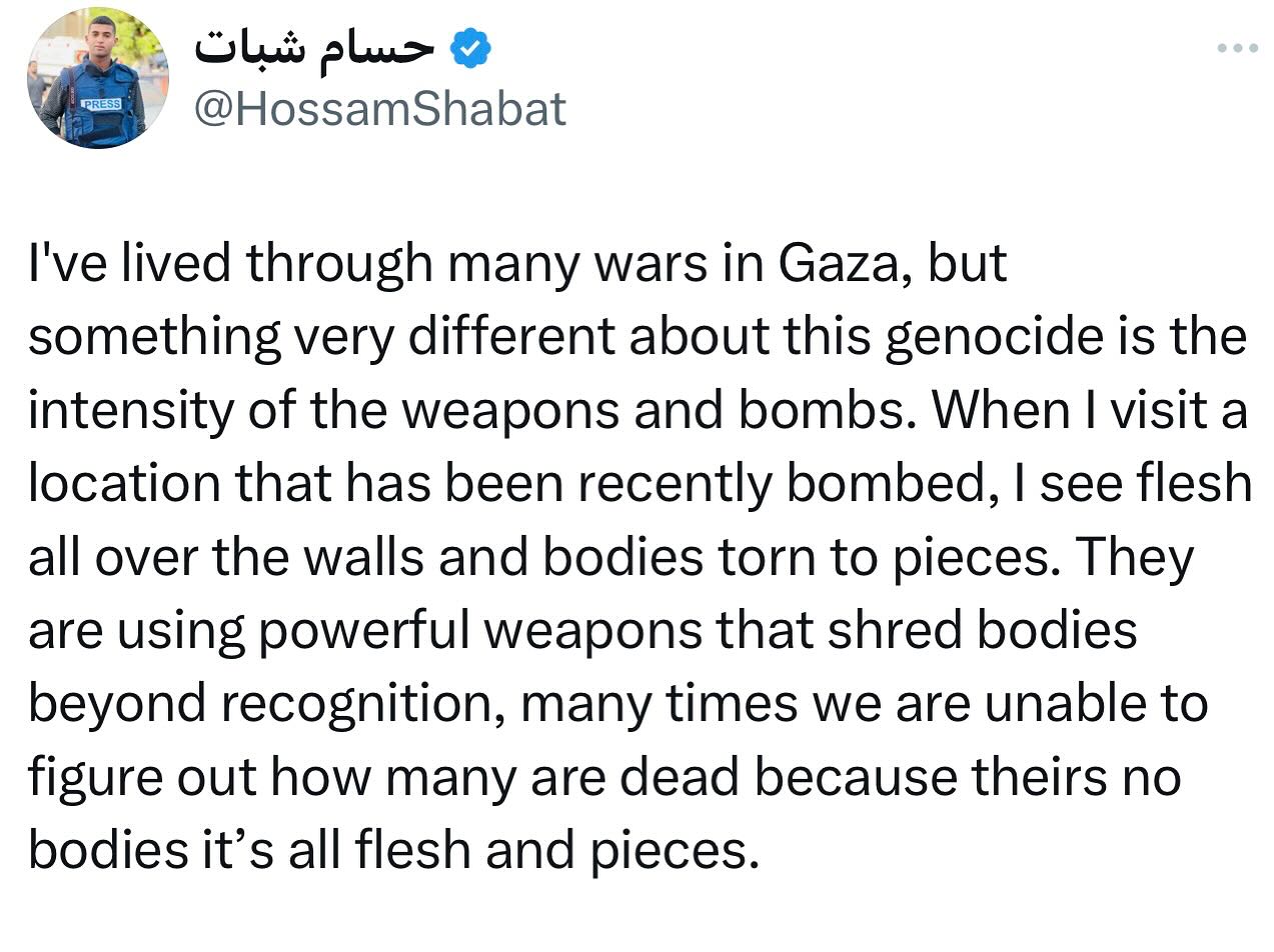 I’ve lived through many wars in Gaza, but something very different about this genocide is the intensity of the weapons and bombs. When I visit a location that has been recently bombed, I see flesh all over the walls and bodies torn to pieces. They are using powerful weapons that shred bodies beyond recognition, many times we are unable to figure out how many are dead because theirs no bodies it’s all flesh and pieces.