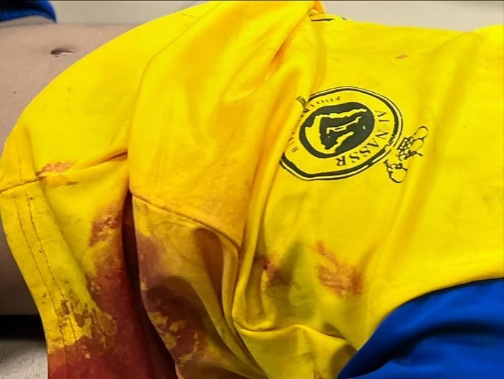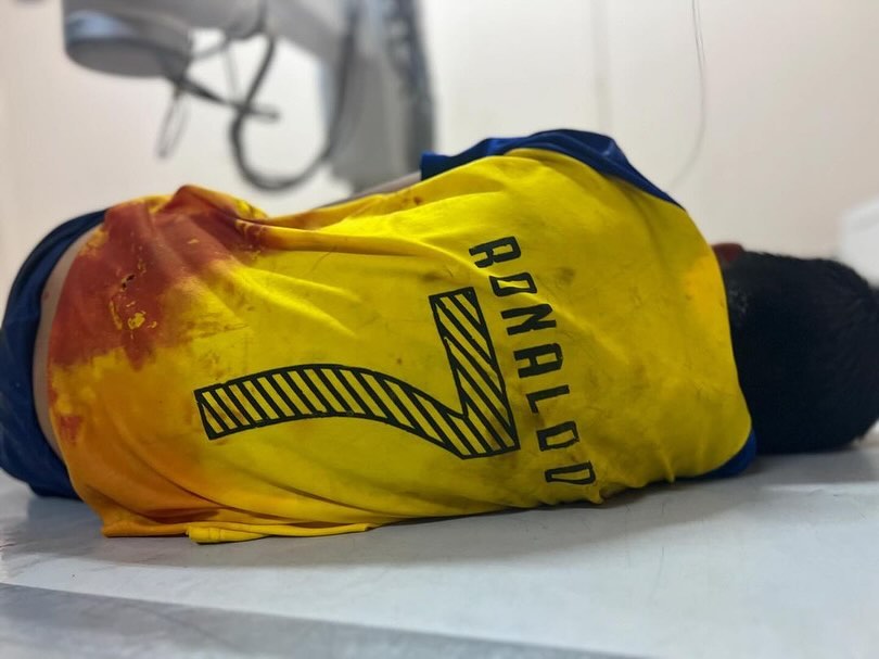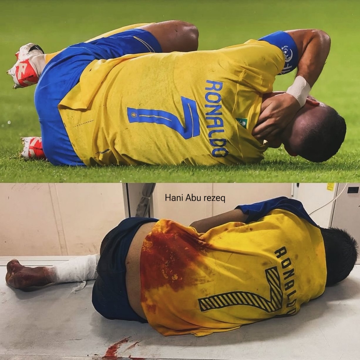 كان الطفل كريم يرتدي ملابس كريستيانو الرياضية، وقد أصبح القميص الممزق المليئة بالدماء جزءًا من قصة لم تكتمل. رغم جراحه التي سالت نتيجة قصف مجاور لمنزله بمدينة دير البلح ، كان يتمسك بالقميص، هكذا هم أطفال غزة لا تكتمل مباريات القدم بالنسبة لهم تنتهي المباراة بشه.يد أو مصاب تصوير هاني ابورزق #stop_the_war