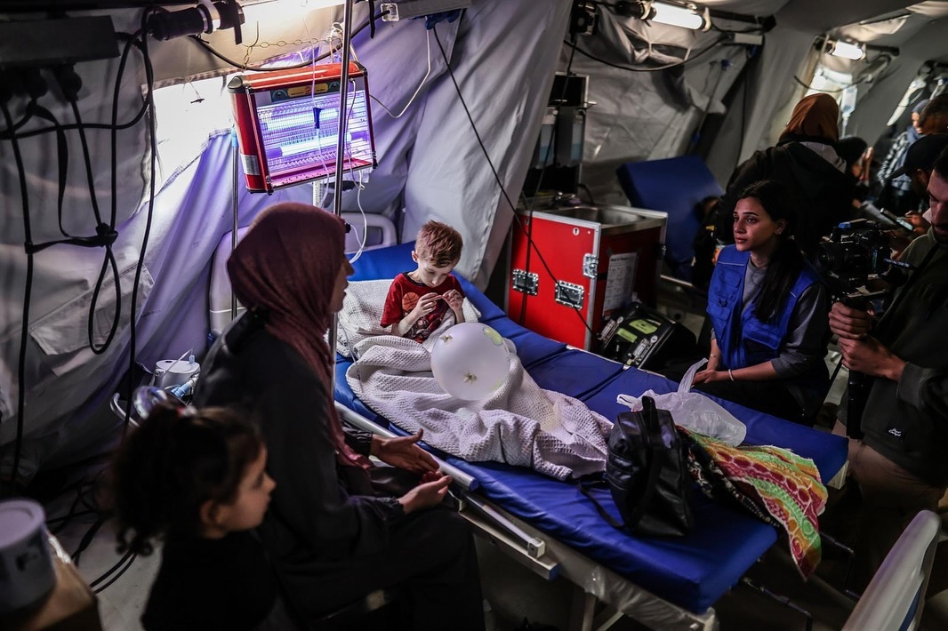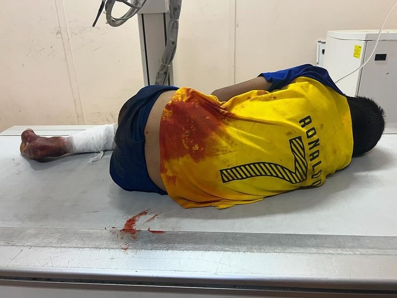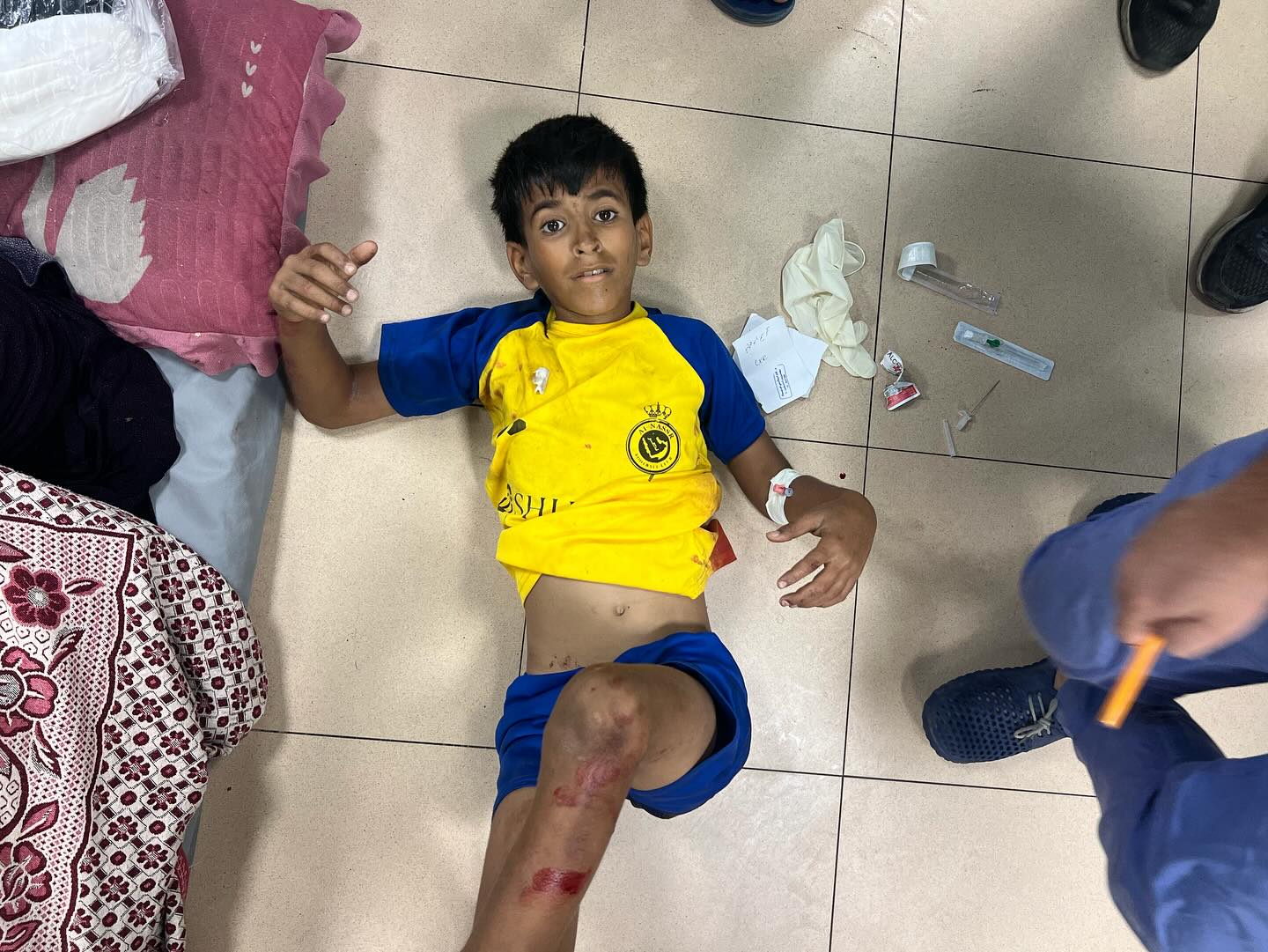 The child Kareem Abu Houli (13) was injured whilst playing football near his neighbor’s which was bombed by Israeli warplanes in Deir Al Balah, central Gaza. By @hani.aburezeq الطفل كريم ابو هولي اصيب في قصف منزل جيرانه اثناء لعب كرة القدم في دير البلح وسط القطاع