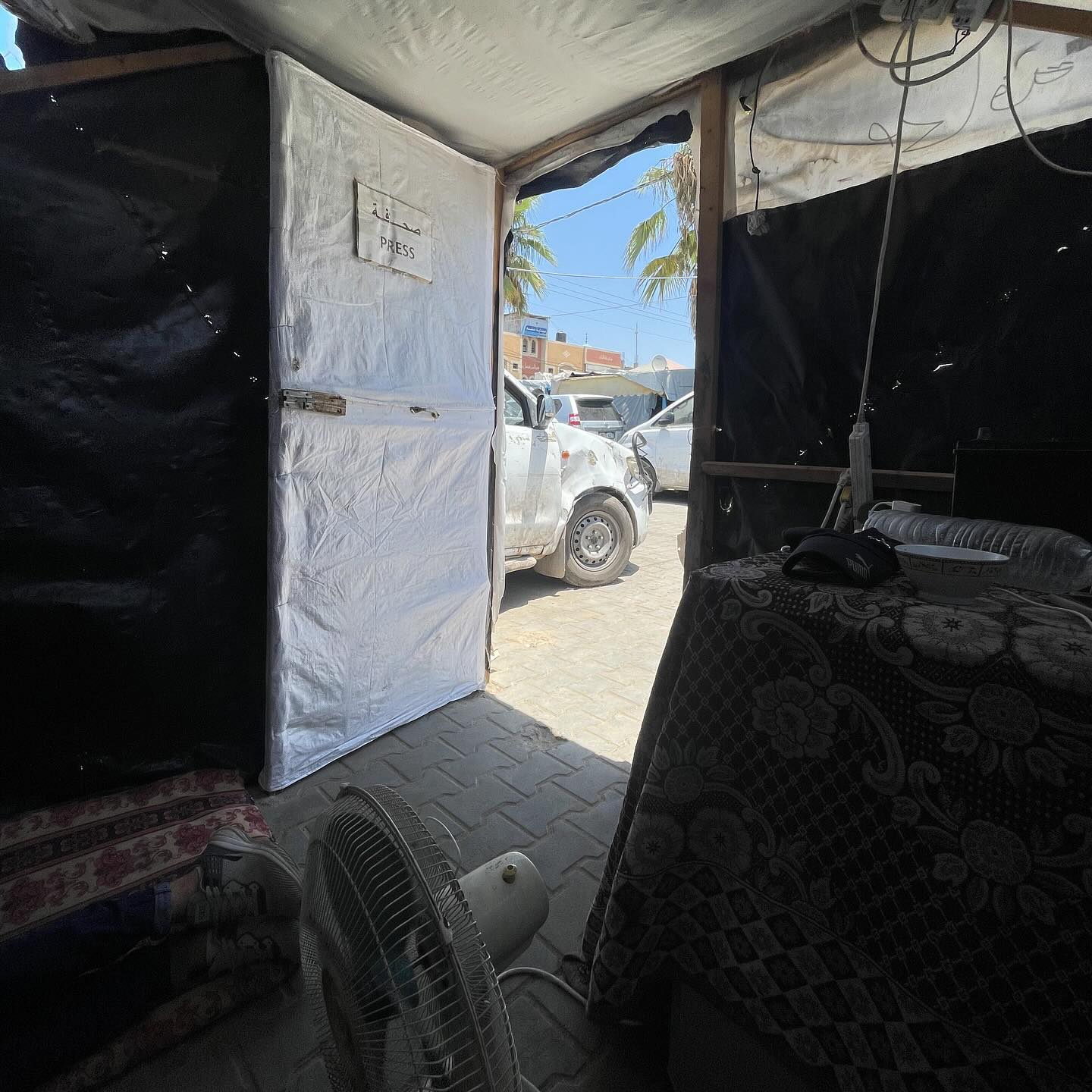 لحظة وصول الشه.يد الصديق الصحفي إبراهيم محارب إلى مستشفى ناصر بعد العثور على جثمانه في مدنية حمد فقد اثر إبراهيم يوم امس نتيجة استهداف مجموعة من الصحفيين اثناء التغطية