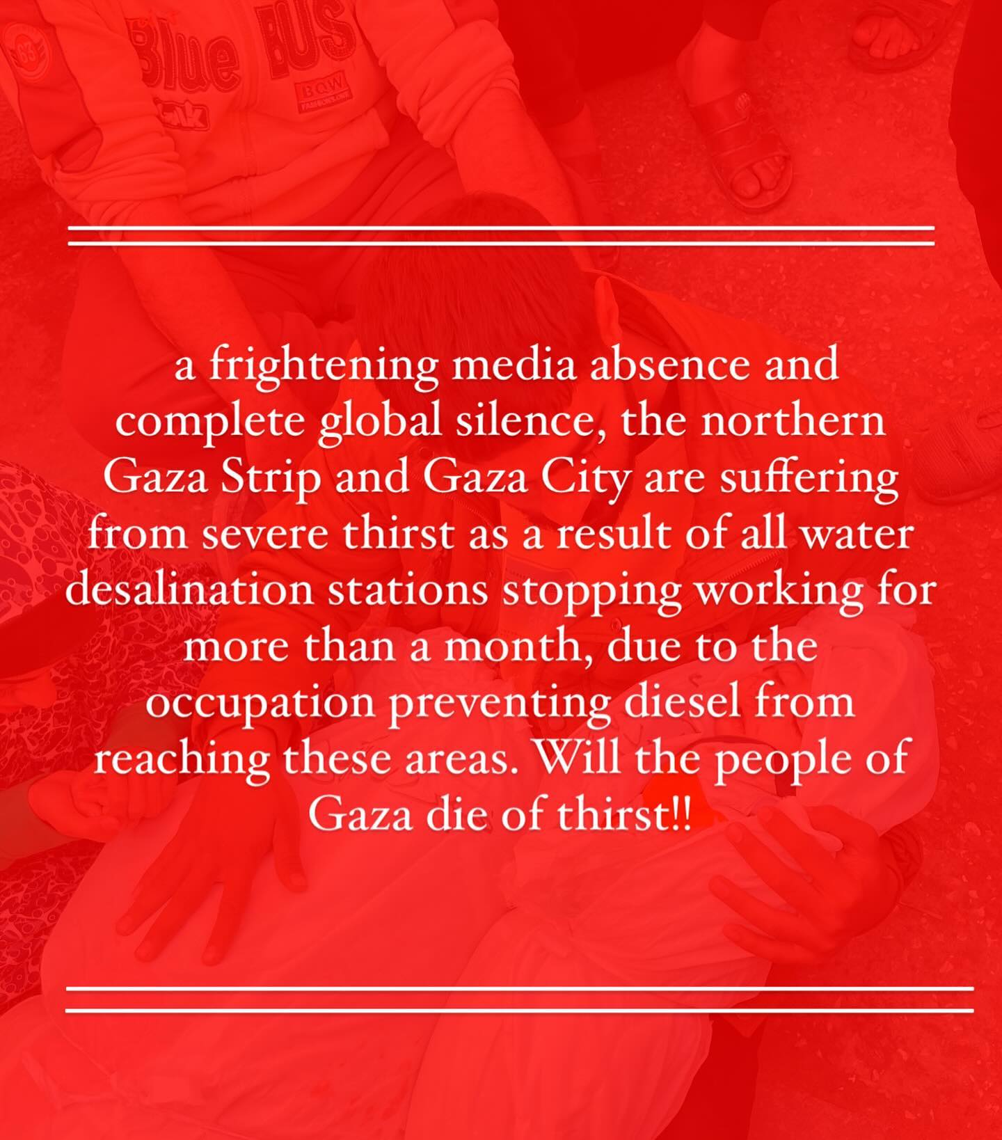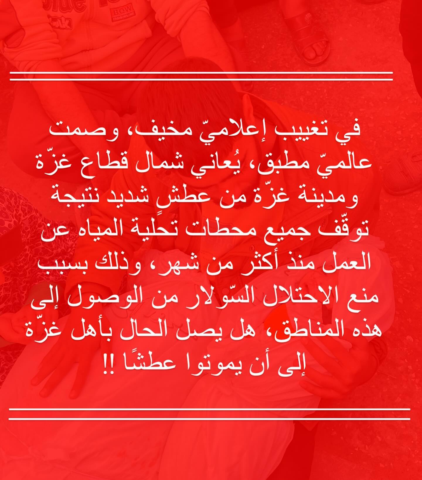 a frightening media absence and complete global silence, the northern Gaza Strip and Gaza City are suffering from severe thirst as a result of all water desalination stations stopping working for more than a month, due to the occupation preventing diesel from reaching these areas. Will the people of Gaza die of thirst!!