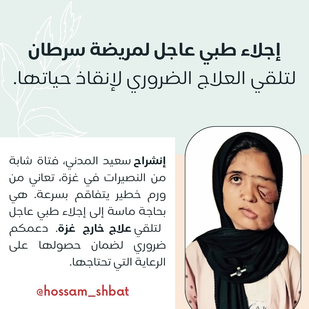 Urgent medical evacuation needed for Inshirah, a cancer patient‼️ Inshirah Saeed Al-Madani, a young girl from Nusirat, Gaza, is battling a critical tumor that is worsening rapidly. She urgently needs medical evacuation for life-saving treatment outside Gaza. Your support is crucial to ensure she receives the care she needs. إجلاء طبي عاجل لمريضة سرطان لتلقي العلاج الضروري لإنقاذ حياتها‼️ إنشراح سعيد المدني، فتاة من النصيرات في غزة، تعاني من ورم خطير يتفاقم بسرعة. هي بحاجة ماسة إلى إجلاء طبي عاجل لتلقي العلاج خارج غزة. دعمكم ضروري لضمان حصولها على الرعاية التي تحتاجها.