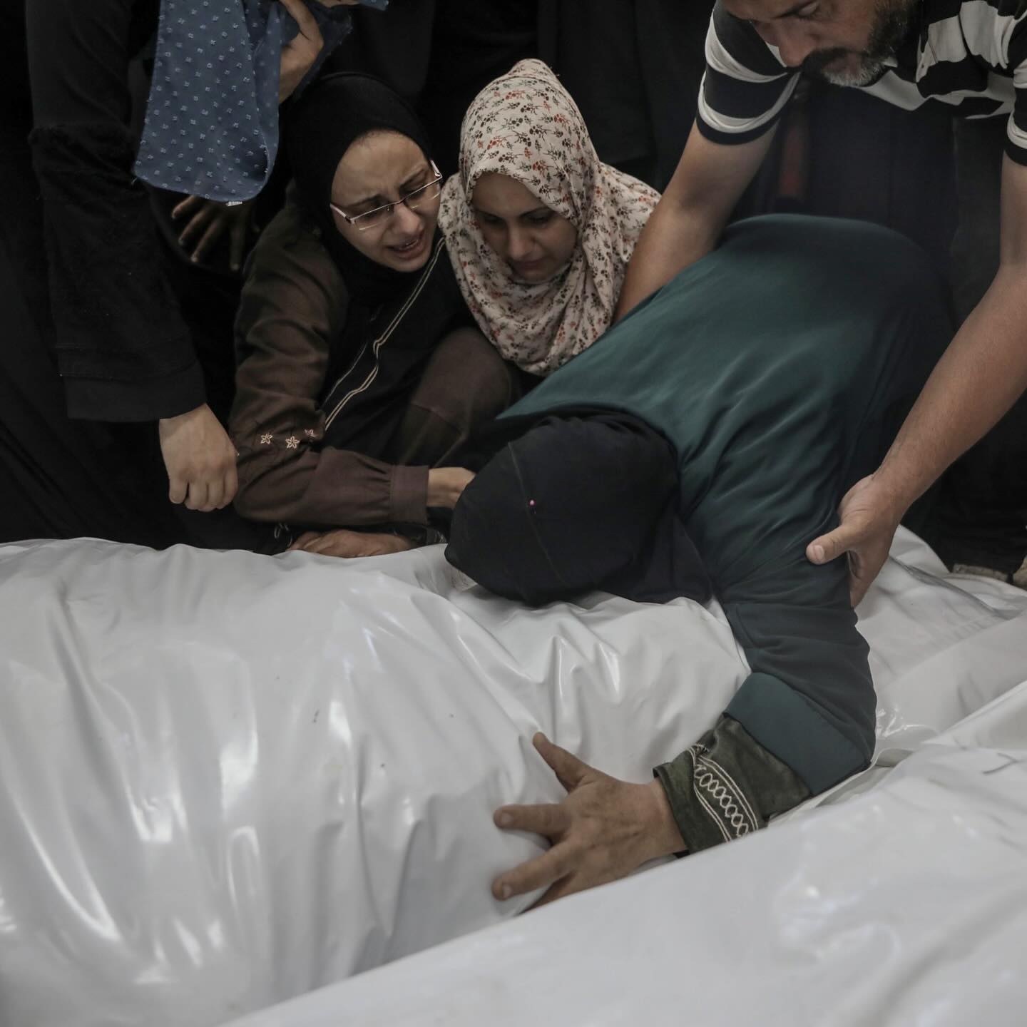 Relatives of Palestinians, who lost their lives in Israeli attacks over Az-Zawayda district, mourn after dead bodies brought to the morgue of the Al-Aqsa Martyrs Hospital in Deir al-Balah, Gaza. (Photo by Ali Jadallah/Anadolu via Getty Images)
