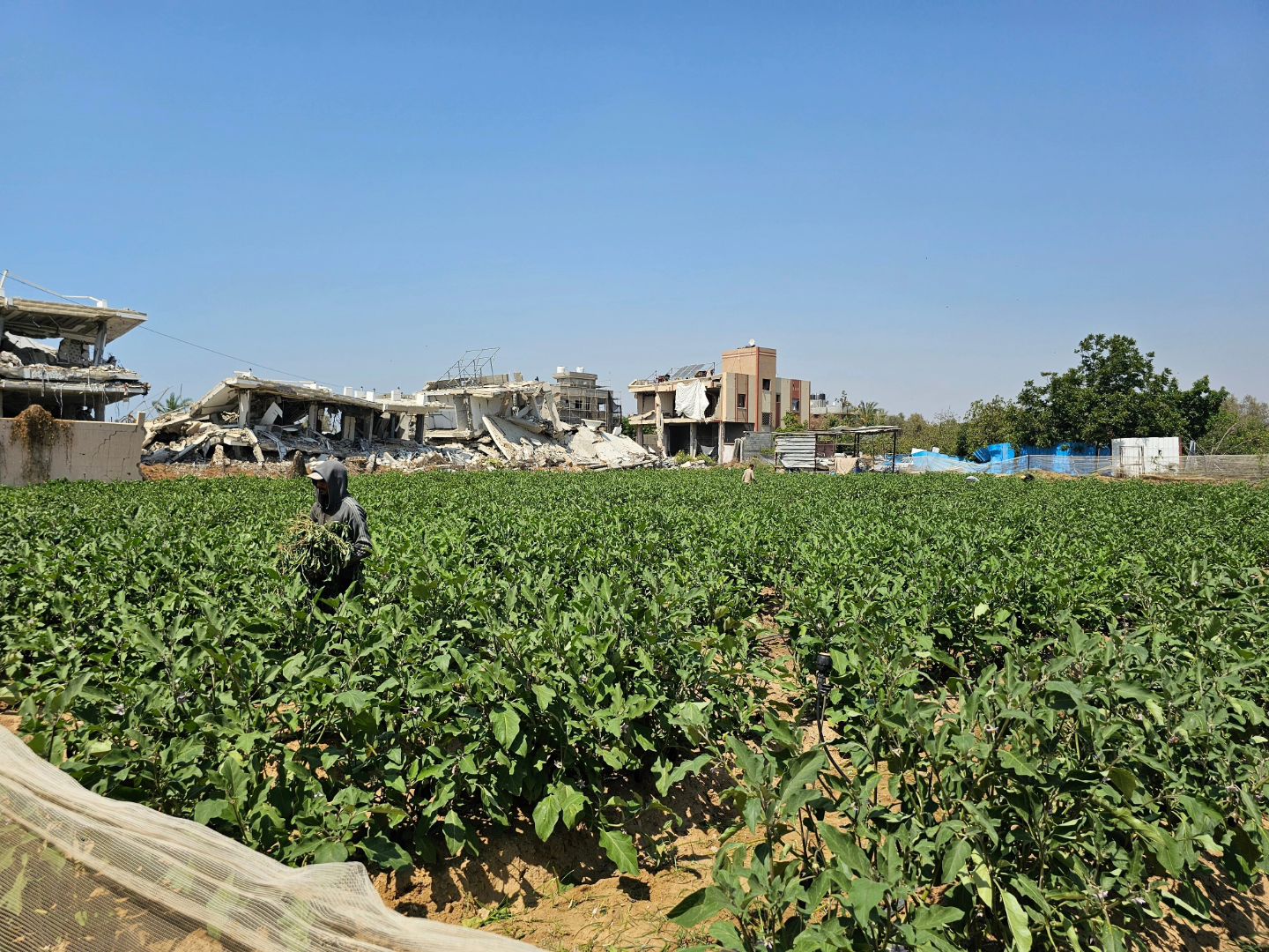 Amid the rubble and just meters away from the Israeli occupation forces' vehicles, farmers from Beit Lahia continue planting in an attempt to overcome forced starvation. بين الركام وعلى بعد أمتار من تمركز الآليات الاحتلال مزارعون من بيت لاهيا يواصلون الزرع في محاولة للتغلب على المجاعة